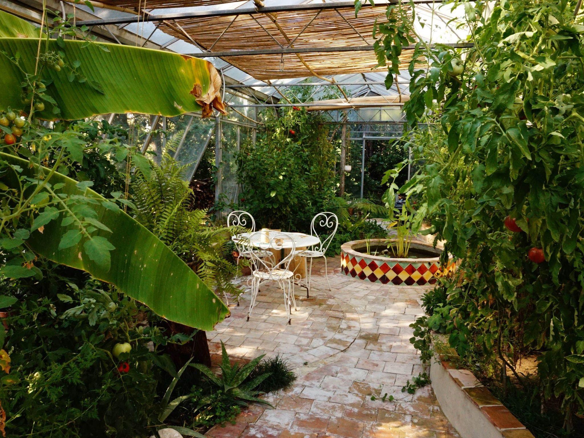 Großes Glasgewächshaus mit tropischen Pflanzen und Gemüse.