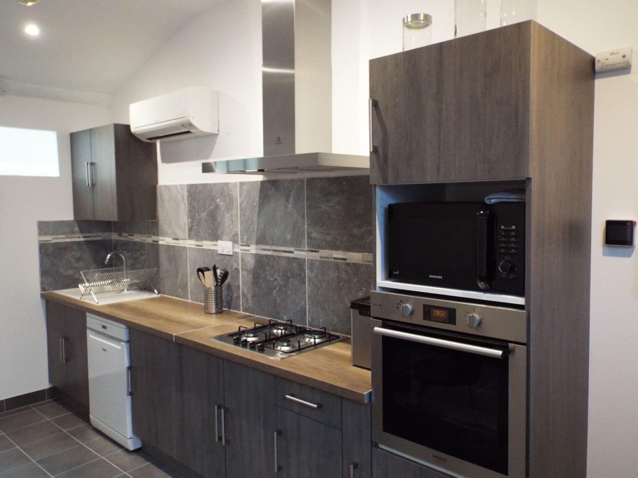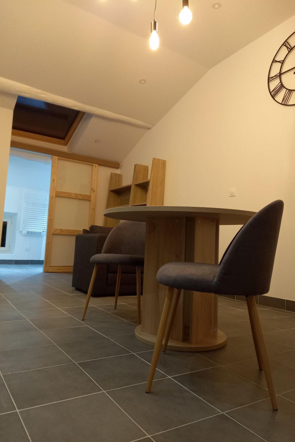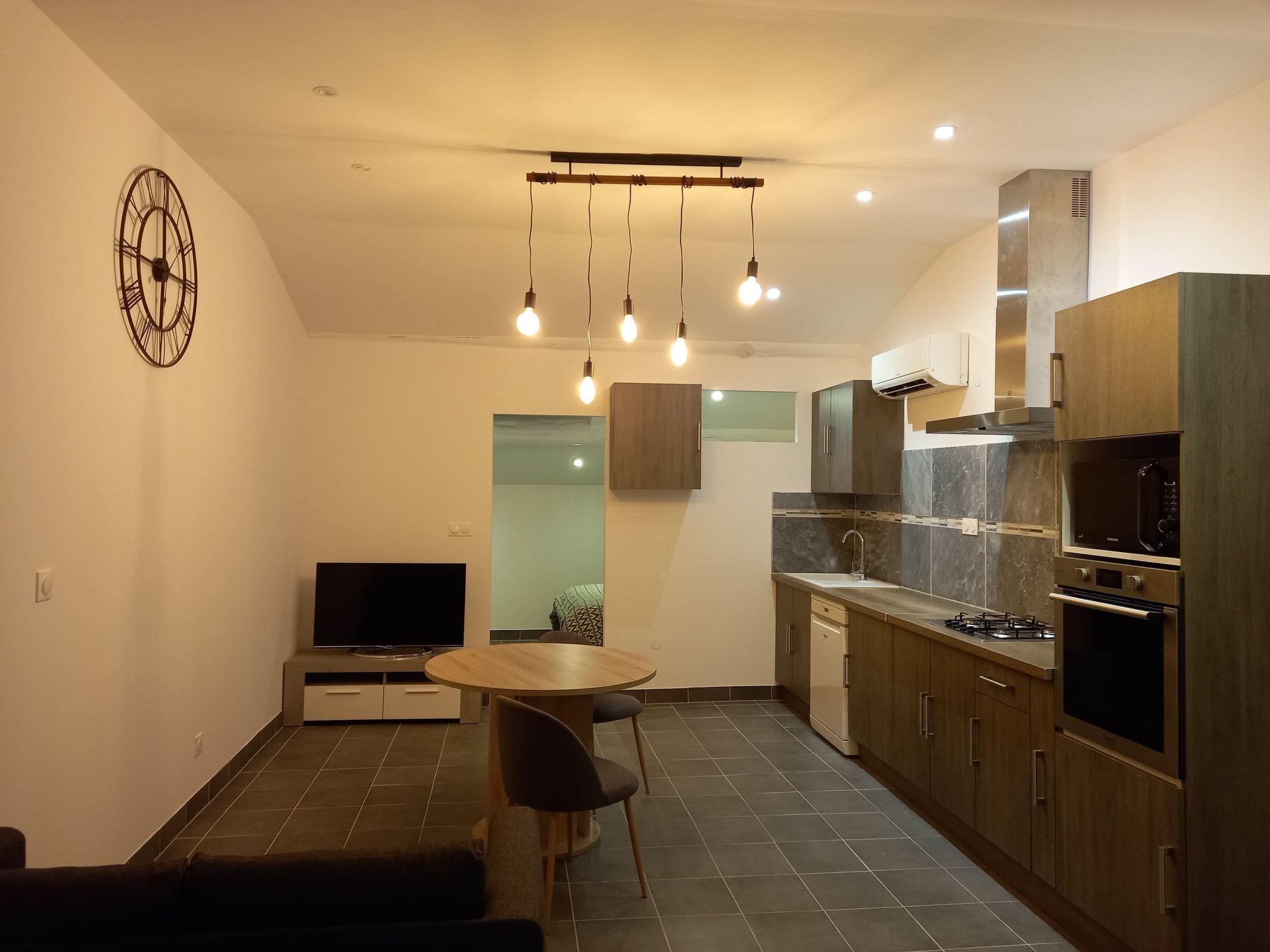 Nach zwei Holztreppen im Bauernhaus der Moulin de Tartay (31 Stufen mit Podest) besteht die Unterkunft aus einer offenen, ausgestatteten Küche, einem Wohnraum mit Blick auf die Küche und ein Flachbildfernseher ist vorhanden.