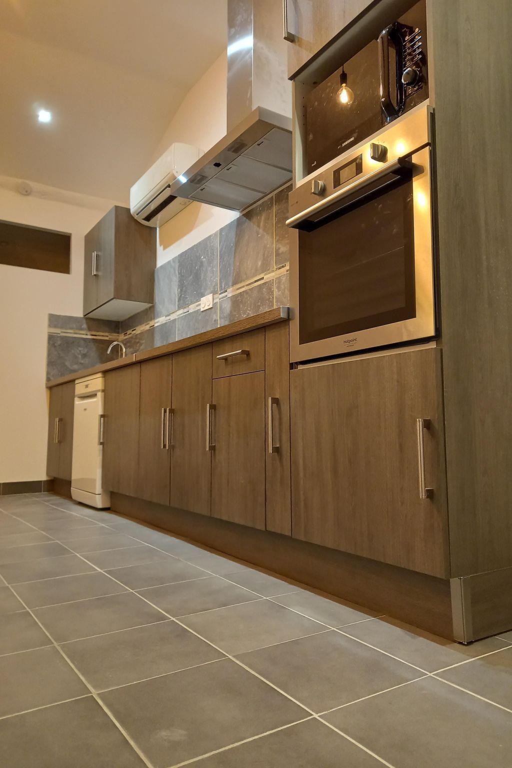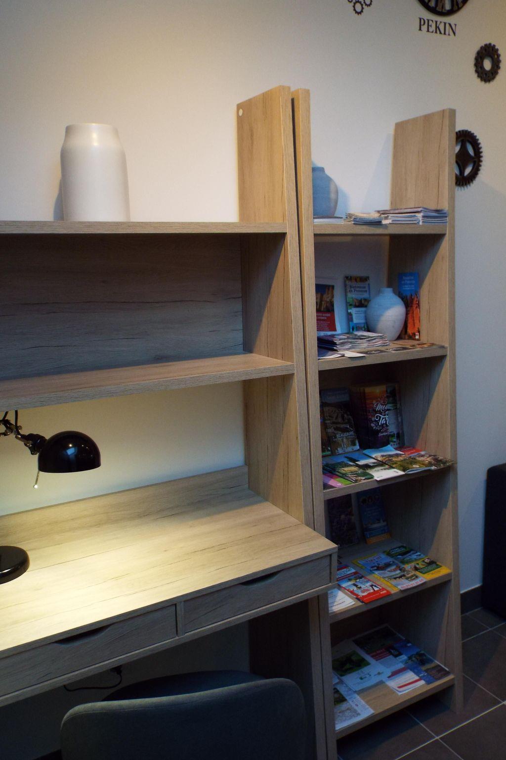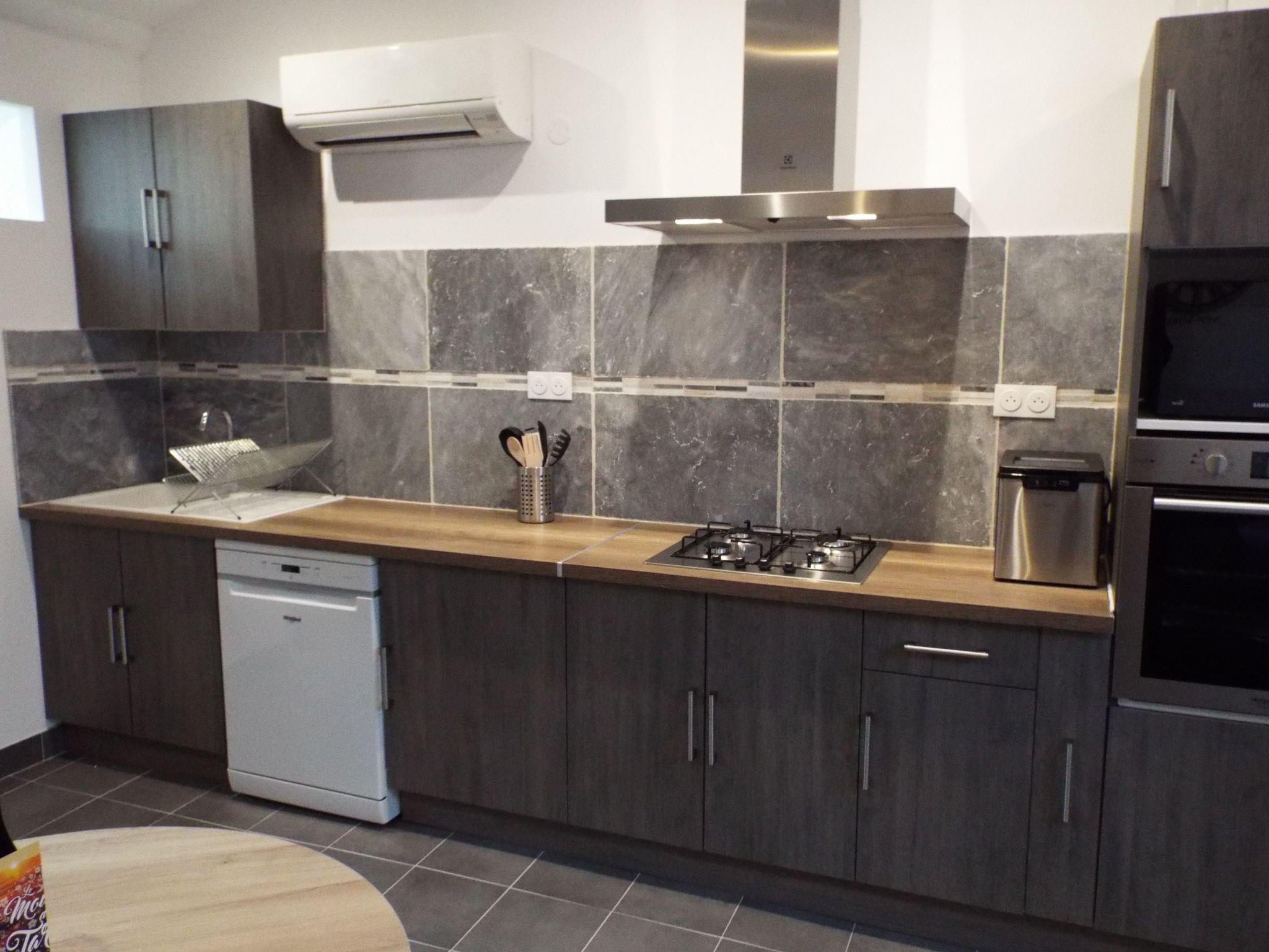 Nach zwei Holztreppen im Bauernhaus der Moulin de Tartay (31 Stufen mit Podest) besteht die Unterkunft aus einer offenen, ausgestatteten Küche, einem Wohnraum mit Blick auf die Küche und ein Flachbildfernseher ist vorhanden.