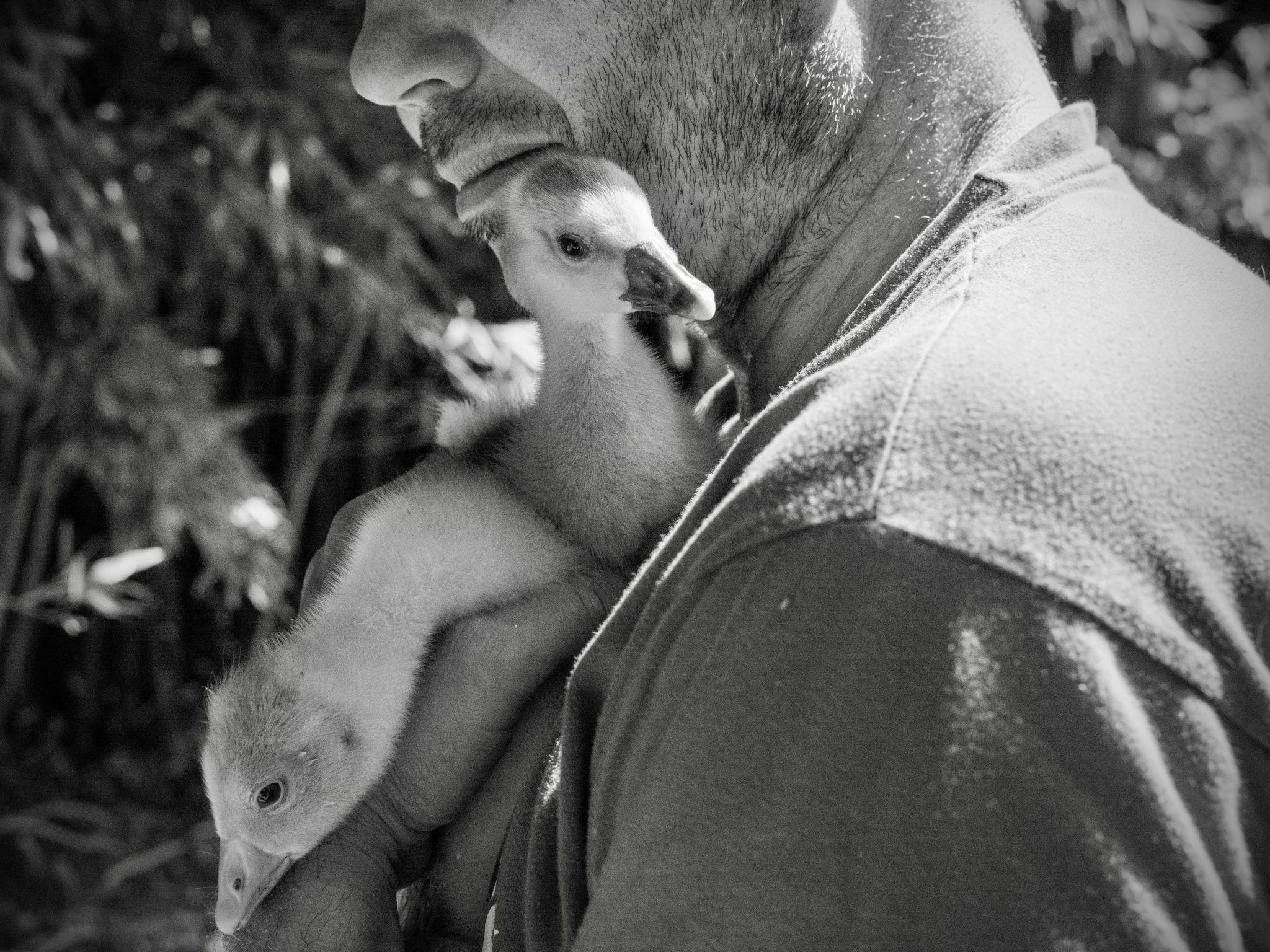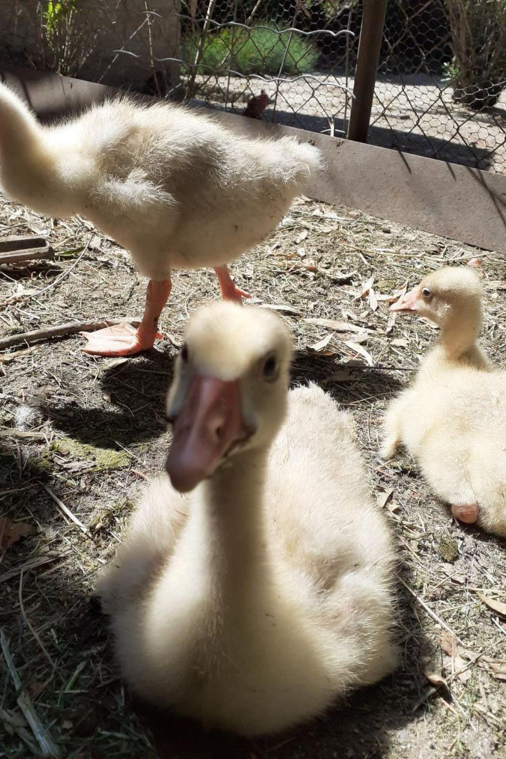 Ein Hund ist vor Ort, ebenso wie Hühner, Hähne und Gänse.