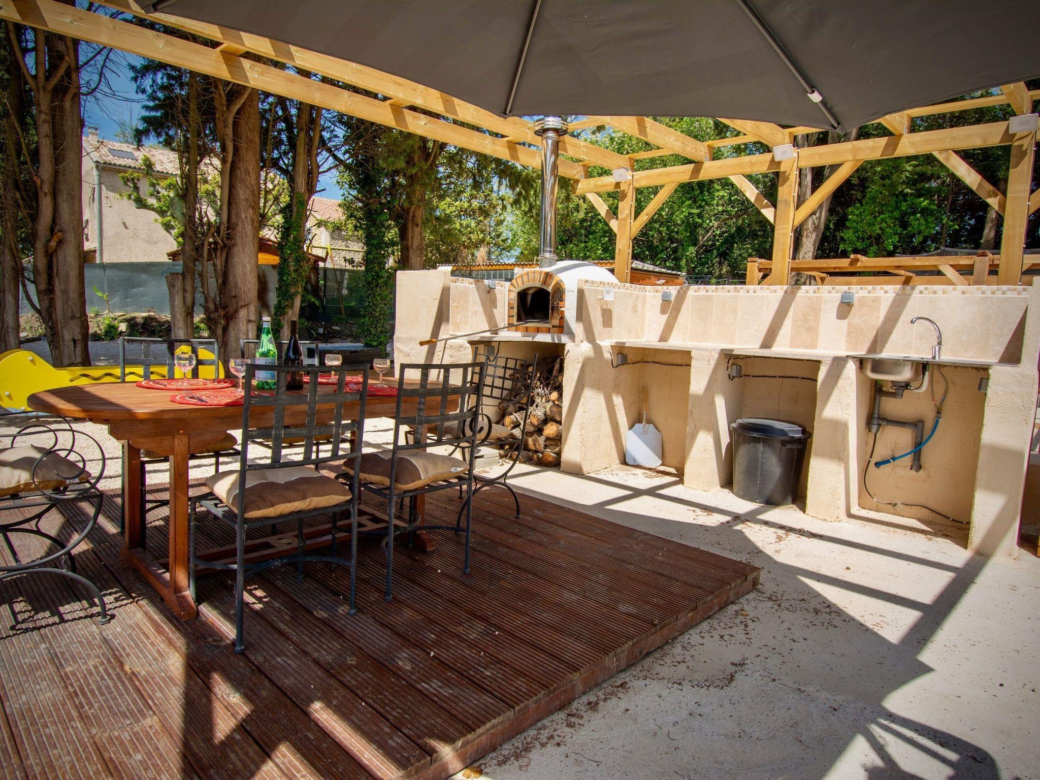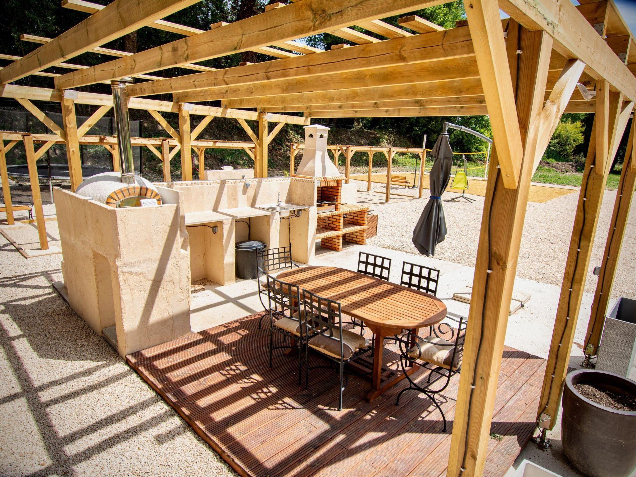 1 private Terrasse für diese Unterkunft mit Grill, Pizzaofen, Tisch und Stühlen, Gartenmöbeln und eigenem Kühlschrank.