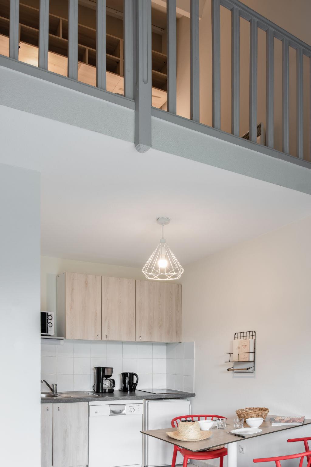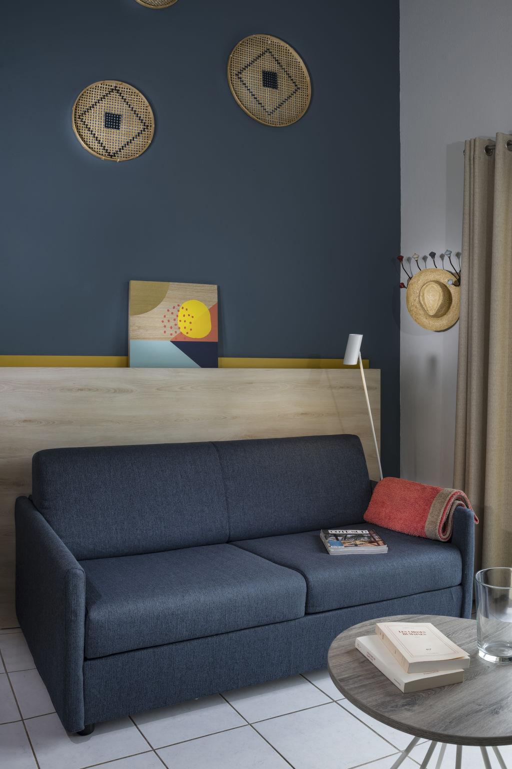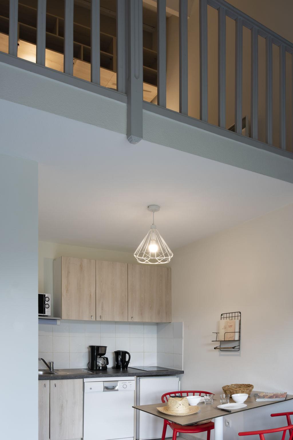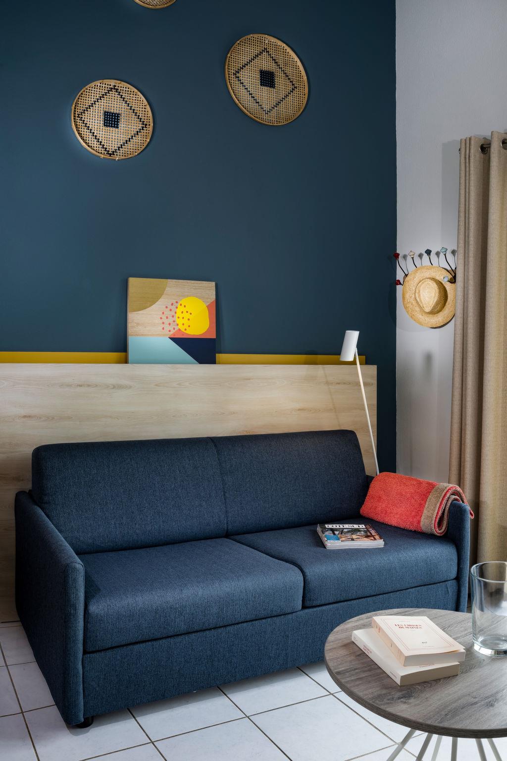 "Domaine du Golf", 1-Zimmer-Reihenhaus 32 m2 auf 2 Stockwerken. Objekt geeignet für 2 Erwachsene + 2 Kinder. Hell, renoviert im Jahre 2019, modern und stilvoll eingerichtet: Wohn-/Schlafzimmer mit 1 Doppeldiwanbett (140 cm, Länge 190 cm), Esstisch, TV und Klimaanlage. Ausgang zur Terrasse. Kochnische (2 Kochplatten, Geschirrspüler, Mikrowelle, elektrische Kaffeemaschine). Dusche/WC. Obergeschoss: offene Galerie mit 2 Betten. E-Heizung. Terrasse. Terrassenmöbel. Zur Verfügung: Internet (WLAN, gratis). Bitte beachten: Maximal 1 Haustier/Hund erlaubt. Rauchmelder. Anstelle eines abgeschlossenen Schlafzimmers befinden sich manche Schlafplätze in einem offenen Bereich (Galerie, Nische etc.).