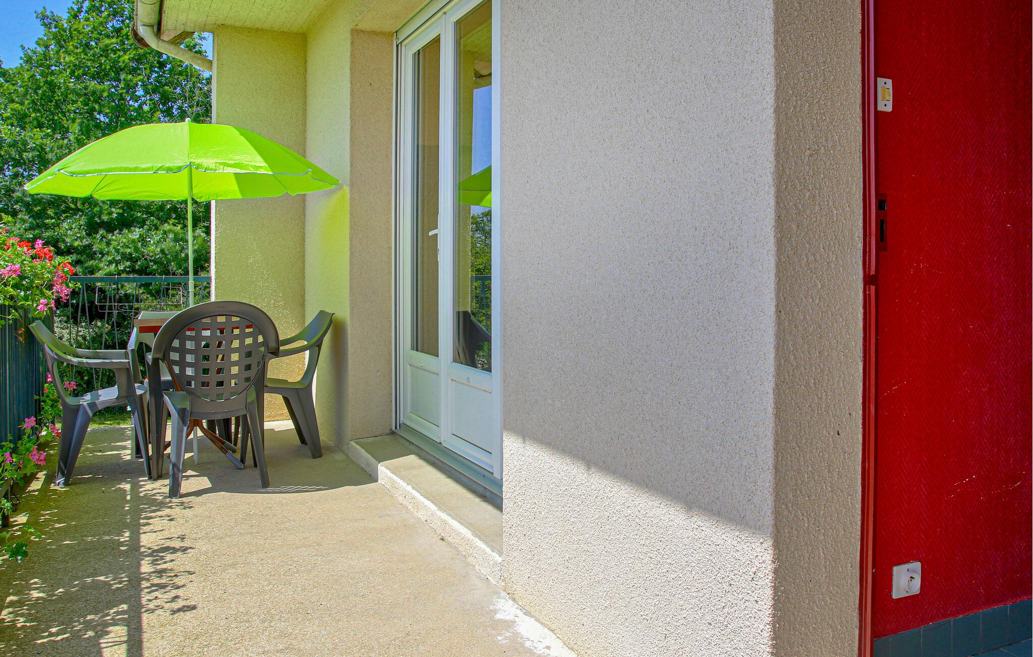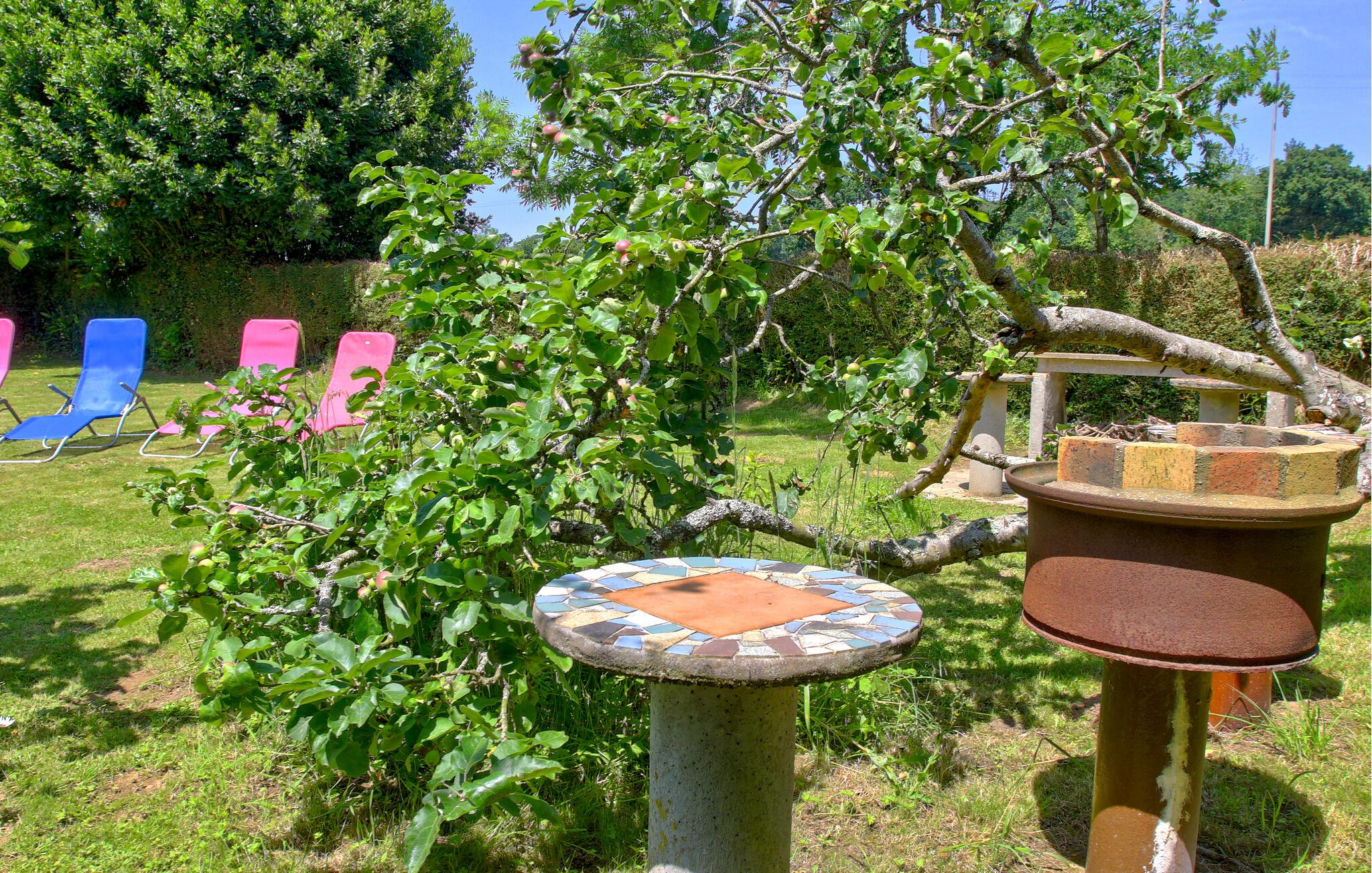 Treten Sie hinter das Haus in den schönen Garten und genießen Sie die ruhige Lage. Machen Sie es sich auf den Liegestühlen auf dem Rasen bequem oder versammeln Sie sich am Picknicktisch unter dem Sonnenschirm. Zünden Sie den Grill an und verbringen Sie lange Sommerabende im Grünen. Bäume und Sträucher rahmen die Rasenfläche ein und schaffen eine angenehme Privatsphäre.