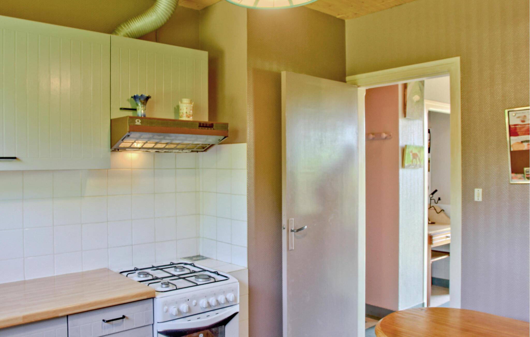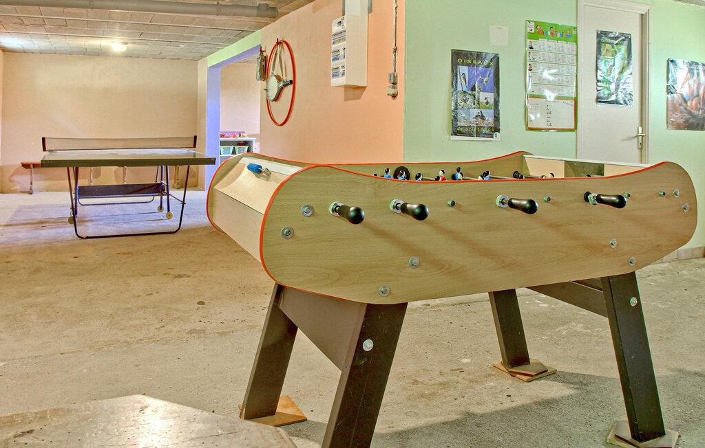 Betreten Sie dieses einladende Ferienhaus und lassen Sie sich von den farbenfrohen Akzenten im Wohnbereich begrüßen. Nehmen Sie am großzügigen Esstisch Platz und planen Sie Ihren Tag bei einem gemeinsamen Frühstück. Die ausgewählten Bilder an den Wänden verleihen dem Raum eine lebendige Note. Machen Sie es sich auf dem Sofa bequem oder öffnen Sie die Terrassentür, um Licht und frische Luft hereinzulassen. Bereiten Sie in der hellen, separaten Küche Ihre Mahlzeiten zu. Nutzen Sie die funktionale Ausstattung für unkomplizierte Kochabende. Ziehen Sie sich für eine Partie Tischtennis oder eine Runde am Tischkicker in den Freizeitbereich zurück und verbringen Sie abwechslungsreiche Stunden im Haus.
