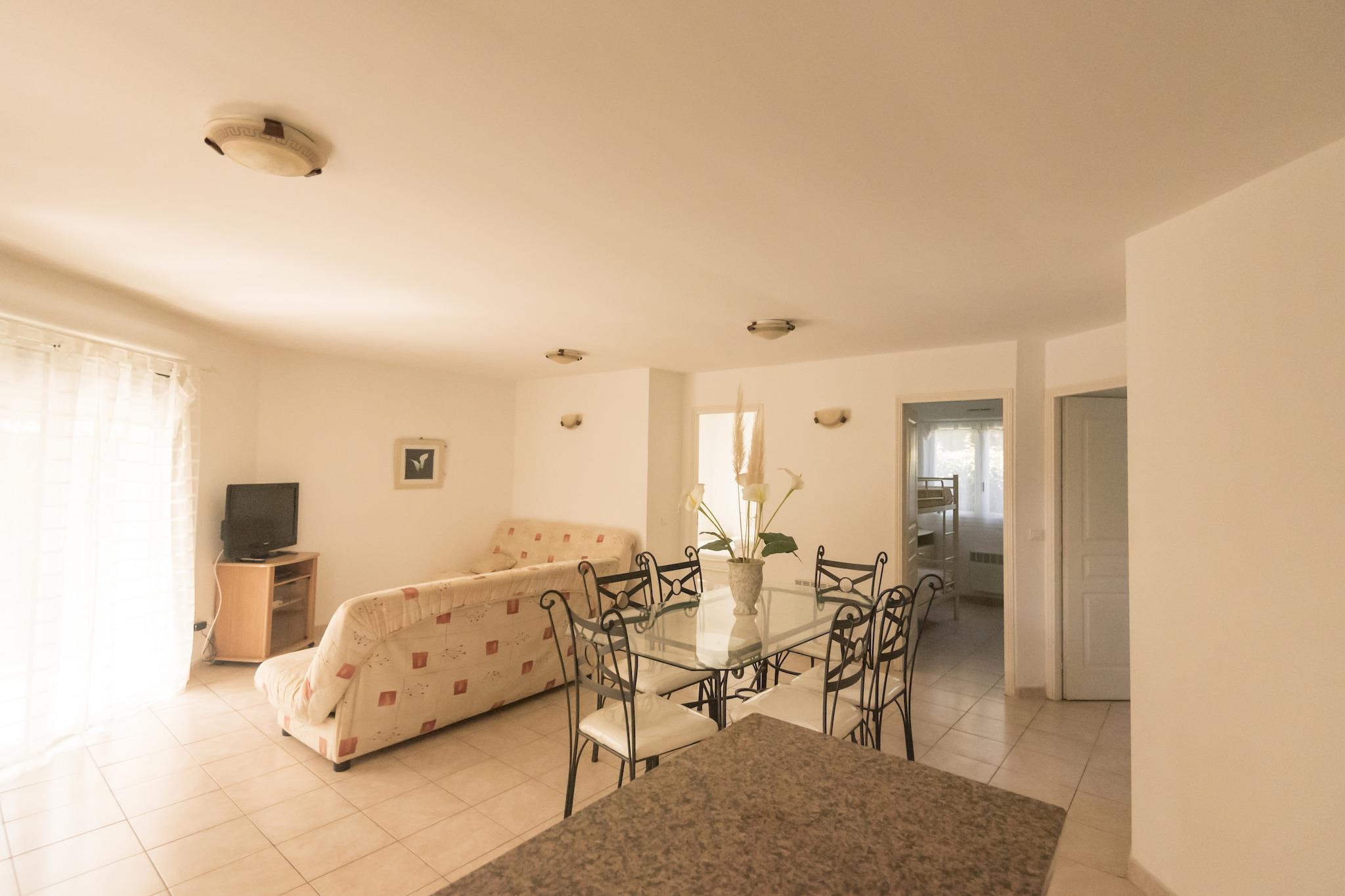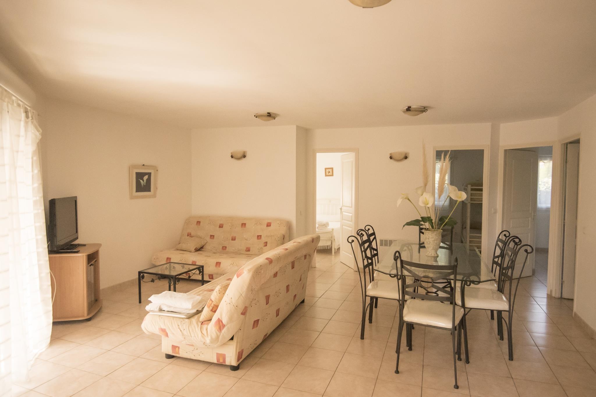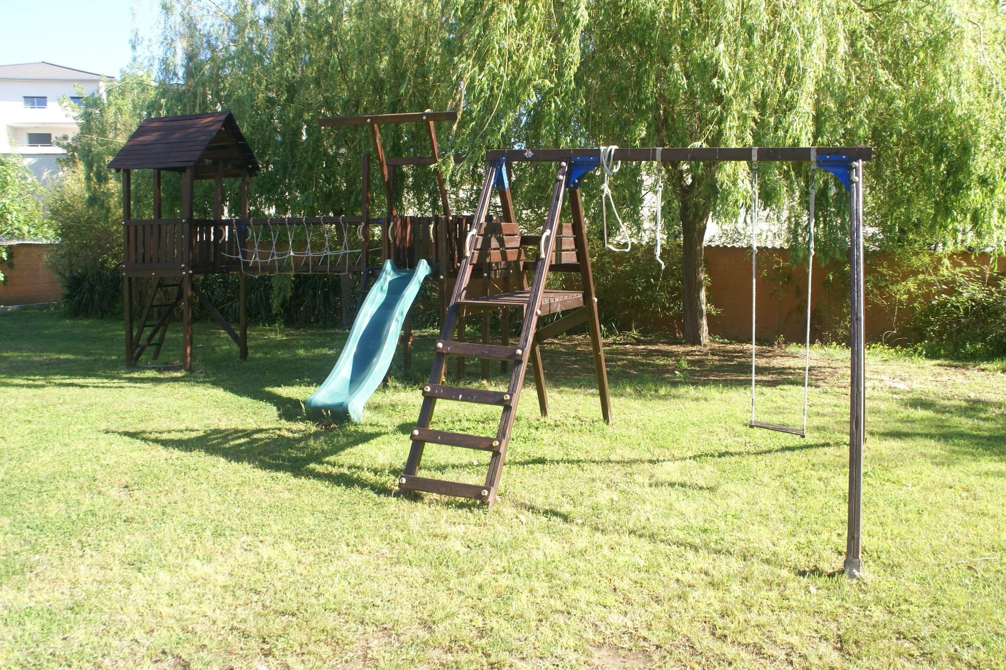 Parterre: (Küche(Backofen, Mikrowelle, Spülmaschine, Tiefkühlschrank), Wohn/Esszimmer(TV), Schlafzimmer(Etagenbett), Schlafzimmer(Doppelbett), Schlafzimmer(2x Etagenbett), Badezimmer(Dusche, Waschbecken, Toilette)) Waschmaschine, Heizung(elektrisch), Klimaanlage, Terrasse(überdacht), Garten, Grill, Parkplatz, Pool(Gemeinschaftliche Nutzung mit anderen Gästen, 14 x 7 m., geöffnet von Mai bis einschließlich Okt), Boulebahn, Spielgeräte, Kinderbett, Hochstuhl