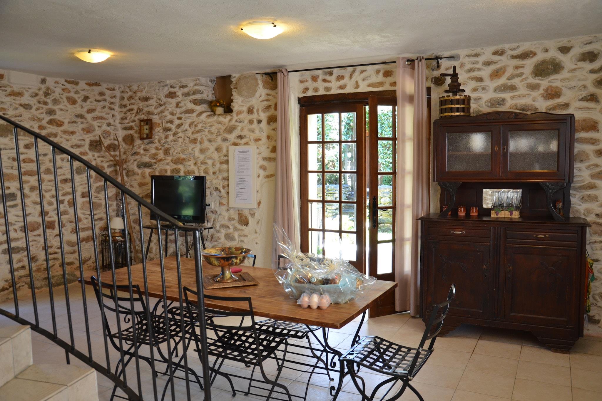 Parterre: (offene Küche(Backofen, Mikrowelle, Spülmaschine, Tiefkühlschrank, Kühl-/Gefrierkombination), Wohn/Esszimmer(TV), Badezimmer(Dusche, Waschbecken, Toilette)) In der 1. Etage: (Schlafzimmer(Doppelbett), Schlafzimmer(Etagenbett), Schlafzimmer(Etagenbett), Badezimmer(Dusche, Waschbecken, Toilette)) Waschmaschine, Heizung(elektrisch), Klimaanlage, Terrasse(überdacht), Garten(alleinige Nutzung), Grill, Parkplatz, Pool(Gemeinschaftliche Nutzung mit anderen Gästen, 14 x 7 m., geöffnet von Mai bis einschließlich Okt), Boulebahn, Spielgeräte, Hochstuhl
