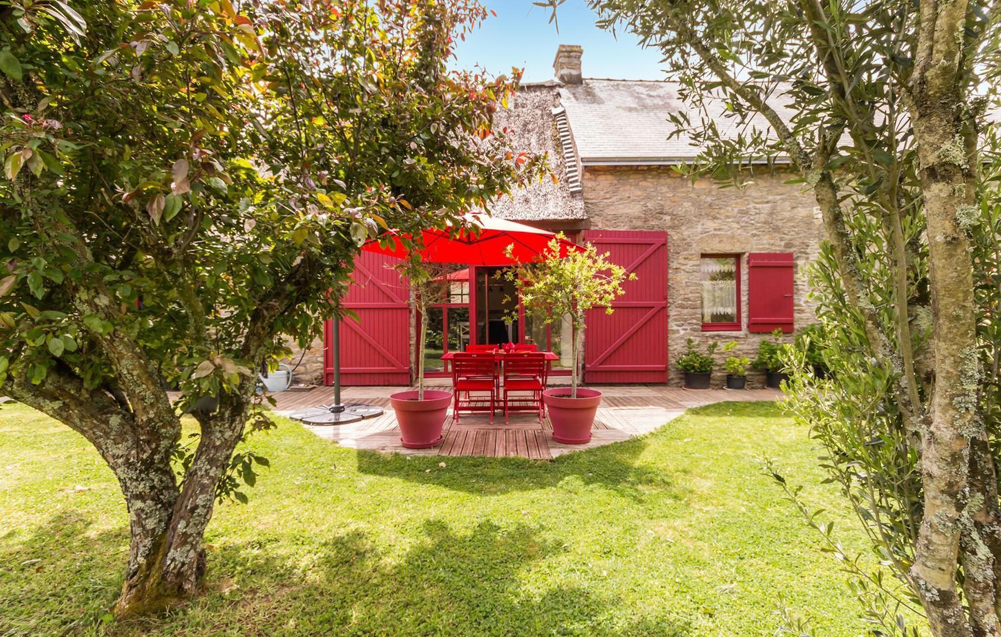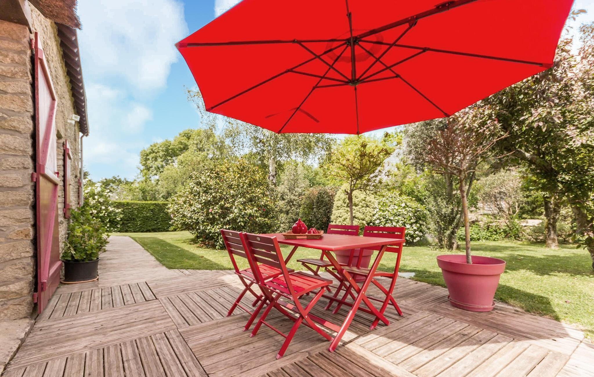 Genießen Sie ein Frühstück unter dem leuchtend roten Sonnenschirm auf Ihrer einladenden Terrasse oder verbringen Sie entspannte Nachmittage mit einem Glas Wein und einem guten Buch. Atmen Sie die frische Landluft ein, während Ihre Kinder im geschützten Garten ein Picknick veranstalten.