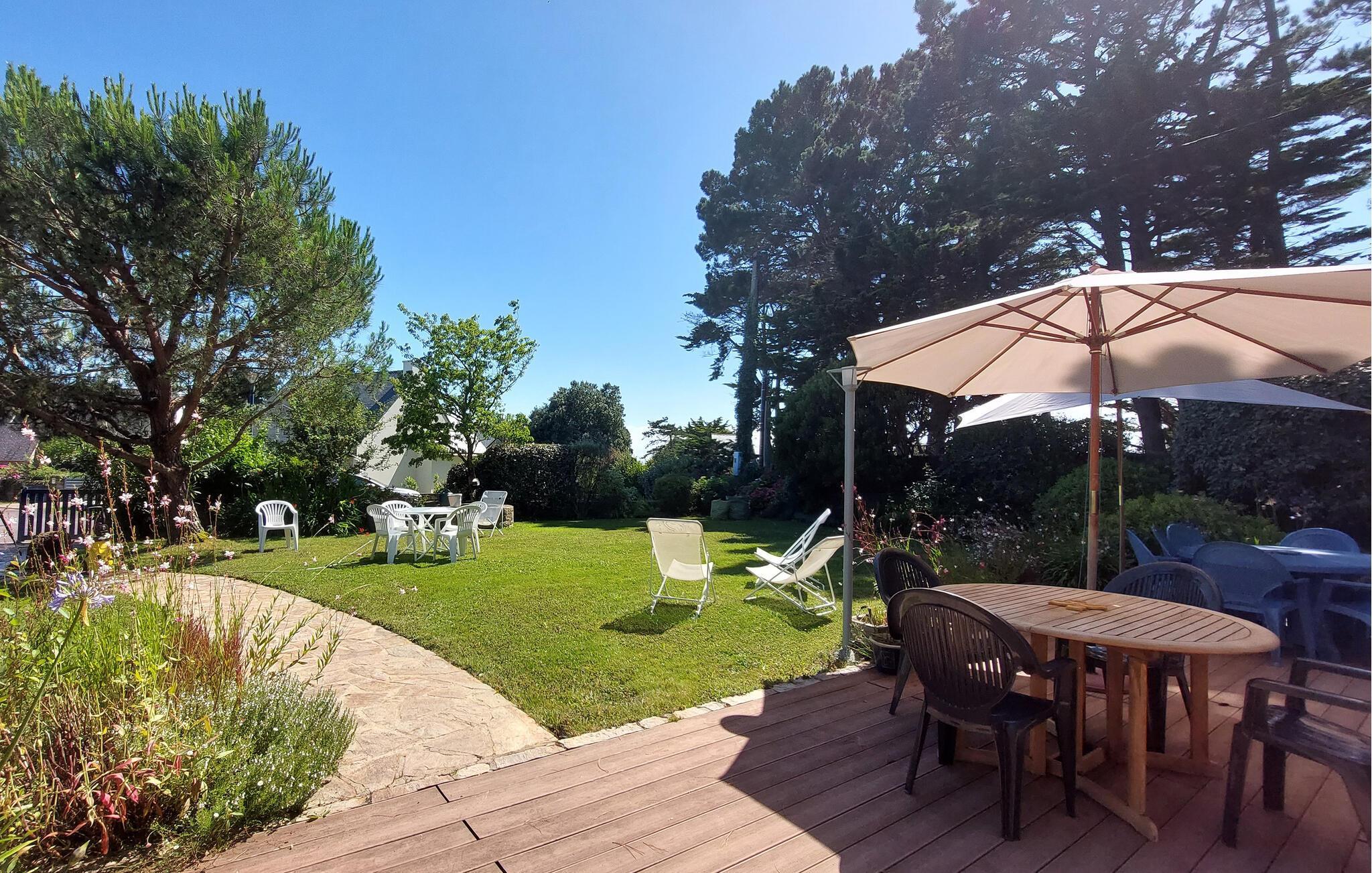 Der großzügige Garten, geschmückt mit bunten Blumen, lädt zum Essen und Entspannen ein. Genießen Sie die gesellige Zeit auf der Terrasse oder im gemütlichen Wohnzimmer, wo Sie die Abende bei einem guten Buch oder einem Brettspiel ausklingen lassen können – hier fühlt sich jeder sofort zu Hause.