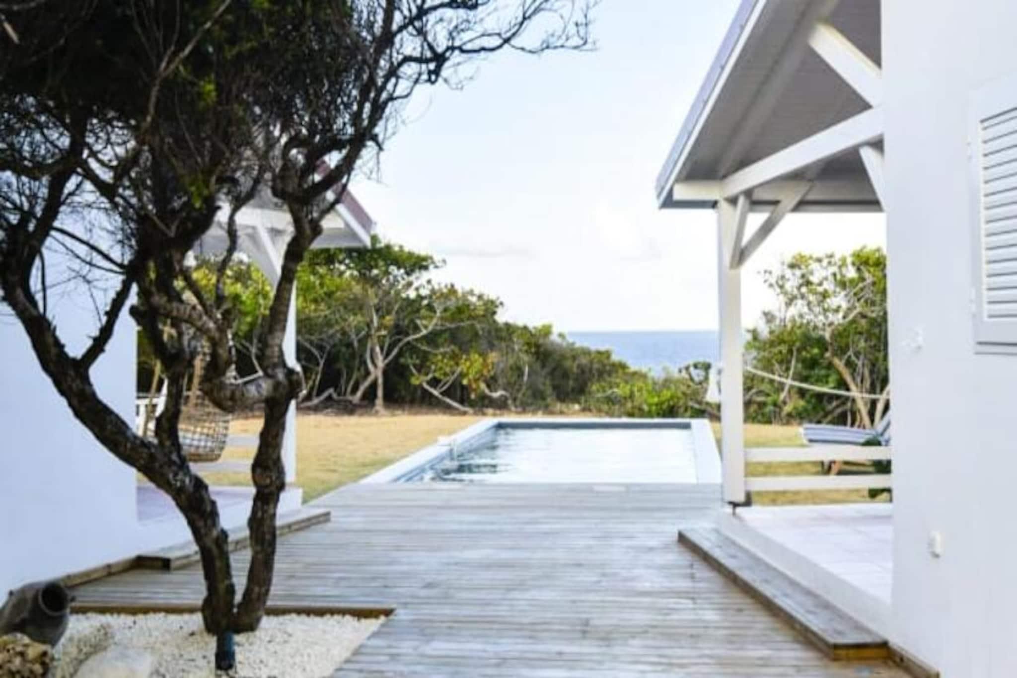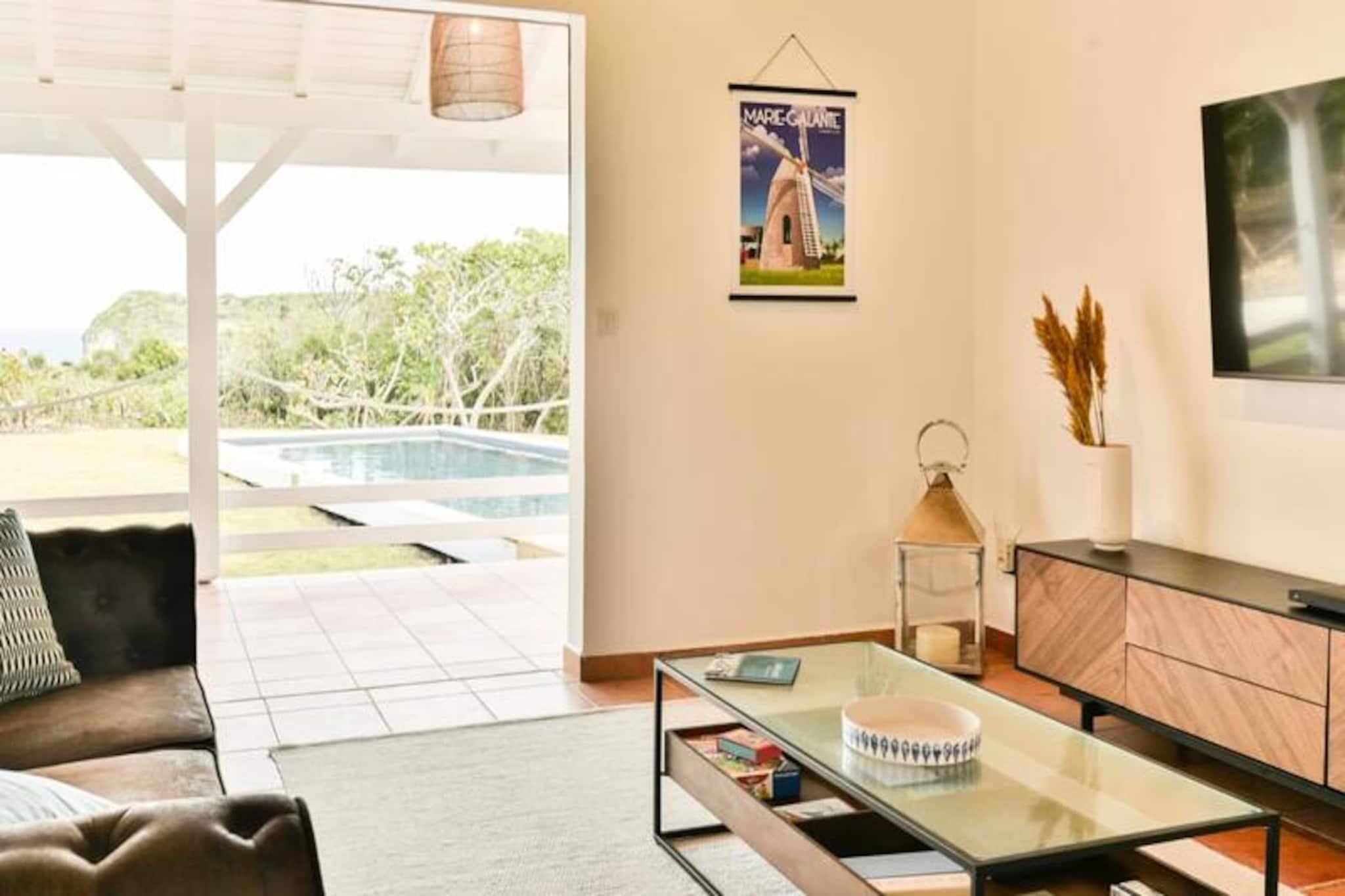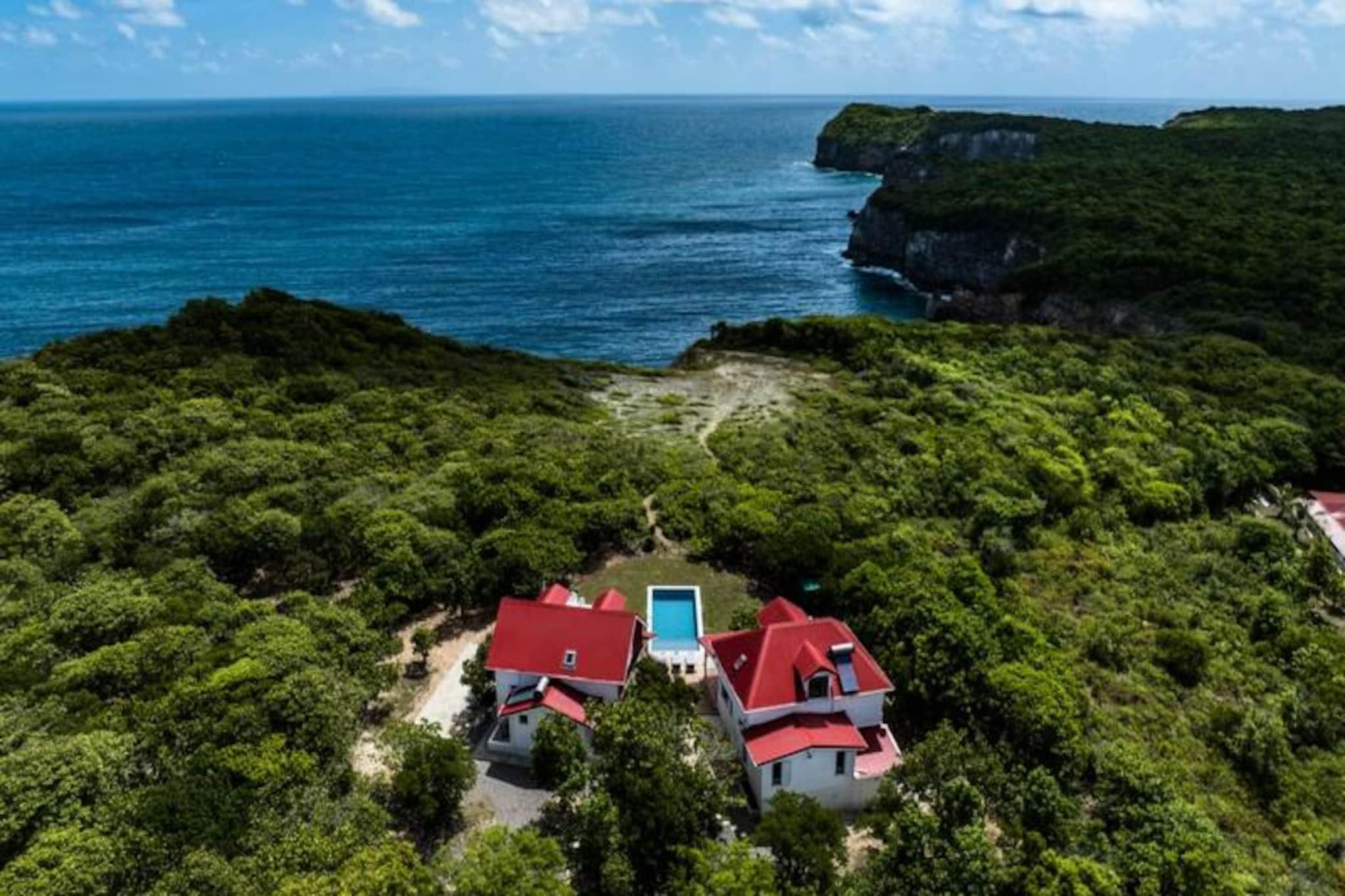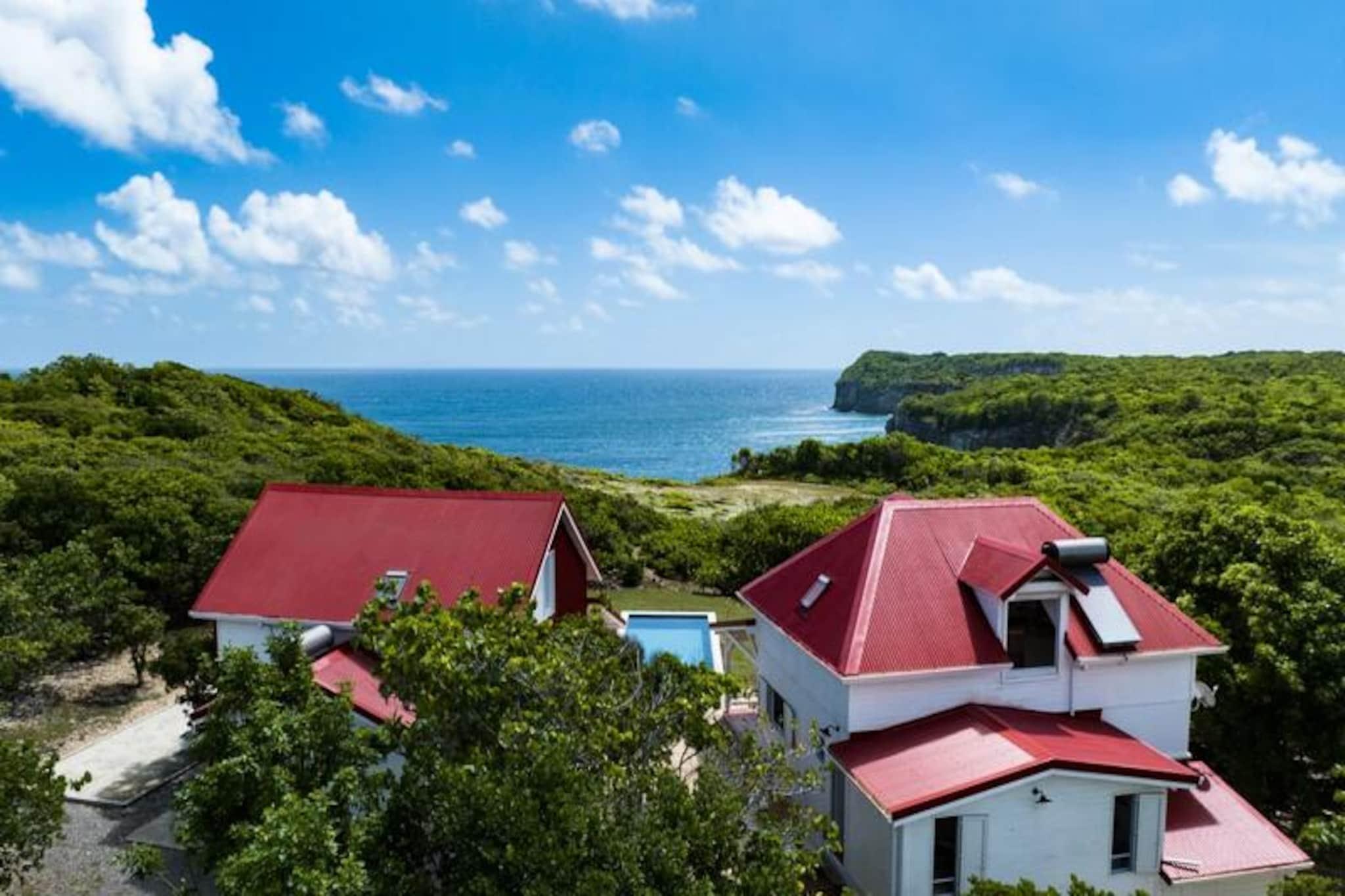 Hoch oben auf einer imposanten Klippe gelegen, bietet diese atemberaubende Villa auf der Insel Marie-Galante einen ruhigen Rückzugsort mit spektakulärem Blick auf das türkisfarbene Meer. Umgeben von üppigen Weinbergen am Meer, ist dieses Refugium eine Oase der Ruhe und Authentizität – perfekt für alle, die eine friedliche Auszeit unter der karibischen Sonne suchen. Vom Sonnenaufgang an werden Sie von den Panoramablicken der Villa verzaubert sein und eine magische Kulisse für Ihren Aufenthalt schaffen. Die Villa bietet Platz für bis zu acht Gäste und verfügt über vier klimatisierte Schlafzimmer, die alle liebevoll eingerichtet sind und erholsame Nächte garantieren. Die Architektur im kreolischen Stil vereint Charme und modernen Komfort. Die voll ausgestattete Küche öffnet sich zu einer geräumigen Terrasse, ideal für gemeinsame Mahlzeiten und gesellige Runden. Draußen lädt der private Pool zum Entspannen mit freiem Meerblick ein, und der Bouleplatz sorgt für Unterhaltung mit Familie und Freunden. Von den Poolhandtüchern bis zum Highspeed-Glasfaserinternet wurde an jedes Detail gedacht, um einen reibungslosen und luxuriösen Aufenthalt zu gewährleisten. Die Lage der Villa ist ebenso bezaubernd. Nur eine kurze Autofahrt entfernt liegen die idyllischen Strände von Saint-Louis und Anse de Mays, ideal zum Schwimmen und Schnorcheln. Entdecken Sie das reiche Erbe der Insel mit Besuchen der historischen Windmühlen und der renommierten Bielle-Destillerie oder unternehmen Sie malerische Wanderungen, um die Gueule Grand-Gouffre zu bestaunen. Ob Sie spektakuläre Sonnenuntergänge genießen, Wassersport betreiben oder einfach die friedliche Atmosphäre auf sich wirken lassen möchten – diese Villa bietet die perfekte Balance zwischen Entspannung und Entdeckungen. Mit exklusiven Concierge-Services, inklusive Ausflügen, Mietwagen und Empfehlungen für lokale Veranstaltungen, wird Ihr Aufenthalt unvergesslich. Lassen Sie die Schönheit von Marie-Galante und den Komfort dieser Villa Erinnerungen schaffen, die ein Leben lang halten.