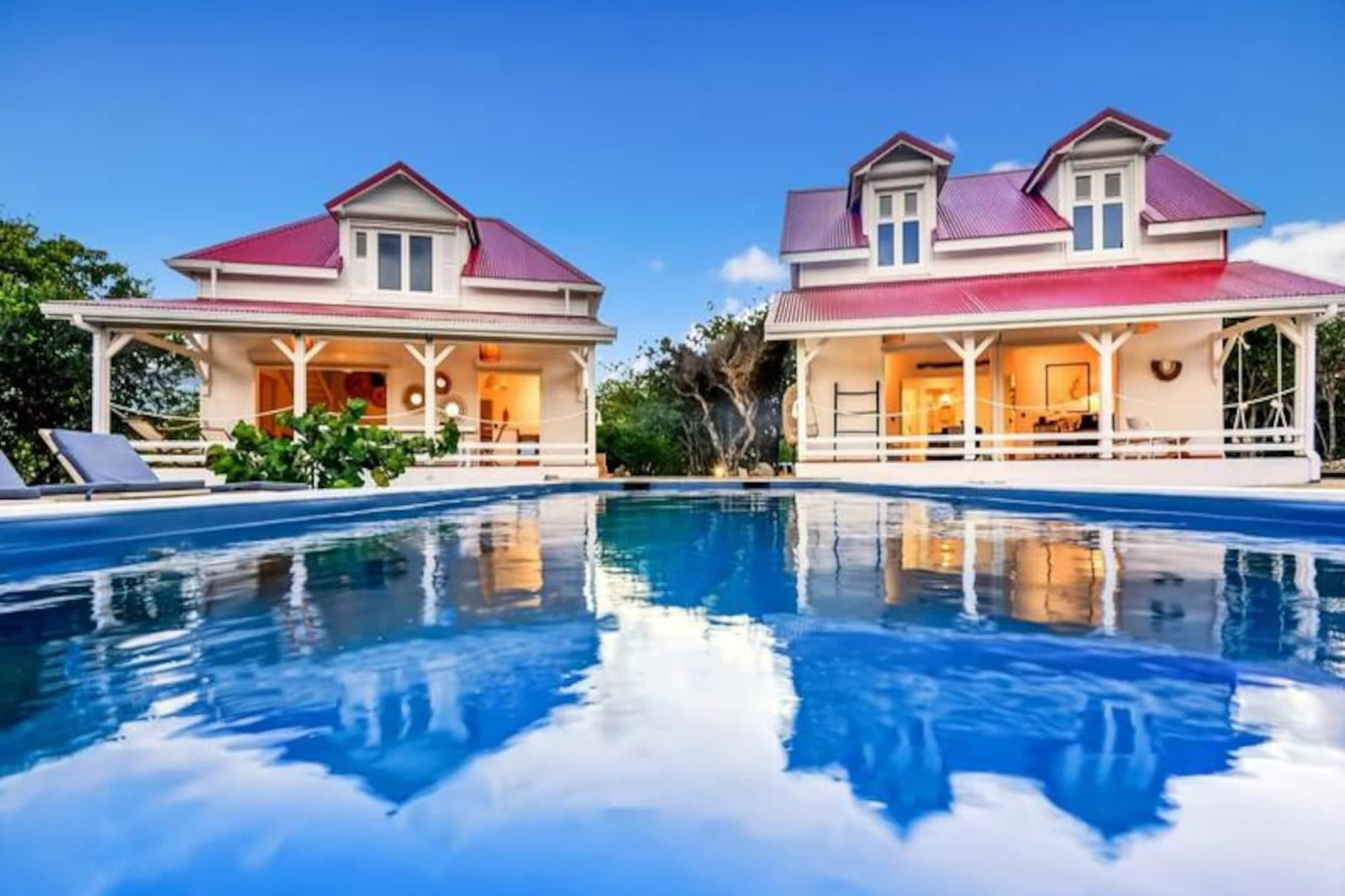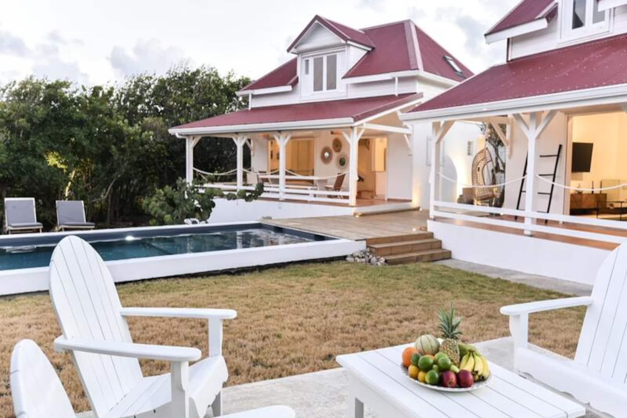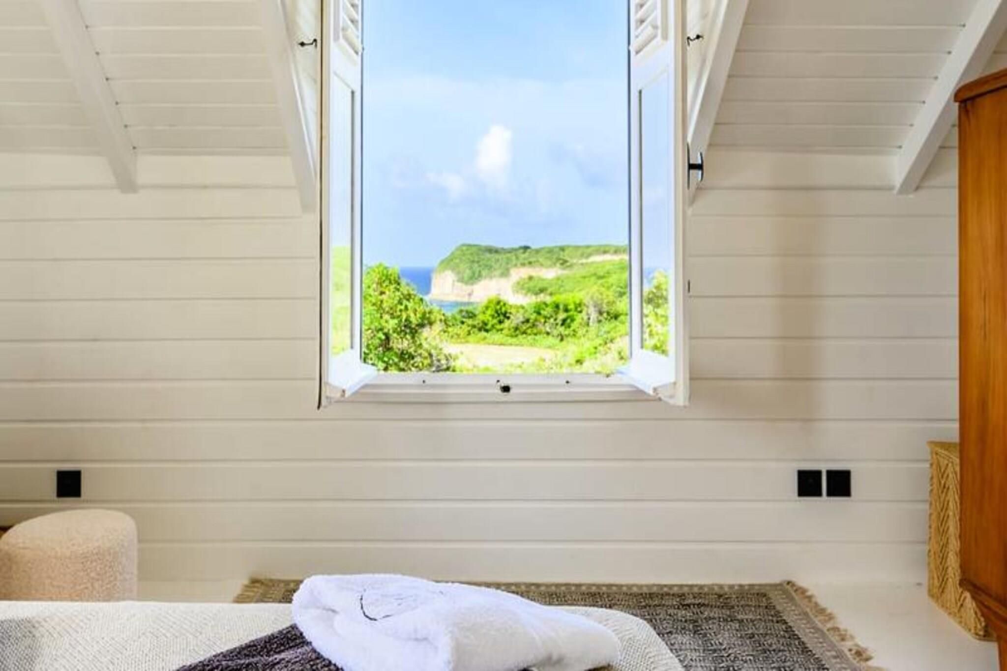 Hoch oben auf einer imposanten Klippe gelegen, bietet diese atemberaubende Villa auf der Insel Marie-Galante einen ruhigen Rückzugsort mit spektakulärem Blick auf das türkisfarbene Meer. Umgeben von üppigen Weinbergen am Meer, ist dieses Refugium eine Oase der Ruhe und Authentizität – perfekt für alle, die eine friedliche Auszeit unter der karibischen Sonne suchen. Vom Sonnenaufgang an werden Sie von den Panoramablicken der Villa verzaubert sein und eine magische Kulisse für Ihren Aufenthalt schaffen. Die Villa bietet Platz für bis zu acht Gäste und verfügt über vier klimatisierte Schlafzimmer, die alle liebevoll eingerichtet sind und erholsame Nächte garantieren. Die Architektur im kreolischen Stil vereint Charme und modernen Komfort. Die voll ausgestattete Küche öffnet sich zu einer geräumigen Terrasse, ideal für gemeinsame Mahlzeiten und gesellige Runden. Draußen lädt der private Pool zum Entspannen mit freiem Meerblick ein, und der Bouleplatz sorgt für Unterhaltung mit Familie und Freunden. Von den Poolhandtüchern bis zum Highspeed-Glasfaserinternet wurde an jedes Detail gedacht, um einen reibungslosen und luxuriösen Aufenthalt zu gewährleisten. Die Lage der Villa ist ebenso bezaubernd. Nur eine kurze Autofahrt entfernt liegen die idyllischen Strände von Saint-Louis und Anse de Mays, ideal zum Schwimmen und Schnorcheln. Entdecken Sie das reiche Erbe der Insel mit Besuchen der historischen Windmühlen und der renommierten Bielle-Destillerie oder unternehmen Sie malerische Wanderungen, um die Gueule Grand-Gouffre zu bestaunen. Ob Sie spektakuläre Sonnenuntergänge genießen, Wassersport betreiben oder einfach die friedliche Atmosphäre auf sich wirken lassen möchten – diese Villa bietet die perfekte Balance zwischen Entspannung und Entdeckungen. Mit exklusiven Concierge-Services, inklusive Ausflügen, Mietwagen und Empfehlungen für lokale Veranstaltungen, wird Ihr Aufenthalt unvergesslich. Lassen Sie die Schönheit von Marie-Galante und den Komfort dieser Villa Erinnerungen schaffen, die ein Leben lang halten.