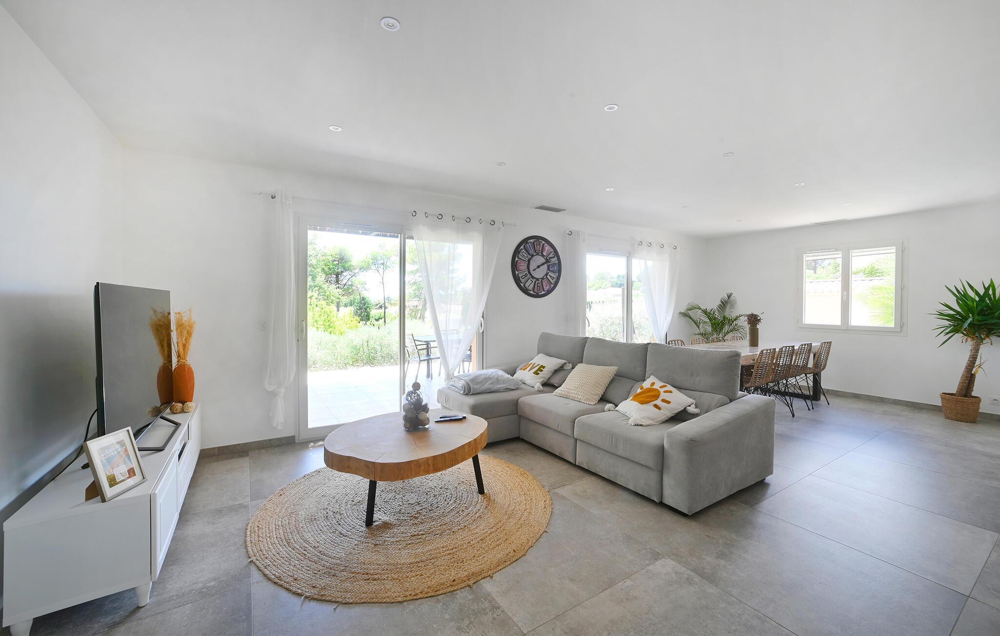 Diese helle und geschmackvoll eingerichtete Villa lädt Sie am Fuße der Cevennen, zwischen Meer und Bergen, zu einer herrlichen Auszeit mit Ihren Liebsten ein. Hier genießen Sie modernen Komfort und eine freundliche, stilvolle Atmosphäre, während Sie köstliche Gerichte in der hochwertigen Küche zaubern und bei geselligen Mahlzeiten Ihre Unternehmungen planen. Für gemütliche Abendstunden lockt das bequeme Sofa, auf dem Sie anregende Gespräche führen oder bei ruhigen Lesestunden entspannen können.