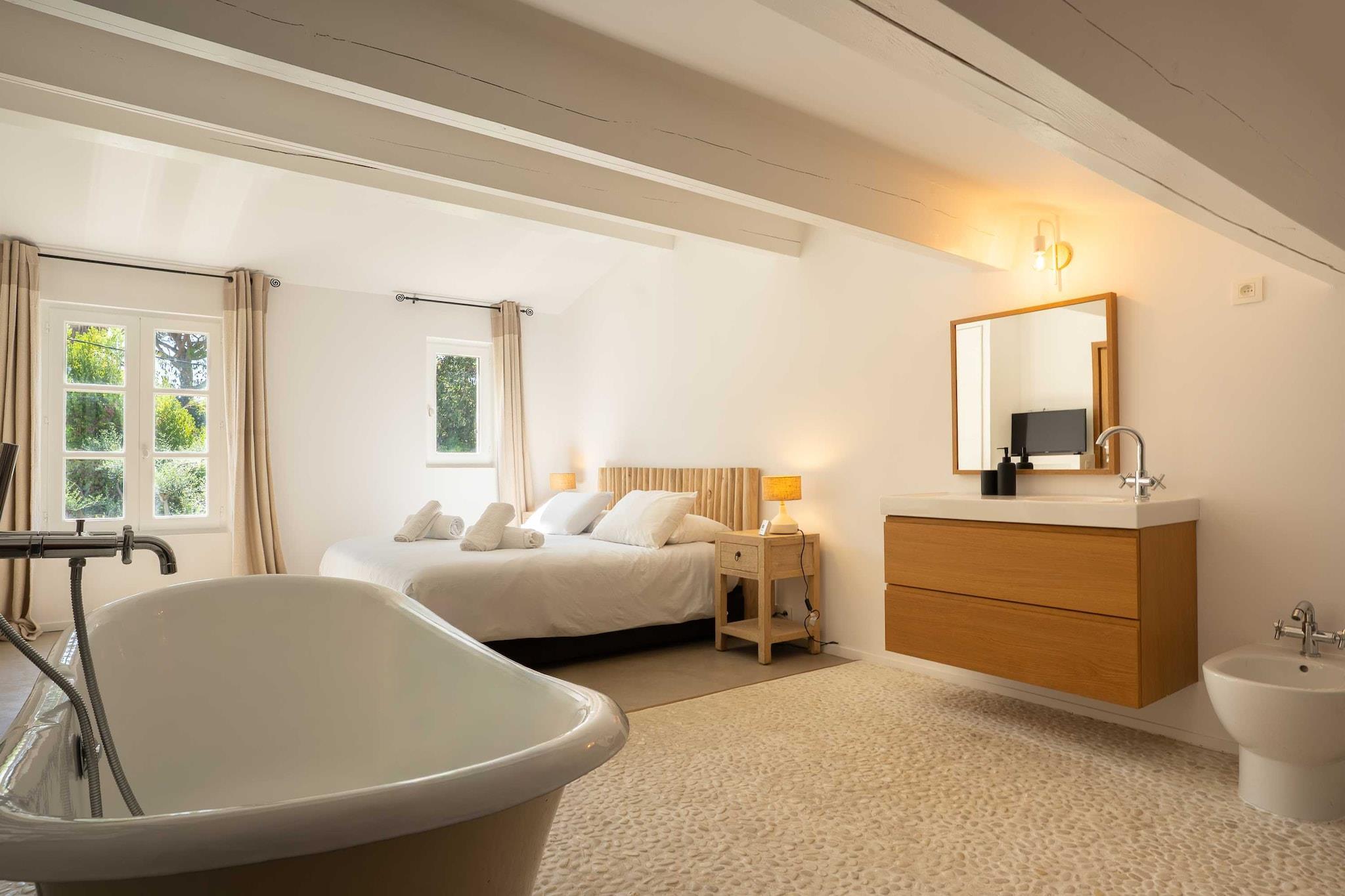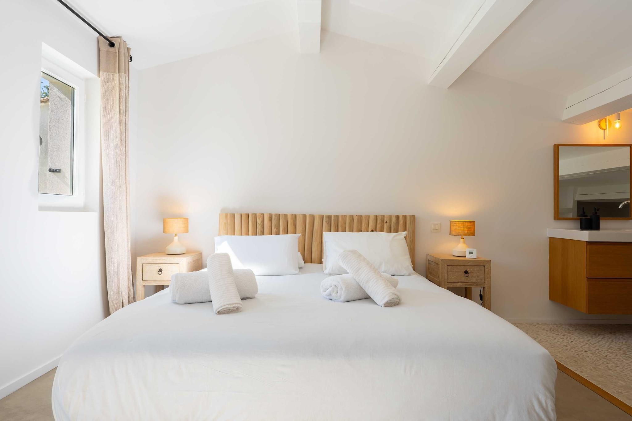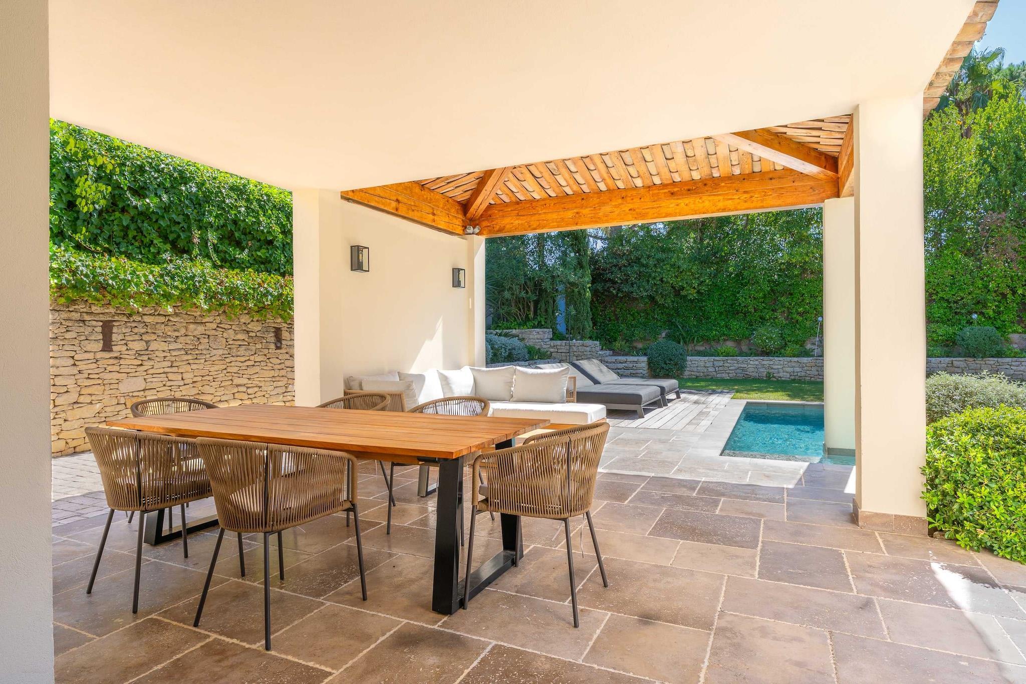 ??Checkmyguest bietet ein elegantes, 150 m² großes Haus mit privatem Pool in Saint-Tropez für bis zu 8 Personen. Genießen Sie modernes Ambiente, komfortable Zimmer und eine ideale Lage in der Nähe der Strände und des lebhaften Zentrums. ? Mitten im Herzen von Saint-Tropez bietet dieses elegante, einstöckige Haus mit 150 m² Wohnfläche ein einzigartiges Wohnumfeld, das Komfort, Modernität und den authentischen Charme von Saint-Tropez vereint. Ideal für bis zu 8 Personen, wird es Familien und Freundesgruppen begeistern, die einen exklusiven Aufenthalt unter der mediterranen Sonne suchen. ?? An der Route des Carles, einer der begehrtesten Adressen von Saint-Tropez, gelegen, sind Sie nur wenige Minuten vom lebhaften Zentrum mit seinen Luxusboutiquen, renommierten Restaurants und legendären Stränden entfernt. Genießen Sie eine ruhige Wohnumgebung und bleiben Sie gleichzeitig mitten im aufregenden Saint-Tropez. ? Ein Raum für Ihren Komfort: ?? Ein geräumiges, gemütliches Wohnzimmer mit einem großen Sofa, einem Fernseher, einem Esstisch und einem Beistelltisch. ?? Eine moderne, geschlossene Küche mit Kochinsel und allen notwendigen Geräten: Kühlschrank, Mikrowelle, Geschirrspüler, Kaffeemaschine, Wasserkocher, Toaster … ?? Vier komfortable Schlafzimmer: – Eine Suite im Obergeschoss mit einem Queensize-Bett und eigenem Bad (Badewanne + WC). – Ein Schlafzimmer mit einem Queensize-Bett, Fernseher, Kleiderschrank und Zugang zum Balkon. – Ein Schlafzimmer mit einem Doppelbett, Kleiderschrank, Fernseher, Balkon und eigenem Bad (Dusche + WC). – Ein Schlafzimmer mit einem Doppelbett, Fernseher und Balkon. ?? Ein modernes Badezimmer mit Dusche und Waschbecken. ?? Ein separates WC. ?? Ein zusätzliches Schlafzimmer im Untergeschoss mit eigenem Bad, ideal für Personal oder Gäste. ?? Waschküche mit Waschmaschine und Trockner. ?? Klimaanlage im gesamten Haus. ?? Die Vorteile dieses Hauses: ?? Privater Pool für unvergessliche Momente der Entspannung. ?? Möblierte Terrasse mit Gartenmöbeln. ?? Zugang zu einer privaten Garage. ?? WLAN. ?? Hochwertige Bettwäsche und Handtücher für einen unbeschwerten Aufenthalt.