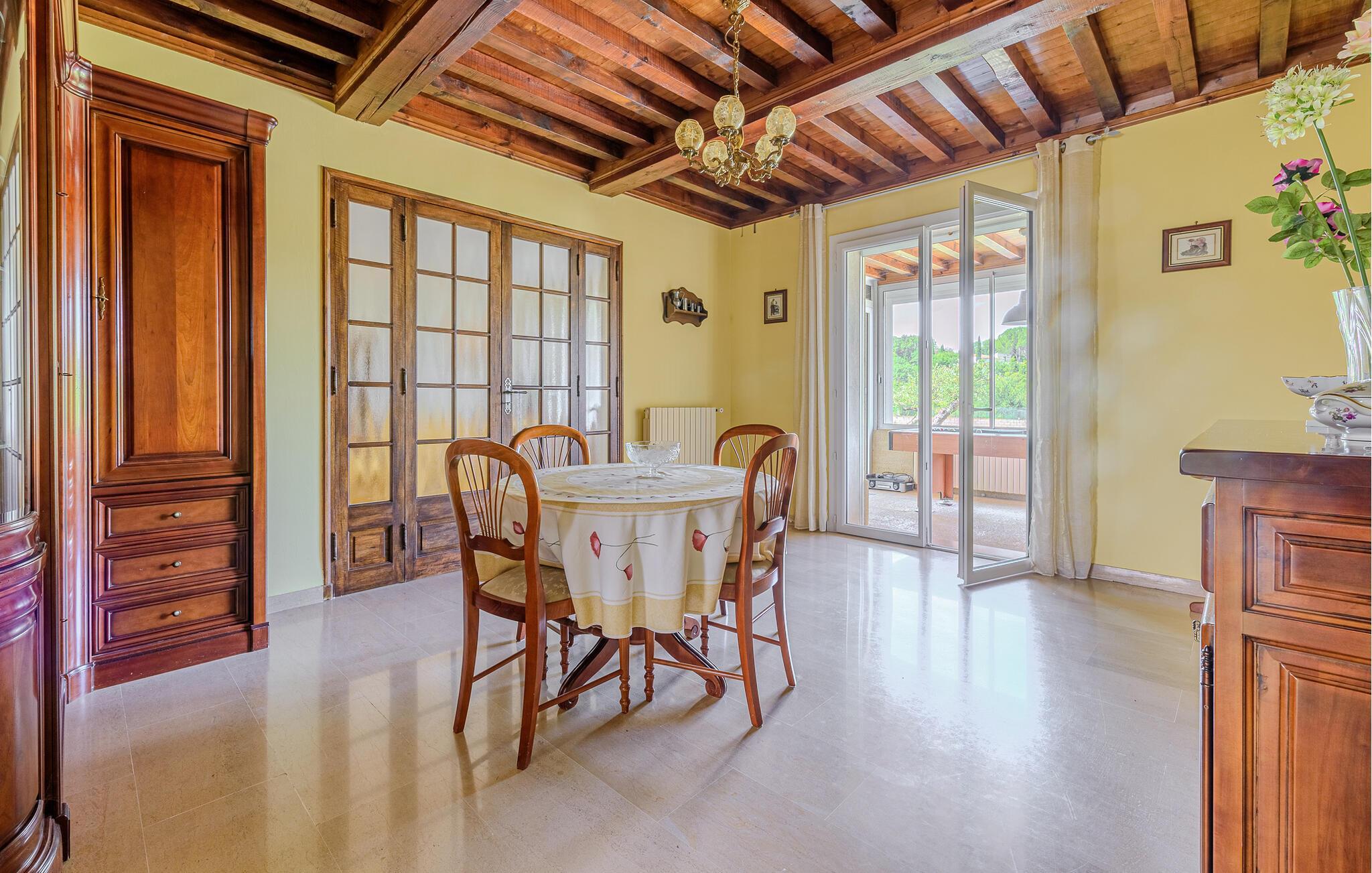 Umgeben von Weinfeldern empfängt Sie dieses großzügig geschnittene Ferienhaus mit sichtgeschütztem Privatpool auf einem 2.500 m² großen und geschlossenen Privatgrundstück. Das Haus profitiert von einer tollen Lage inmitten der Natur und überzeugt durch helle und komfortable Räume. Nach Nîmes sind es 19 km, nach Uzès 10 km, und ebenfalls 10 km entfernt verläuft ein schöner Fluss mit tollen Badestellen. Die Terrasse öffnet sich zur Natur hin, und auf der kleinen Veranda sorgt ein Billardtisch für Abwechslung. Die Küche und die Bäder sind modern und praktisch eingerichtet. Eingebettet in eine schöne Naturlandschaft begrüßt Sie das charmante Dörfchen Aubarne-Sainte-Anastasie in einer extrem ruhigen Umgebung. Gleich in der Nähe können Sie von dem klaren Wasser des Gardon profitieren und den Pont du Gard erleben. Nîmes, eine halbe Stunde entfernt, besticht durch einen Stadtkern mit vielen Monumenten aus der römischen Epoche. 20 Minuten entfernt können Sie sich in Uzès und seiner unter Denkmalschutz stehenden Altstadt umschauen. Erleben Sie etwa die Place aux Herbes, die Rue de l'Aspic und die Place d'Horloge und profitieren Sie von seinen Boutiquen, Restaurants und gemütlichen Cafés. Mittwochmorgens und samstags ganztägig findet in Uzès außerdem einer der schönsten Märkte in ganz Frankreich statt. Nehmen Sie Ihre Kinder mit ins Haribo-Museum oder in den Wasserpark Bouscarasse, und besuchen Sie das Musée 1900 mit Relikten aus der Zeit um die vorige Jahrhundertwende. Natürlich ist der Pont du Gard ein Muss, und in der Umgebung locken Dörfer wie Collias, Lussan, Saint-Victor-la-Coste und Saint-Laurent-des-Arbres.