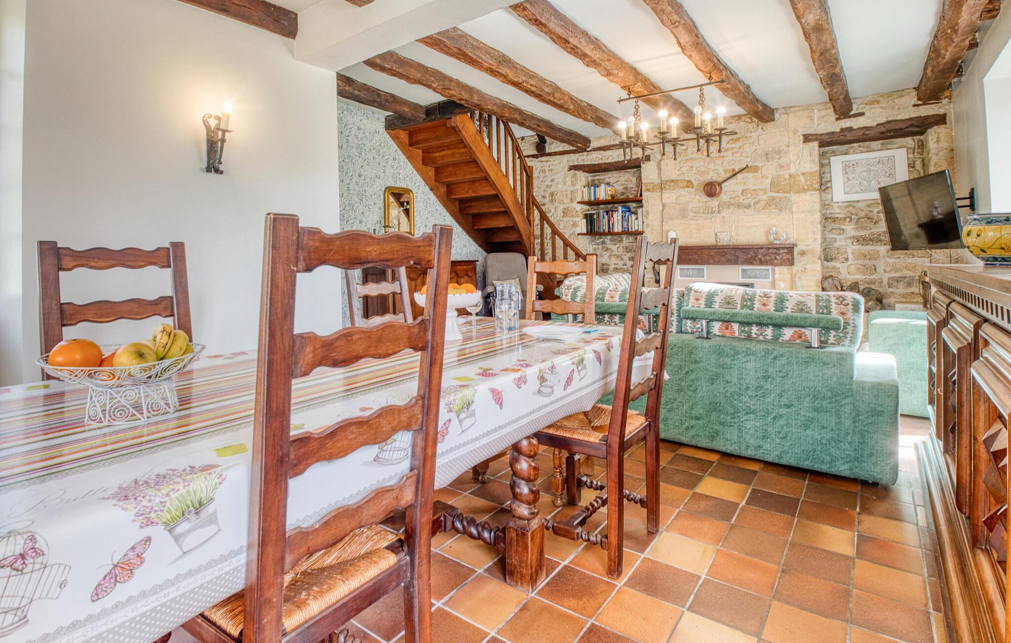 Genießen Sie einen entspannten Urlaub in diesem charmanten Ferienhaus, das durch seine ruhige Lage, die authentische Bauweise und eine gemütliche Ausstattung besticht. Spüren Sie die warme Atmosphäre des Innenraums mit freiliegenden Holzbalken, Natursteinwänden und stilvollen Holzmöbeln. Machen Sie es sich im Wohnzimmer auf den bequemen Sofas vor dem Kamin gemütlich oder verbringen Sie gesellige Stunden im großen Essbereich. Die separate Küche bietet Platz zum Kochlöffel schwingen und gemeinsamen Speisen.
