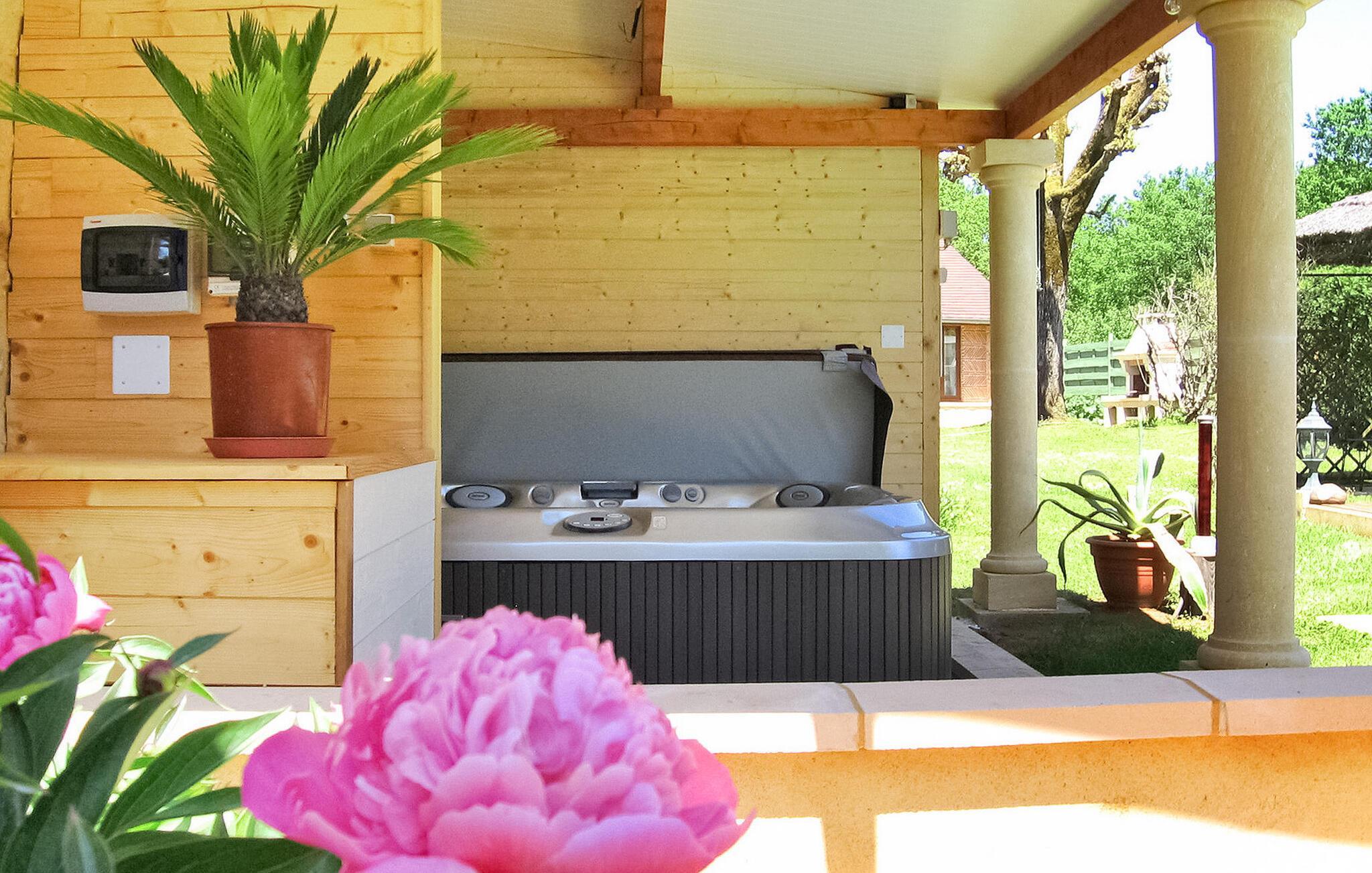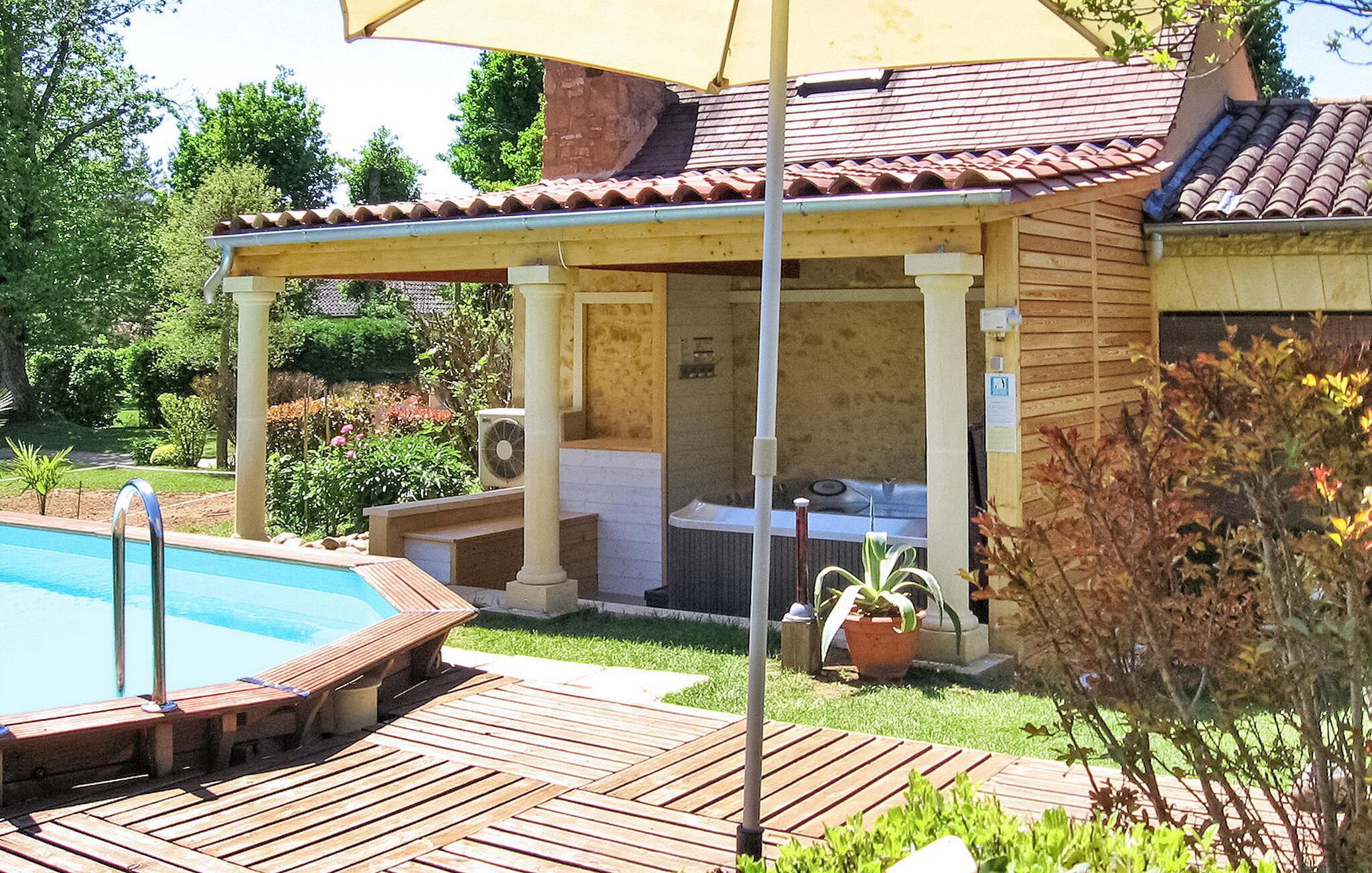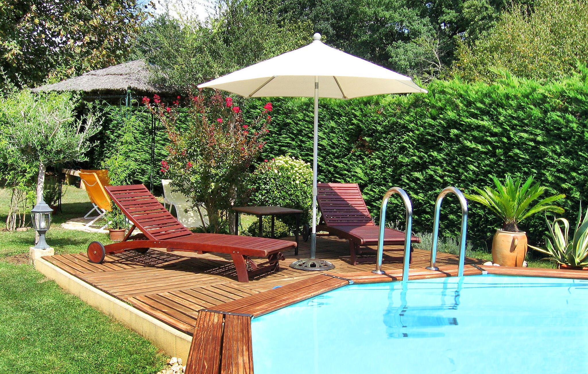Dieses Ferienhaus im Perigord Noir liegt eingebettet in einer malerischen ländlichen Umgebung und bietet einen ruhigen Aufenthalt inmitten eines Obst- und Gemüsegartens. Im Erdgeschoss befinden sich ein gemütliches Wohnzimmer mit dekorativem Kamin, eine moderne Küche und ein Schlafzimmer mit Etagenbett. Das zweite Schlafzimmer befindet sich im ersten Stock. Der Außenbereich verfügt über verschiedene Bäume, Pflanzen, Blumen und einen üppigen Rasen. Es verfügt über eine gepflasterte Terrasse mit Sitzgelegenheiten und Schatten, eine Südterrasse mit Grill und Blick auf den Pool, einen privaten Pool mit Alarmanlage und einen überdachten Whirlpool. La Feuillade ist ein Weiler in der Nähe von Carsac. In Carsac finden Sie alle Lebensmittelgeschäfte. Besuchen Sie in der Sommersaison sonntagmorgens den Markt in Carsac, um sich mit frischen lokalen Produkten einzudecken. Genießen Sie Ihren Ferienhausurlaub in der Dordogne im Quercy - Périgord. Bitte beachten Sie: Die Eigentümer wohnen vor Ort in einem separaten Haus und eine nahegelegene Straße (Sarlat-Souillac) kann gelegentlich zu Lärmbelästigungen führen, auch wenn sie vom Grundstück aus nicht einsehbar ist.
