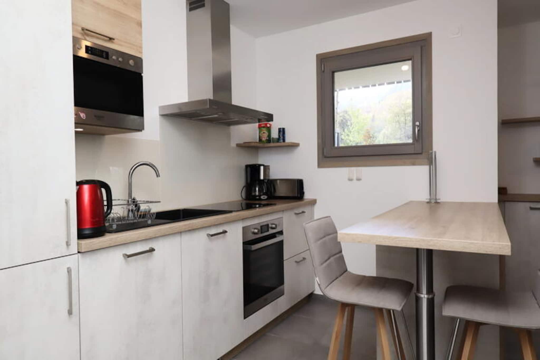 Residenz im Herzen des Dorfes Servoz, am Ausgangspunkt zahlreicher Wanderungen und 6,5 km von den Skiliften entfernt. Ideal für einen Urlaub mit Familie oder Freunden, bieten wir Ihnen in Servoz, einem authentischen und charmanten Dorf, 4 Zimmer von ca. 72 m², die Platz für bis zu 6 Personen bieten. Die Wohnung liegt im Erdgeschoss und verfügt über eine große Eckterrasse. Zusammensetzung der Wohnung: - Wohnzimmer mit Fernseher, Essbereich und Zugang nach draußen - Offene ausgestattete Küche: Kühlschrank, Gefrierschrank, Backofen, 4-Flammen-Kochfeld, Dunstabzugshaube, Geschirrspüler - 2 Schlafzimmer mit Doppelbett 140 - 1 großes Schlafzimmer mit 160 Doppelbetten - Badezimmer mit Badewanne - Separates WC mit Waschmaschine und Handtuchtrockner Zusätzliche Ausstattung: Geschlossene Tiefgarage. Haustiere erlaubt. Zusätzliche Dienstleistungen (optional, mit Aufpreis, vorbehaltlich Reservierung und Verfügbarkeit; für Preise kontaktieren Sie uns): - Vermietung einer WLAN-Box - Vermietung von Haushaltswäsche: Bettwäsche, Handtücher - Verleih von Kinderbetreuungsgeräten: Hochstuhl, Reisebett - Endreinigung Kissen, Bettdecken und Decken sowie Geschirr sind im Mietpreis enthalten. Im Mietpreis sind keine Haushaltsprodukte enthalten. Kaution (in Euro) – 260 Heizung - 1