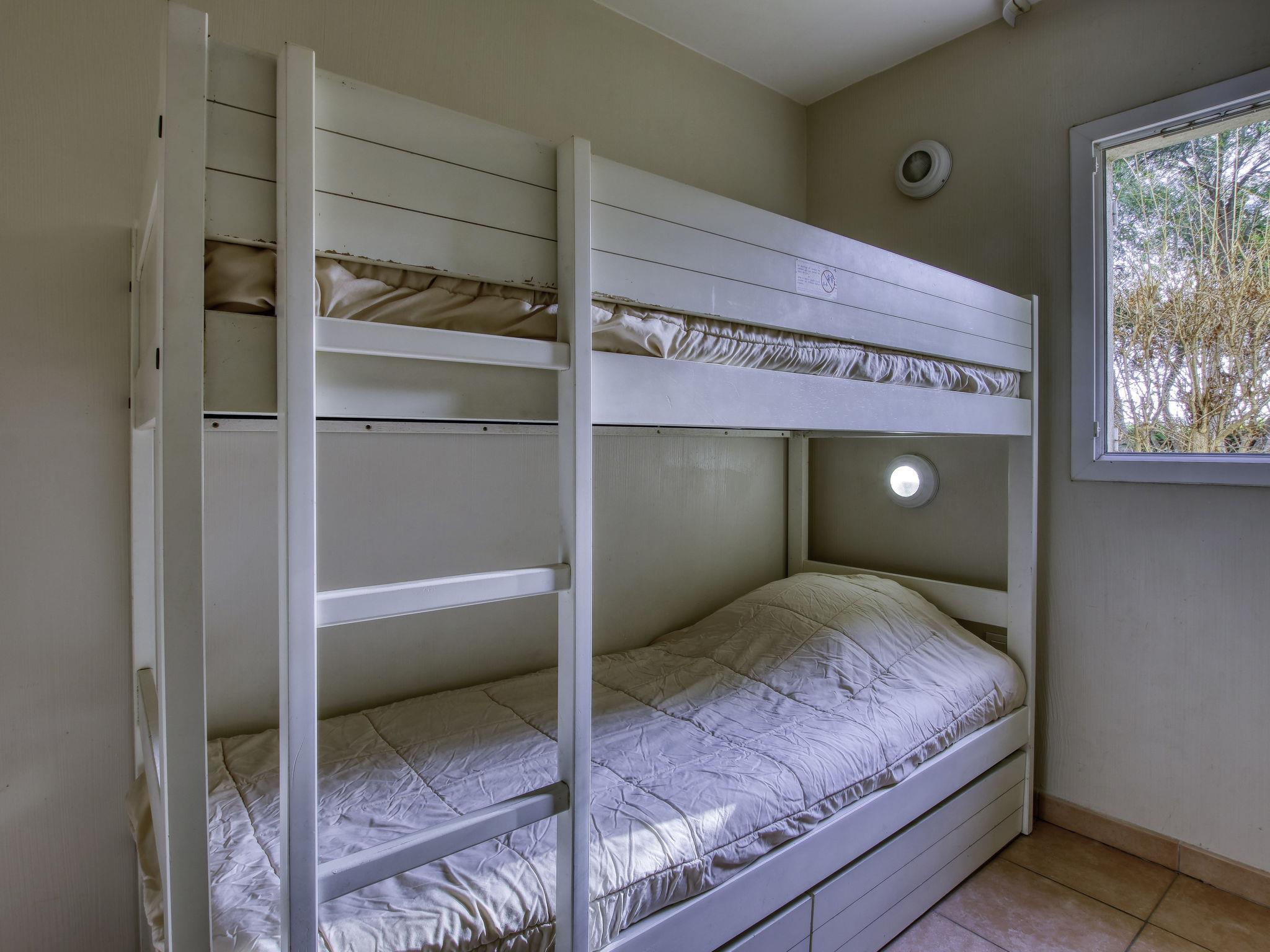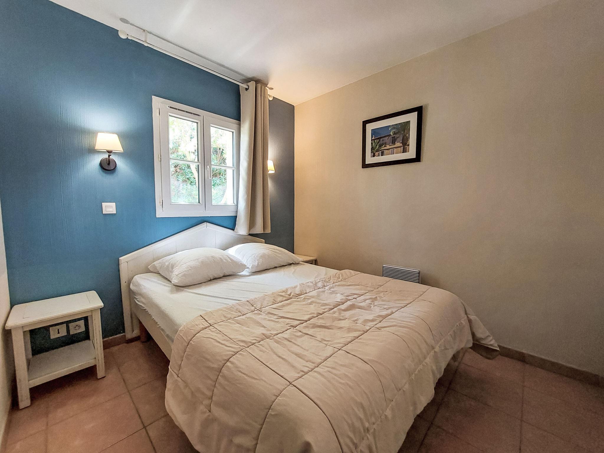 3-Zimmer-Wohnung 45 m2, im Erdgeschoss. Zweckmässig und schön eingerichtet: Wohn-/Esszimmer mit 1 Bett (80 cm, Länge 190 cm), TV (Flachbildschirm). Ausgang zur Terrasse. Kabine mit 1 x 2 Etagenbetten (80 cm, Länge 190 cm). 1 Zimmer mit 1 franz. Bett (140 cm, Länge 190 cm). Kochnische (Geschirrspüler, 4 Glaskeramikplatten, Toaster, Wasserkocher, Mikrowelle, Tiefkühler, elektrische Kaffeemaschine). Bad, Dusche/WC. E-Heizung. Terrasse 7 m2, überdacht, Westlage, kleiner Gartensitzplatz 3 m2, Westlage. Terrassenmöbel. Fernsicht auf das Meer. Zur Verfügung: Internet (Wireless LAN, extra). Parkplatz Nr. 401 (Niveau 1) (überdacht), Höhe 190 cm, Breite 230 cm. Bitte beachten: Maximal 1 Haustier/Hund erlaubt. TV nur FR. Rauchmelder. Der Garten ist nicht eingezäunt. Anstelle eines abgeschlossenen Schlafzimmers befinden sich manche Schlafplätze in einem offenen Bereich (Galerie, Nische etc.).