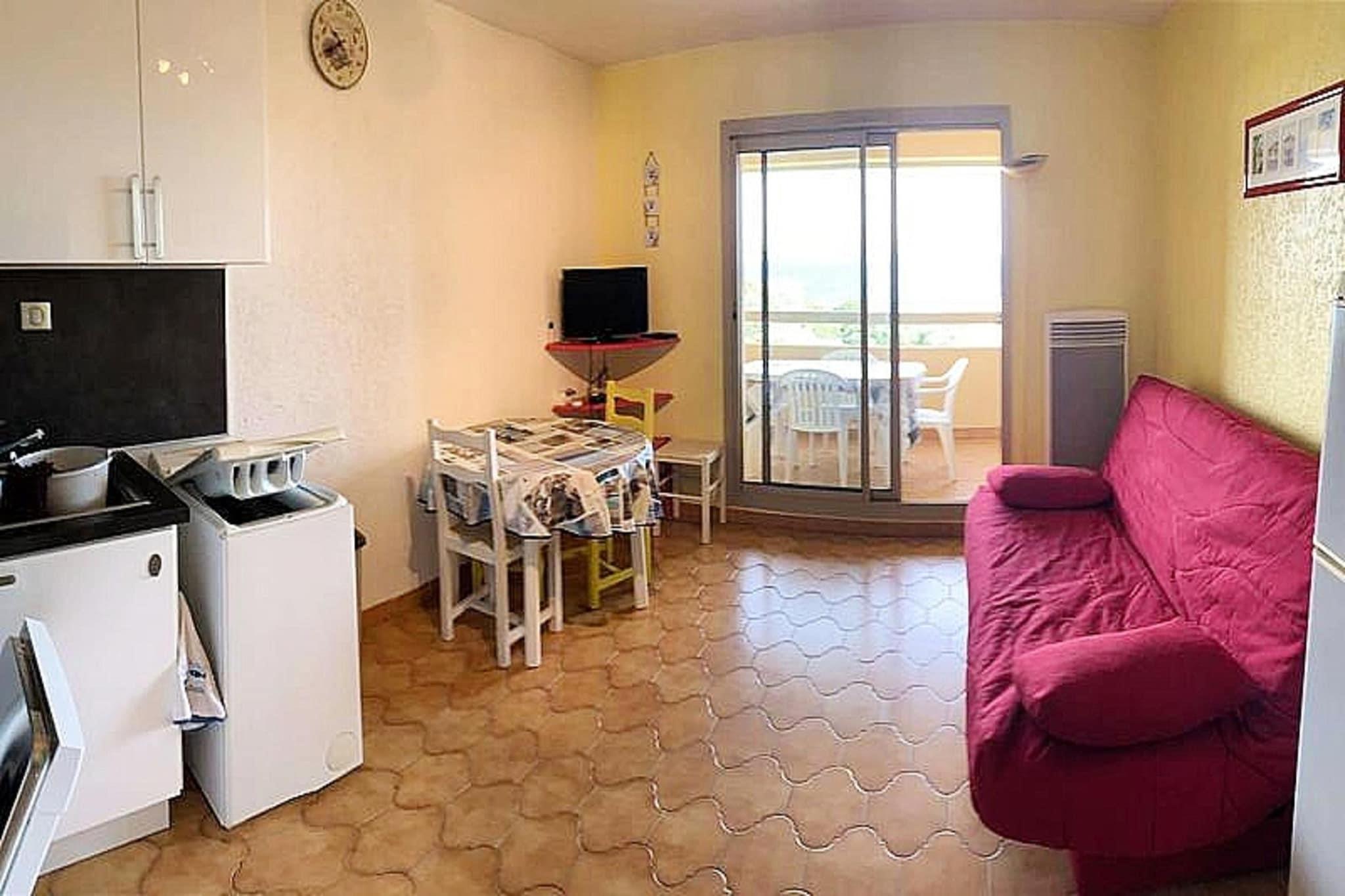 This charming apartment offers a comfortable stay for up to 4 guests, featuring a cabin with a bunk bed, a living room with a sofa bed, and a sea-view loggia for a relaxing atmosphere. The residence includes access to a swimming pool and tennis court (at an additional cost). Bed linens and towels are not provided, but they can be arranged for an additional charge. The apartment is not pet-friendly, and a tourist tax and a credit card deposit will be collected on-site upon arrival. The apartment is ideally located just 200 meters from the beach, offering easy access to the sea and stunning views. Enjoy the peaceful surroundings of a wooded residence while being close to the vibrant areas of Six Fours les Plages. The local attractions include the beautiful beaches, a variety of cafes, and markets, making it a perfect location for those who enjoy outdoor activities and local culture. The apartment features a fully equipped kitchen, ideal for preparing meals during your stay. The living space opens to the kitchen, creating a welcoming atmosphere for guests. The bathroom and separate toilet provide necessary amenities for your comfort, and the heating ensures a cozy environment during cooler months.
