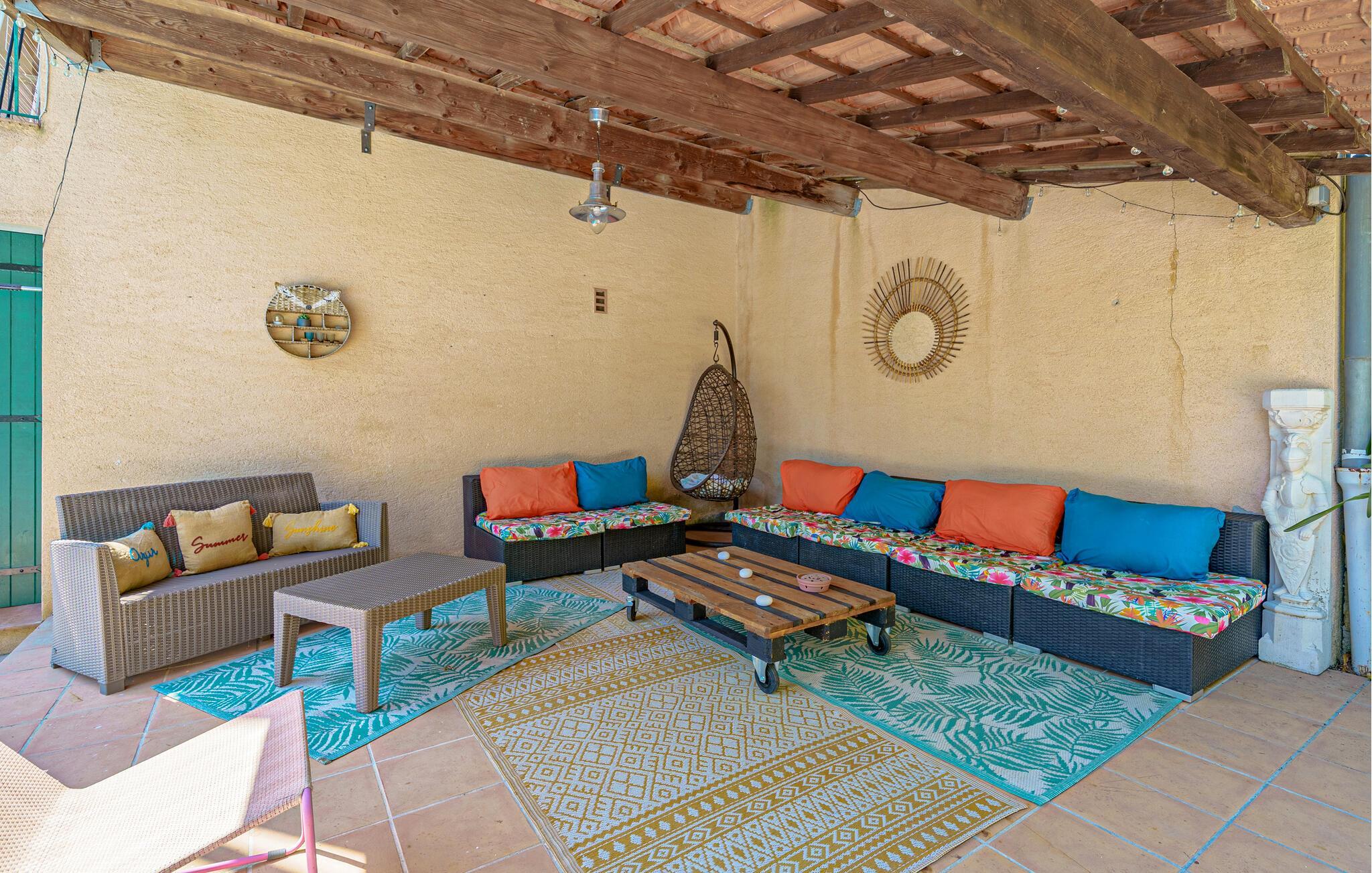 Treten Sie ein und lassen Sie sich vom provenzalischen Charme dieses liebevoll eingerichteten Urlaubsdomizils verzaubern. Schwingen Sie in der geräumigen, modernen Küche gemeinsam den Kochlöffel und nehmen Sie im stilvollen Ambiente des Essbereichs Platz. Machen Sie es sich nach einem langen Tag auf den gemütlichen Sofas bequem, lauschen Sie bei einer spannenden Lektüre dem Knistern des Kamins oder veranstalten Sie einen Spieleabend.
