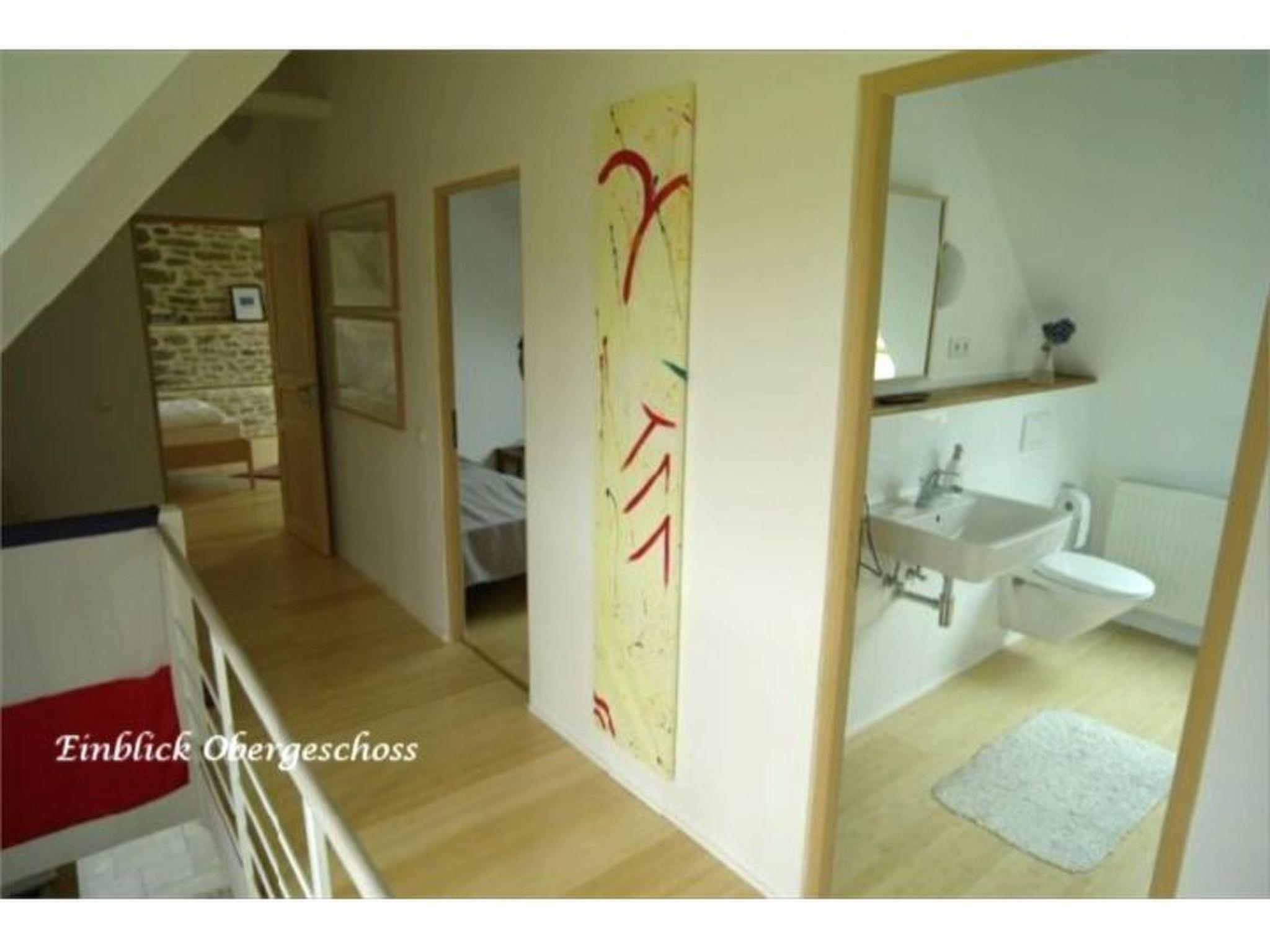 Im Erdgeschoss befindet sich der große, lichtdurchflutete Wohn-/Essbereich (ca. 50 m²) , mit freiem Zugang zur Küche (ca. 14 m²) und Blick in die weitläufige Landschaft. Es verfügt über eine hochwertige Ausstattung unter.anderem Rolf Benz Sofas, Massivholzmöbel aus Eiche, 42“ Philips HD TV, DVD Player und eine Stereoanlage mit Anschluss für Ihr iPhone/iPad, sowie eine voll ausgestattete Küche, in der auch Hobbyköche sich verwirklichen können. Optisches Schmuckstück des Wohnraumes ist der große, offene Steinkamin aus dem Jahre 1845 (nicht funktionsfähig). Der Essbereich bietet Platz für sechs Personen, ist mit hellen Eichenmöbeln und einem gemütlichen Wamsler Stahl-Kaminofen ausgestattet. Die Küche bietet einen zusätzlichen Essplatz für zwei Personen und ist mit einer modernen Einbauküche, umfangreichen technischen Equipment und Küchenutensilien ausgestattet (5-flammiger SMEG-Gasherd, Spülmaschine, Backofen, Kühl-Gefrierkombi, Mikrowelle, Arzberg-Geschirr, etc.). Das Bad im Erdgeschoss verfügt über eine Dusche, WC, Waschmaschine, Trockner und ein Fenster. Das gesamt erste Obergeschoss ist mit Bambus-Parkett ausgestattet, dort befinden sich die drei Schlafzimmer. Zwei ausgestattet mit je einem Doppelbett und einem 3-türigen Kleiderschrank, sowie ein Duschbad mit WC: Das Haupt-Schlafzimmer bietet ein Doppelbett, 160 x 200 cm, hat eine Raumgröße von ca. 25 m² und ein Rollo zur Verdunkelung am Fenster. Das Superior-Schlafzimmer hat ein Doppelbett, 160 x 200 cm, eine Raumgröße von ca. 20 m² und auch Rollo zur Verdunkelung am Dachfenster. Das dritte Standard-Schlafzimmer verfügt über zwei Einzelbetten, je 100 x 200 cm, hat eine Raumgröße von ca. 12 m² und ebenfalls ein Rollo zur Verdunkelung am Dachfenster. Das Haus verfügt über eine Gas-Etagenheizung sowie Heizkörper in jedem Raum.