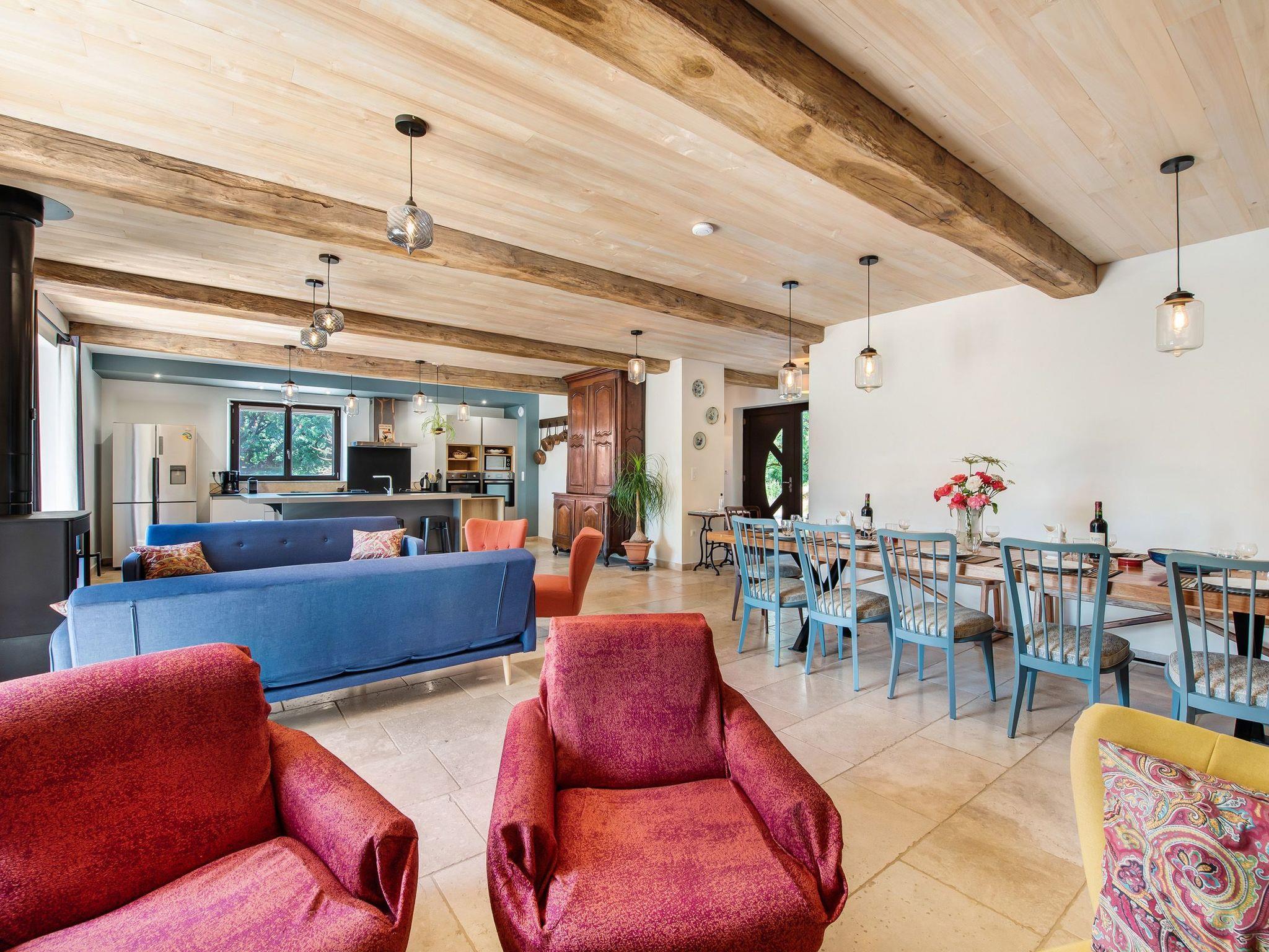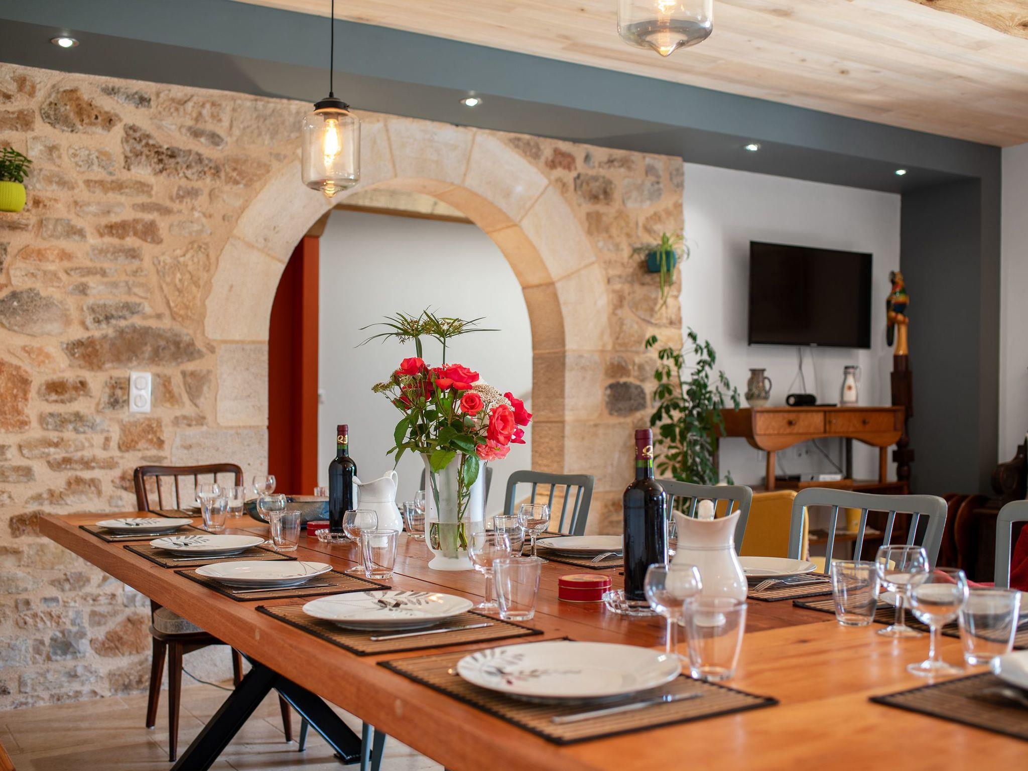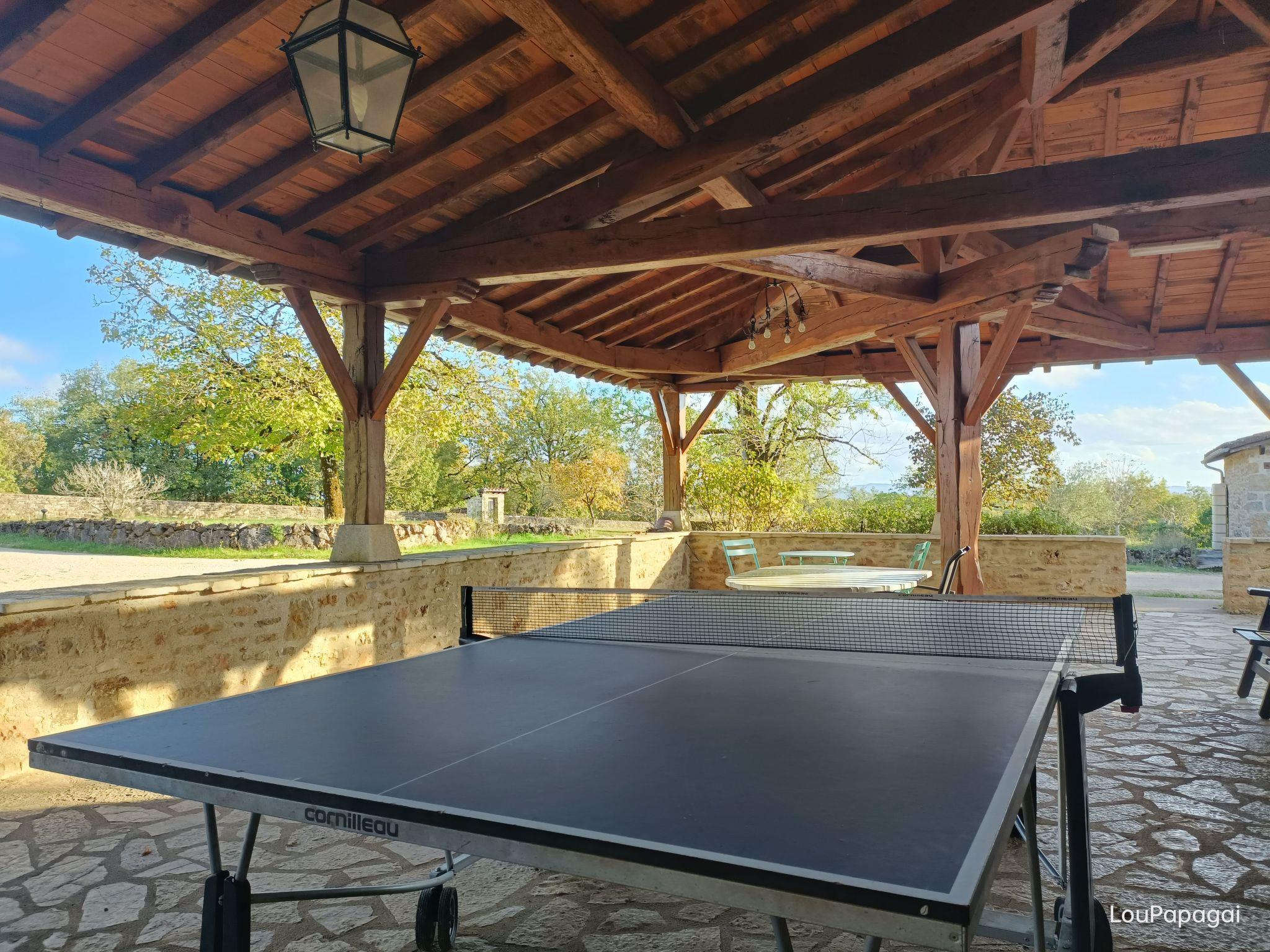 Eine riesige überdachte Terrasse von 140 m² umgibt La Volière und wird zum Lieblingsort Ihres Urlaubs: Tischtennisplatte, Grillkamin, Pizzaofen, Schatten und Kühle im Sommer, Überdachung in der Zwischensaison. Es ist der ideale Ort für große Festessen und festliche Abende.