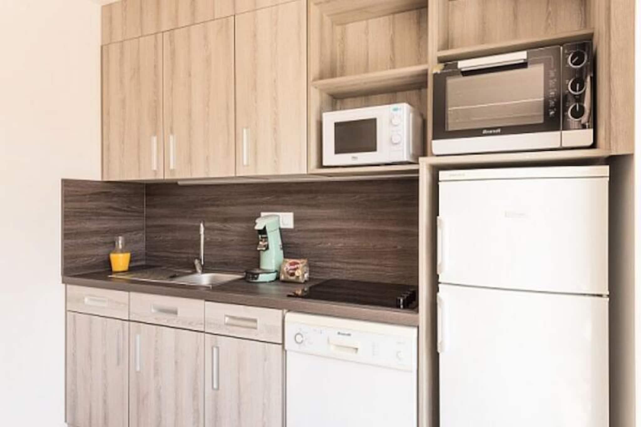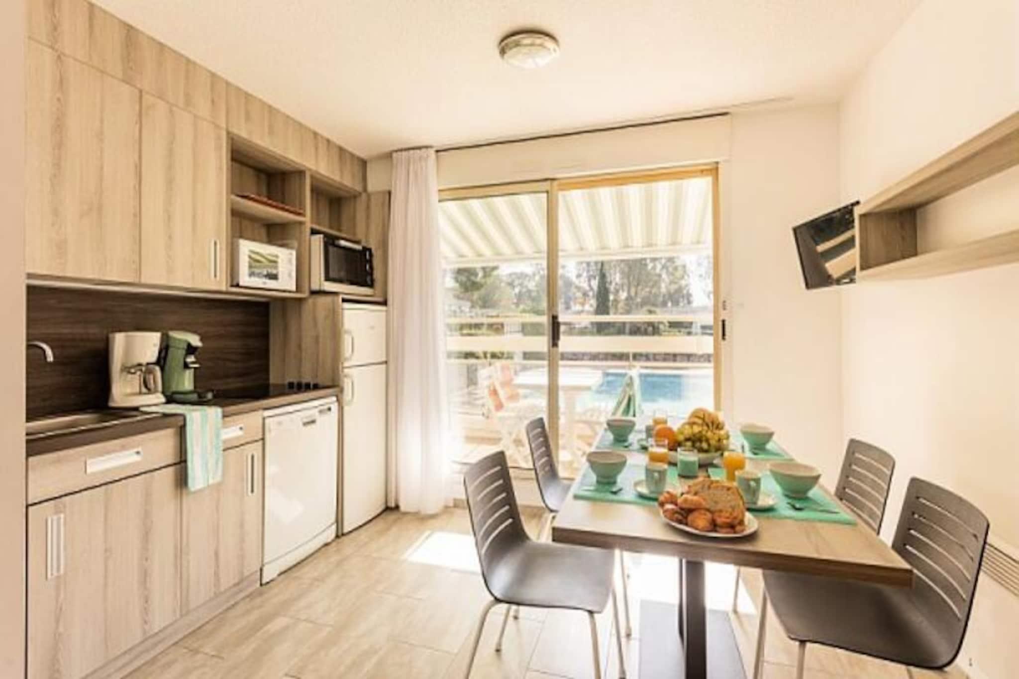 Nestled in a lush green setting, this charming holiday home offers a relaxing retreat just 300m from a small cove and 1.5 km from a sandy beach. The property is pet-friendly, allowing your furry friends to join you for an additional fee. It features a cozy living area with a sofa bed and trundle bed, as well as a separate bedroom with a comfortable double bed. The accommodation is perfect for families or small groups, offering ample space for everyone to unwind. The property is ideally located near several local attractions, including shops just 500m away, and a bakery conveniently located across from the residence. Saint-Raphaël, once a fishing village, is known for its mild climate and beautiful coastline, perfect for scenic walks or excursions. The area offers a variety of cafes and markets where you can explore the local culture and cuisine, providing plenty of opportunities to relax and enjoy the surroundings. Inside, the apartment is well-equipped with a fully functional kitchen, allowing you to prepare your favorite meals. The bathroom features a separate shower and WC for added convenience. You can also enjoy the balcony with a garden view, perfect for outdoor moments. Additional amenities include a TV, free Wi-Fi access in the residence lounge, and a refreshing outdoor pool available from April to October.