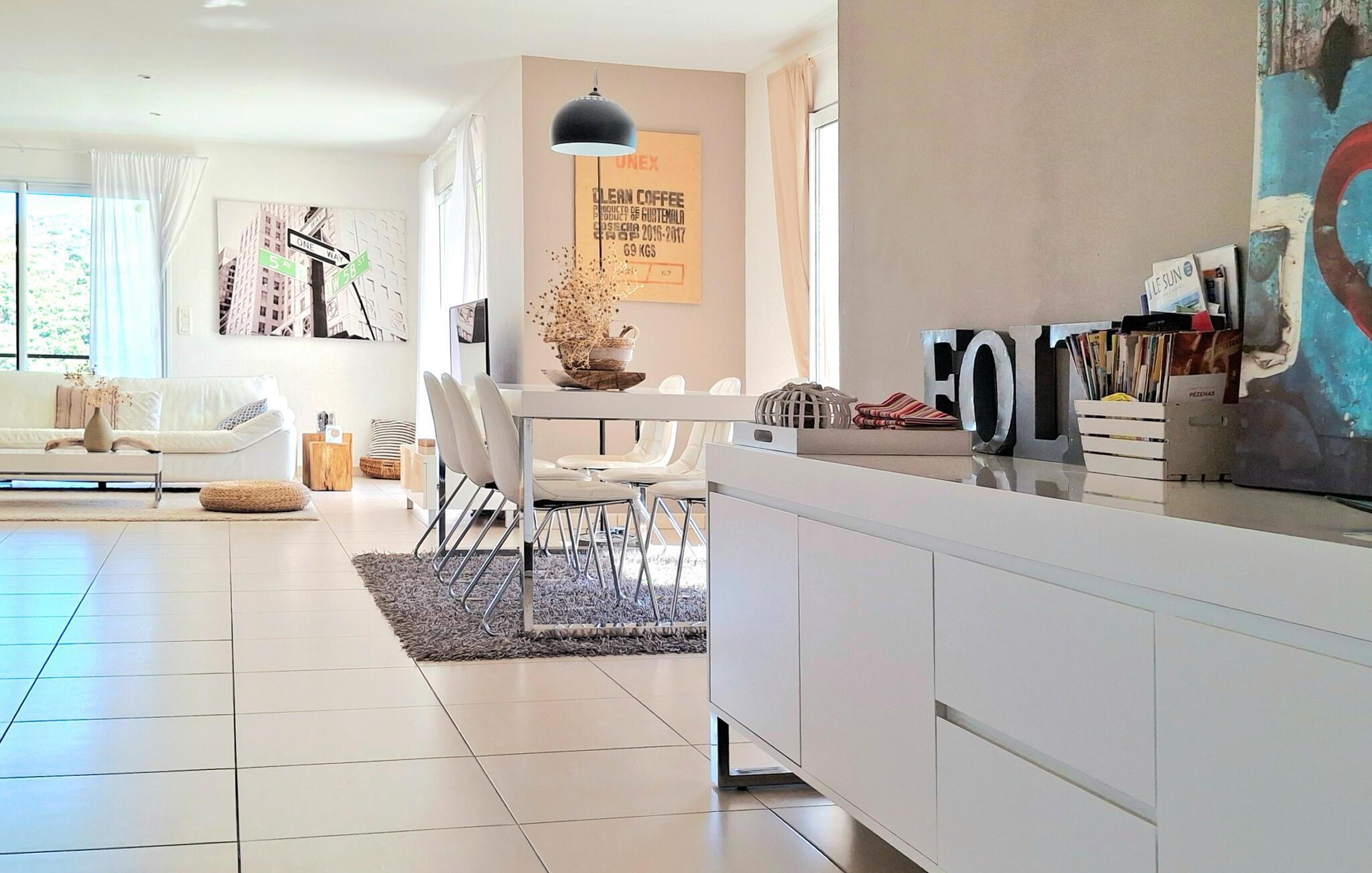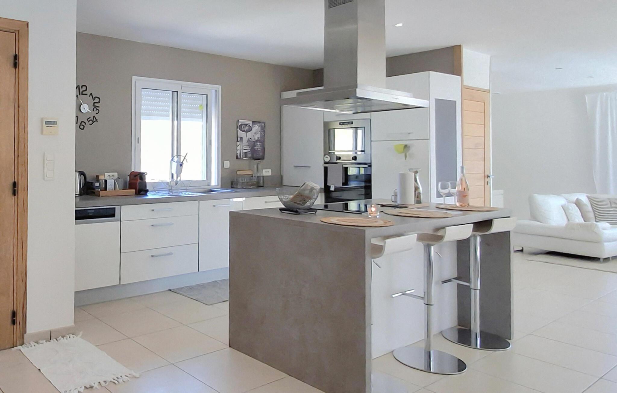 Neben einer ultramodernen Küche mit Kochinsel, die sich zum großen Wohnzimmer hin öffnet, verfügt die geschmackvoll eingerichtete Unterkunft zudem über ein Badezimmer mit sowohl Wanne als auch Dusche.