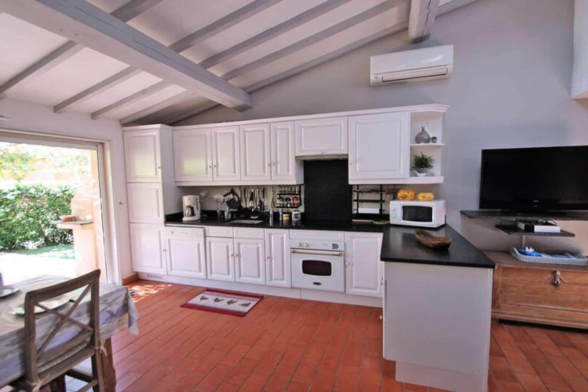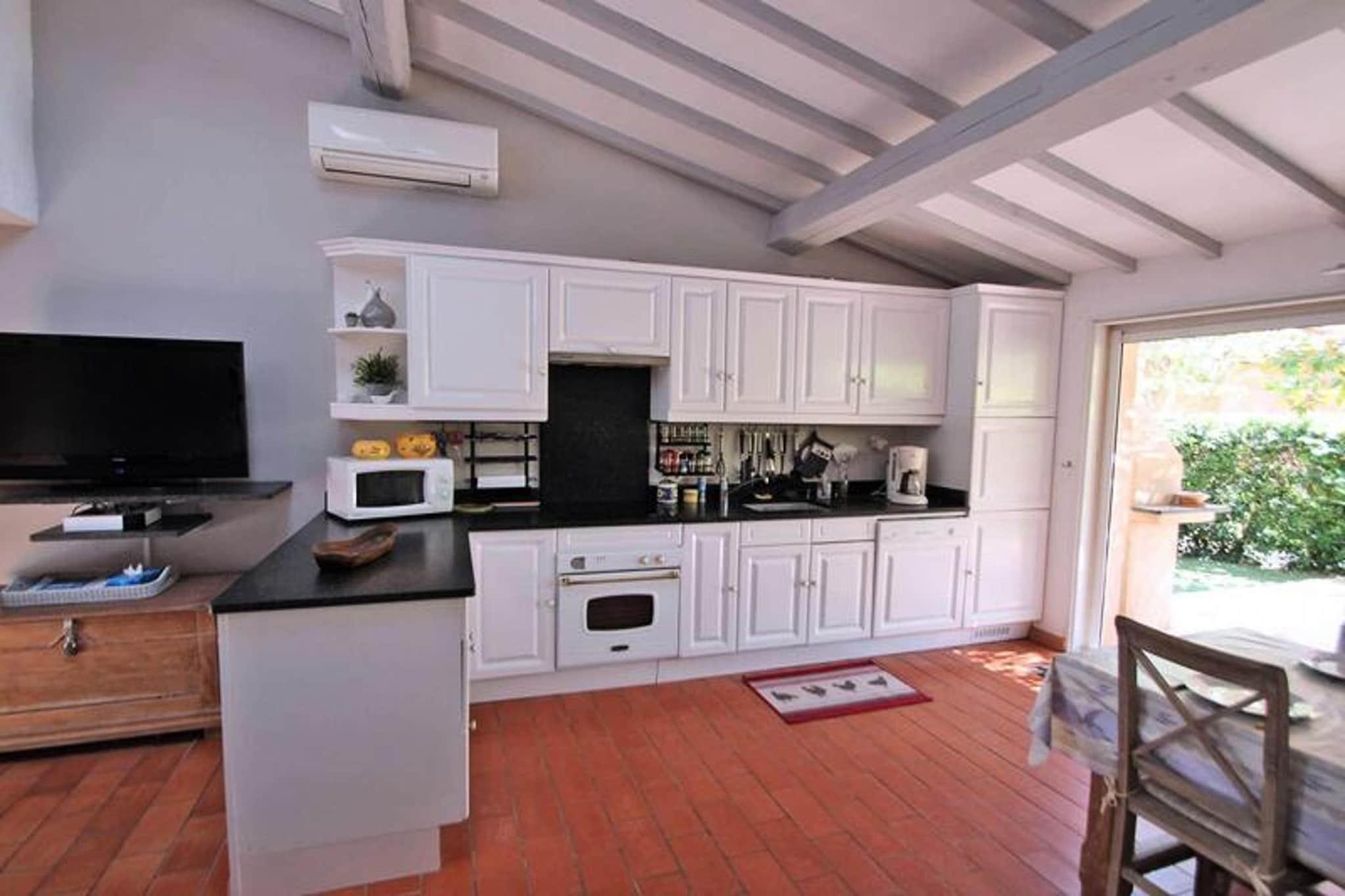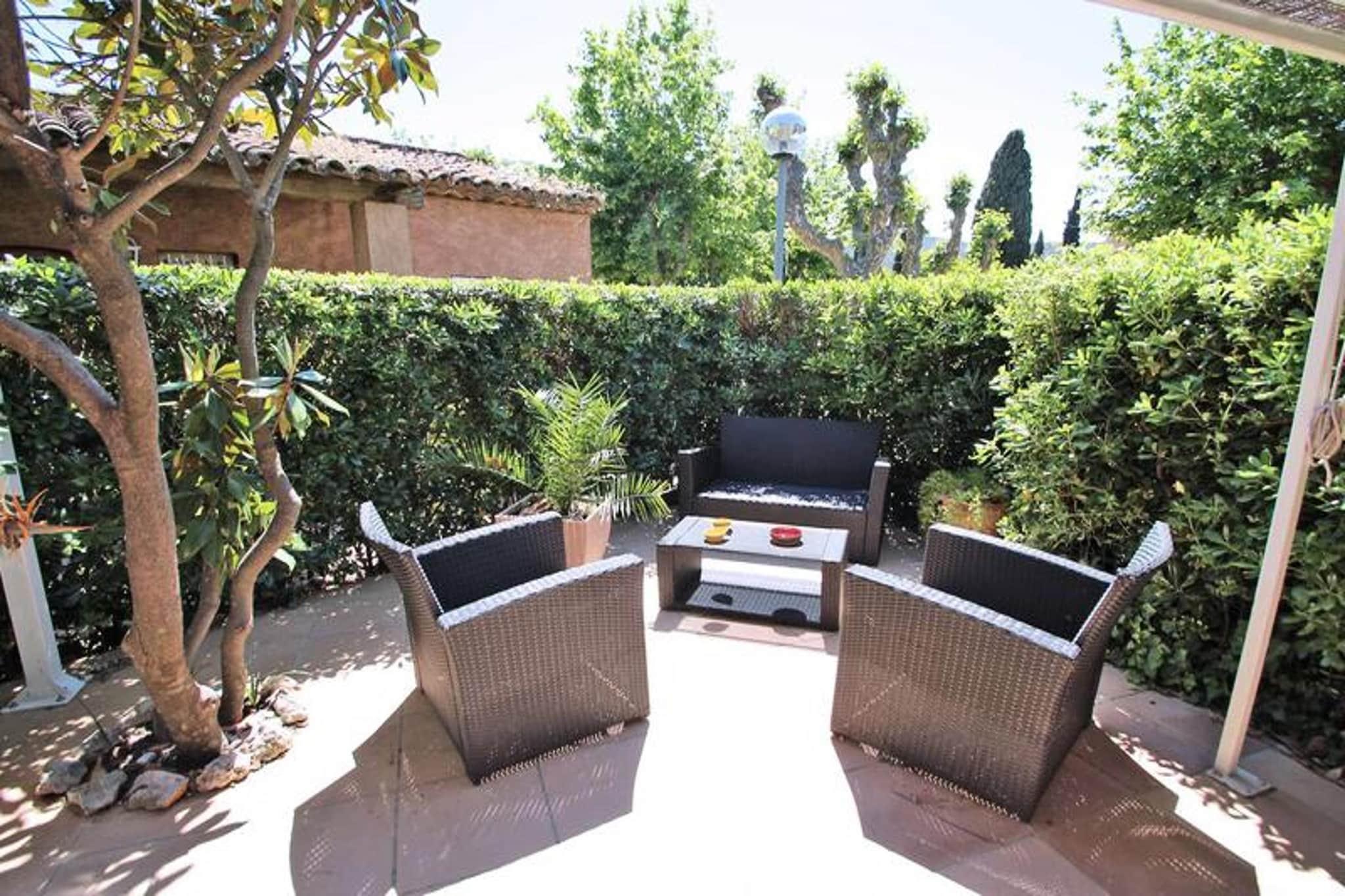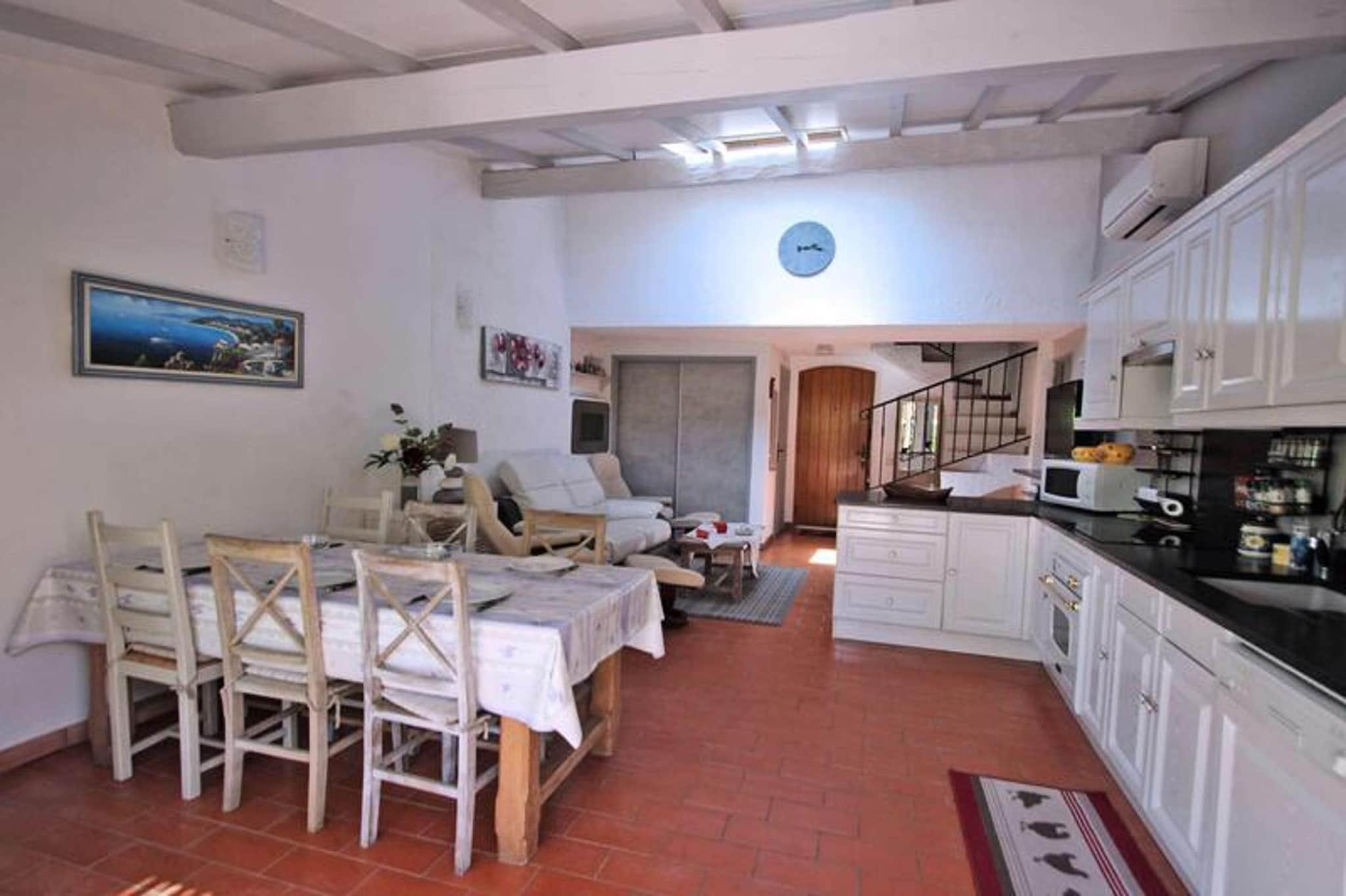 Dieses charmante 4-Zimmer-Reihenhaus von 55 m² befindet sich in der sicheren Résidence Les Bleuets d'Azur, bietet einen gemütlichen provenzalischen Stil und bietet Platz für bis zu 6 Gäste. Im Erdgeschoss finden Sie ein gemütliches Wohnzimmer mit einem Ledersofa, Sesseln und einem großen Flachbildfernseher mit Canal Sat. Die schöne amerikanische Küche verfügt über einen Tisch aus gebleichter Eiche, Stühle und die wichtigsten Geräte, darunter einen Geschirrspüler, eine Kaffeemaschine und einen Kühlschrank, mit Zugang zur Terrasse. Im Erdgeschoss befinden sich außerdem ein Schlafzimmer mit Doppelbett, ein Kabinenschlafzimmer mit Etagenbetten, ein Badezimmer mit Badewanne und ein separates WC. Im Obergeschoss bietet die Suite ein Doppelbett und ein eigenes Badezimmer mit Dusche und Waschbecken. Das Haus ist ideal gelegen, nur 1,2 km vom Stadtzentrum und 1,5 km vom Strand entfernt, sodass Sie die Umgebung bequem erkunden können. Geschäfte sind nur 100 Meter entfernt und die Residenz liegt günstig in der Nähe des Radwegs, der Sie mit dem Stadtzentrum und den Stränden verbindet, sodass Sie die Umgebung bequem erkunden können, ohne ein Auto zu benötigen. Die ruhige Umgebung sorgt für einen erholsamen Aufenthalt und Haustiere sind auf Anfrage willkommen. Draußen verfügt das Haus über eine schöne Terrasse mit Gartenmöbeln, einen Garten mit Kunstrasen und einen Holzkohlegrill für Mahlzeiten im Freien. Die Unterkunft ist klimatisiert und für Ihren Komfort ist Pocket-WLAN im Preis inbegriffen. Die Unterkunft ist mit allen wichtigen Annehmlichkeiten ausgestattet, einschließlich einer Waschmaschine, um einen komfortablen Aufenthalt für Familien und Gruppen zu gewährleisten.