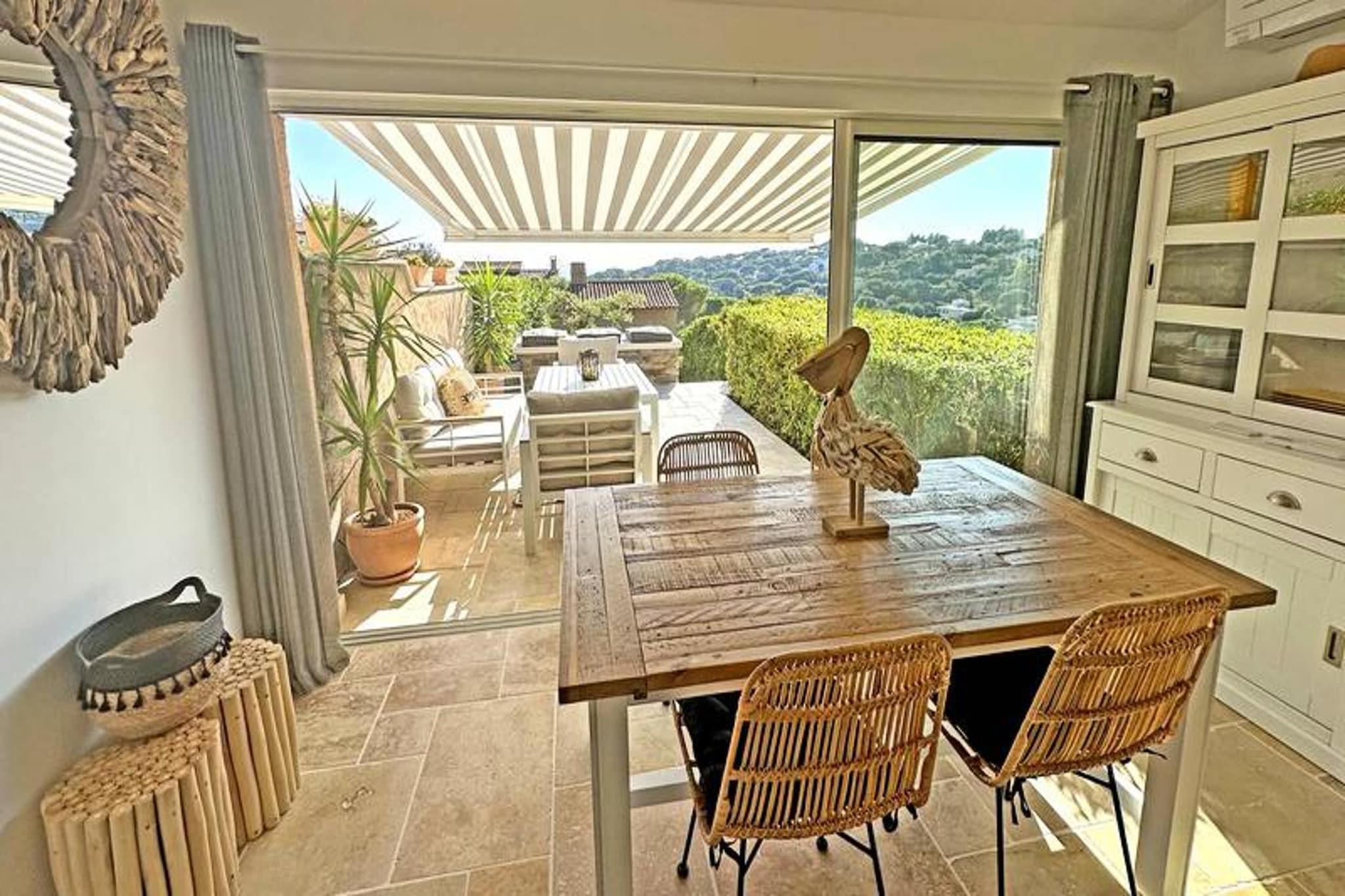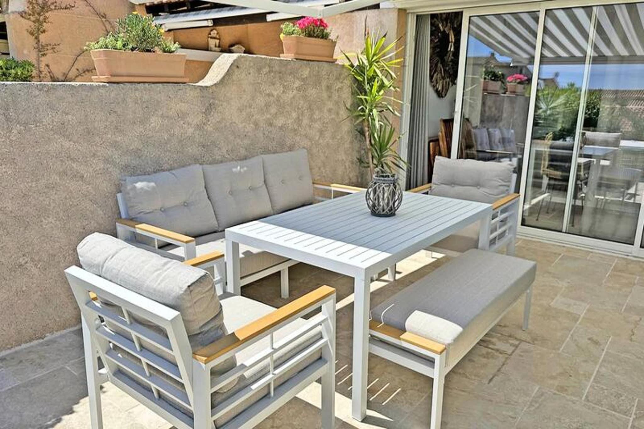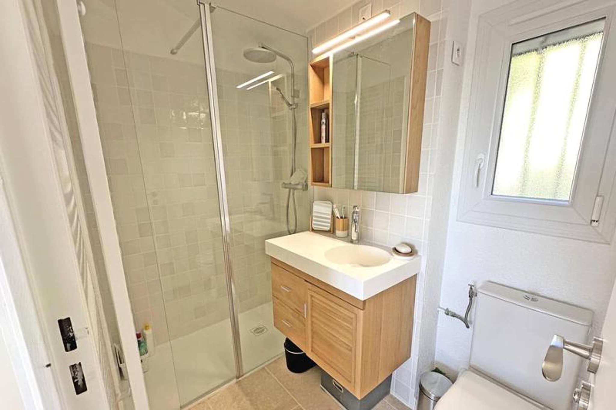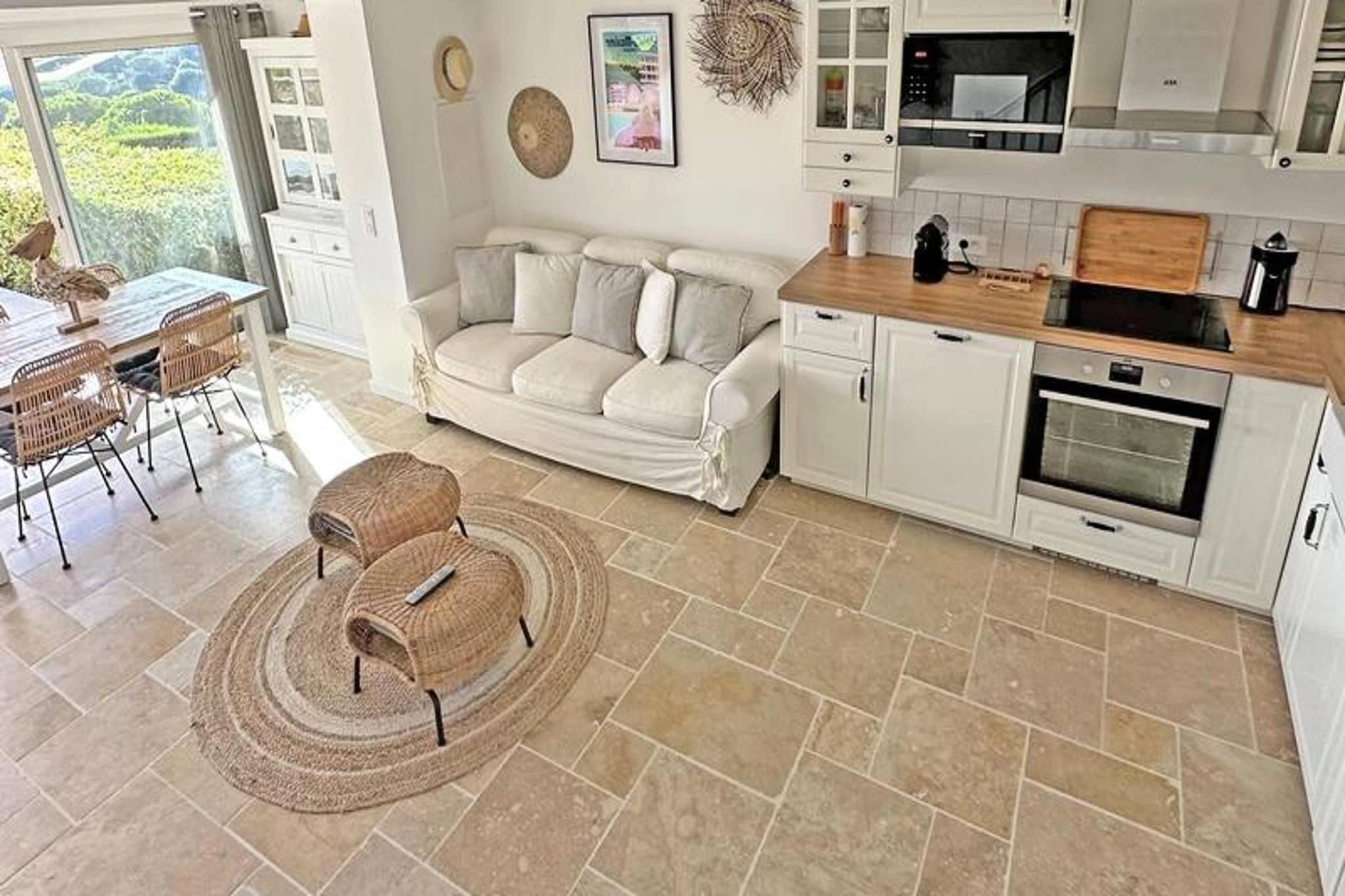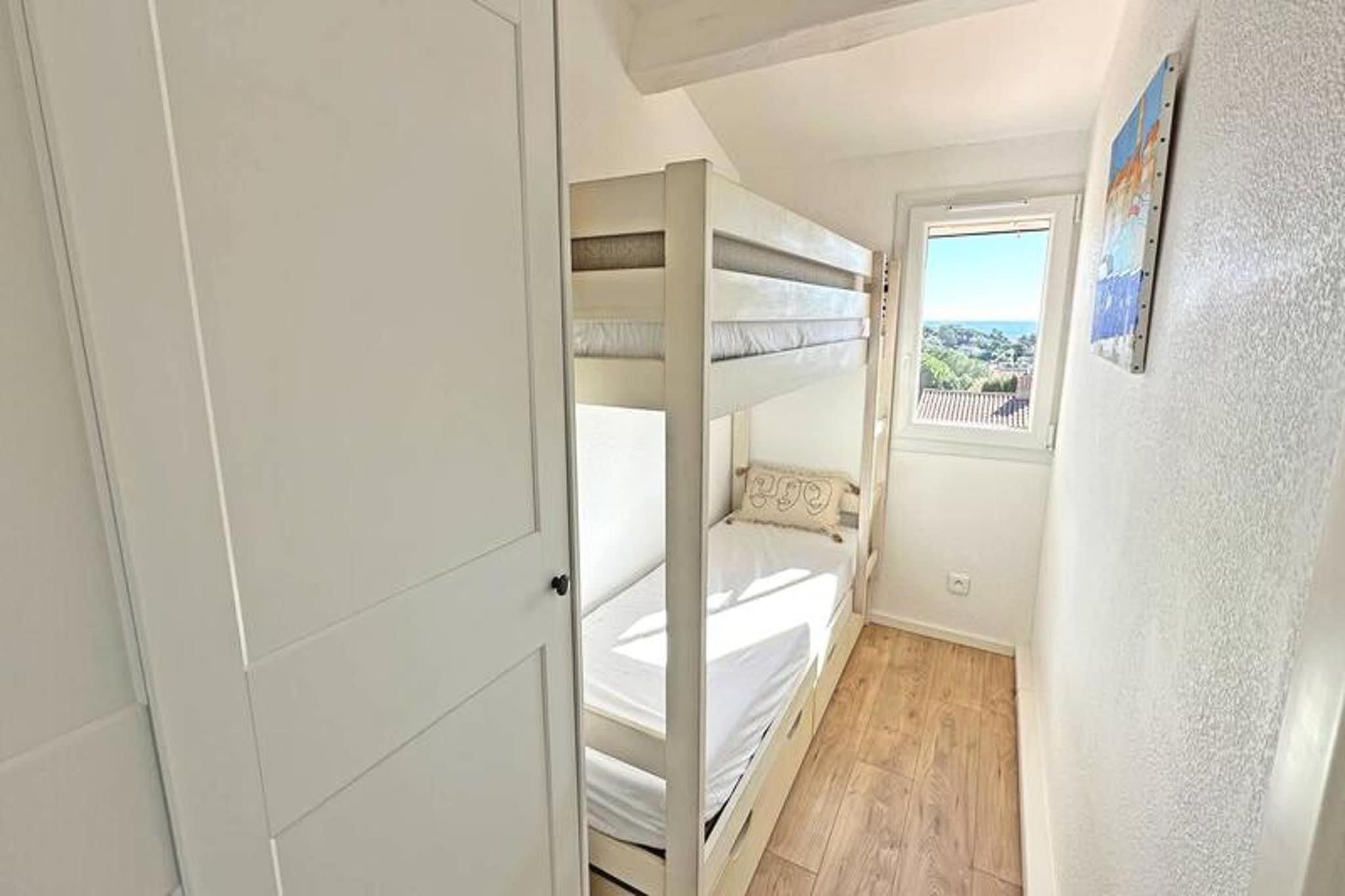 Dieses charmante 3-Zimmer-Reihenhaus bietet einen komfortablen Aufenthalt für bis zu 4 Gäste. Das im Jahr 2023 kürzlich renovierte Anwesen verfügt über eine Klimaanlage in beiden Schlafzimmern und einen privaten Parkplatz. Im Erdgeschoss befindet sich ein gemütliches Wohnzimmer mit einem 3-Sitzer-Sofa, einem Flachbild-TV, einem Essbereich und Zugang zum Außenbereich. Die offene Küche ist komplett ausgestattet mit Kühlschrank, Gefrierschrank, Geschirrspüler, Waschmaschine, Backofen, Mikrowelle, Nespresso-Kaffeemaschine und 3-Flammen-Induktionskochfeld sowie den wichtigsten Küchenutensilien. Das Haus liegt in einer ruhigen, von Bäumen gesäumten und sicheren Residenz und bietet einen ruhigen Rückzugsort. Die beiden klimatisierten Schlafzimmer befinden sich im Obergeschoss. Schlafzimmer 1 verfügt über ein 140 cm breites Doppelbett und einen Kleiderschrank, während Schlafzimmer 2 über zwei 90 cm breite Etagenbetten verfügt, die beide einen wunderschönen Meerblick bieten. Das Badezimmer verfügt über eine ebenerdige Dusche, einen Waschtisch und ein WC. Die 35 m² große Terrasse ist mit Gartenmöbeln und einer Markise ausgestattet und eignet sich perfekt, um den Meerblick zu genießen. Zusätzlich zum privaten Parkplatz bietet die Residenz einen Gemeinschaftspool, der saisonal von Mai bis Oktober geöffnet ist. Das Anwesen verfügt außerdem über WLAN für Konnektivität und liegt 1.600 Meter vom Strand und 2.800 Meter vom Stadtzentrum entfernt. Bitte beachten Sie, dass Haustiere nicht gestattet sind. Diese ruhige, familienfreundliche Unterkunft ist ideal für einen erholsamen Urlaub.