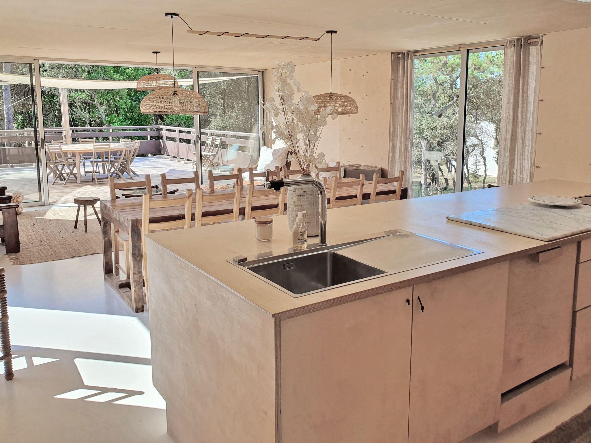 Unser Ziel: ein diskreter visueller Fußabdruck, um im Wald zu verschwinden. Auf der Sanddüne über den Felsen der Bucht gelegen, bietet das Haus poetische Ausblicke auf den Ozean und den Wald. Die Innenwände aus hellem Holz verleihen den modernen Linien der Villa Weichheit und Wärme. Die Dekoration ist sorgfältig von France Durez entworfen und die Ausstattung ist zahlreich. Alles ist auf Ihren Komfort und Ihre Entspannung ausgerichtet: ein Innenpool, eine Sauna, mehrere Terrassen, Räume, die für jeden Ihrer Wünsche konzipiert wurden.