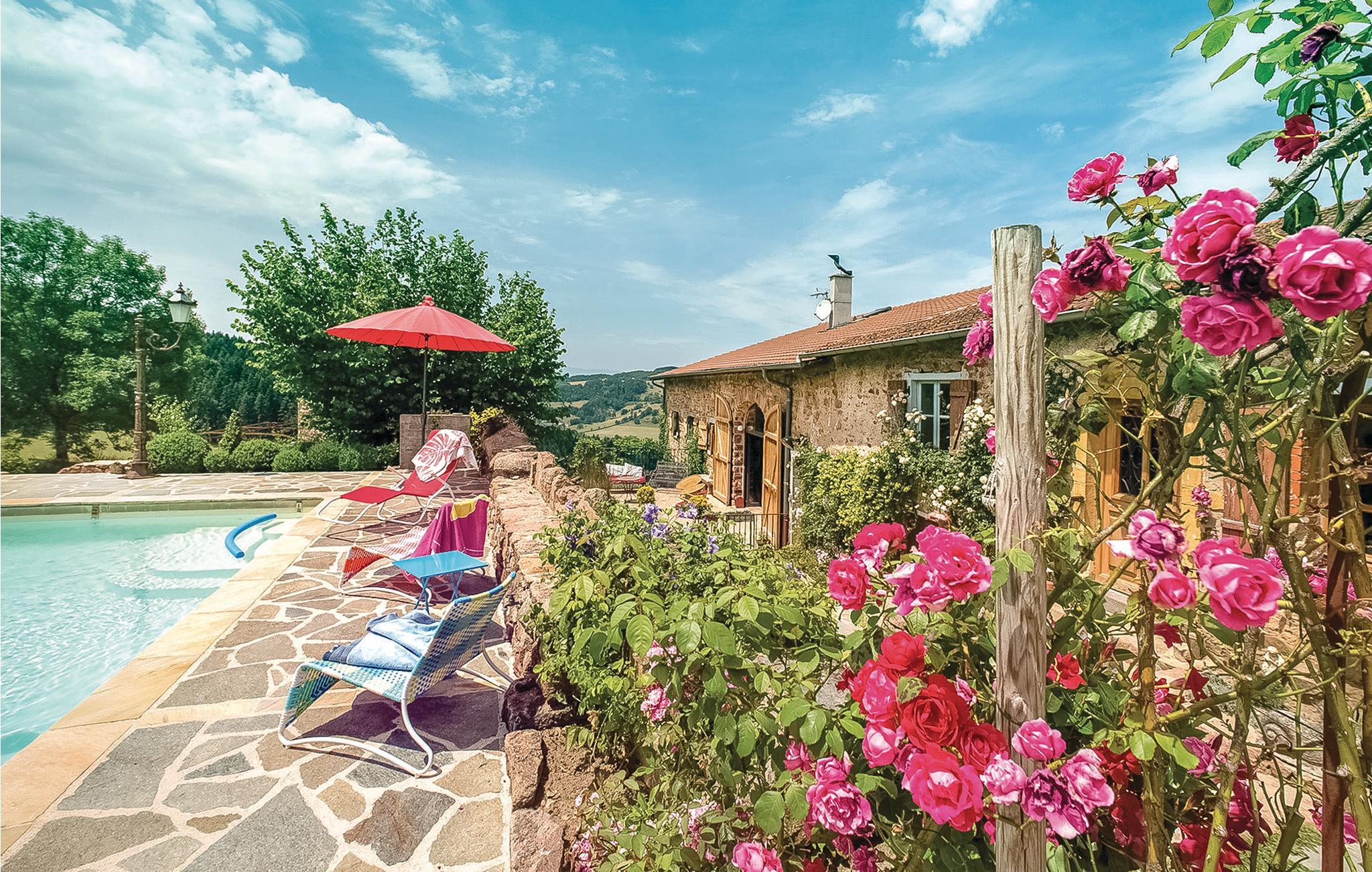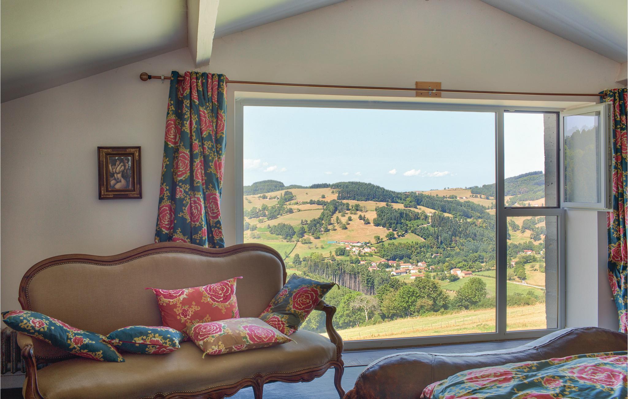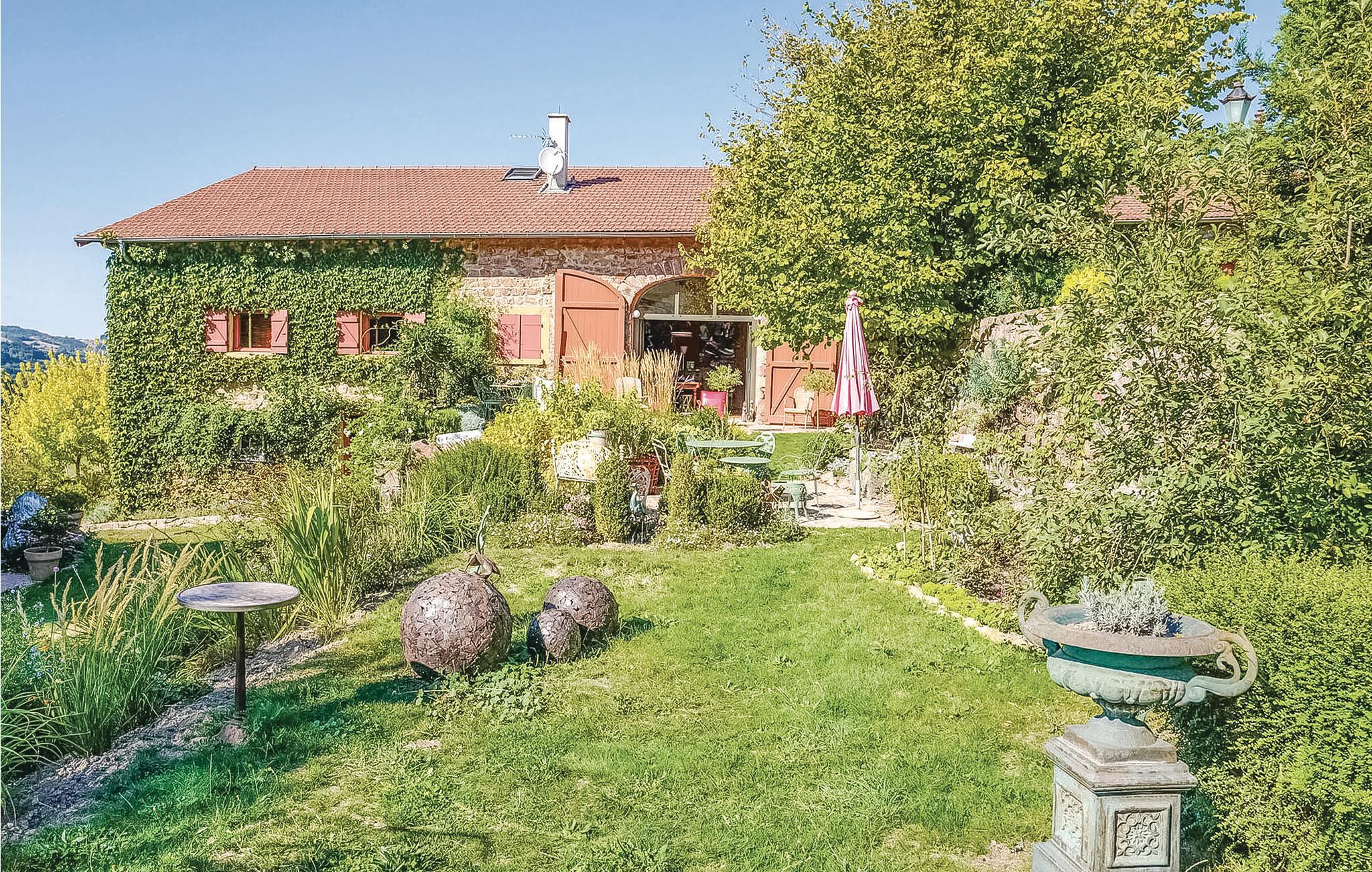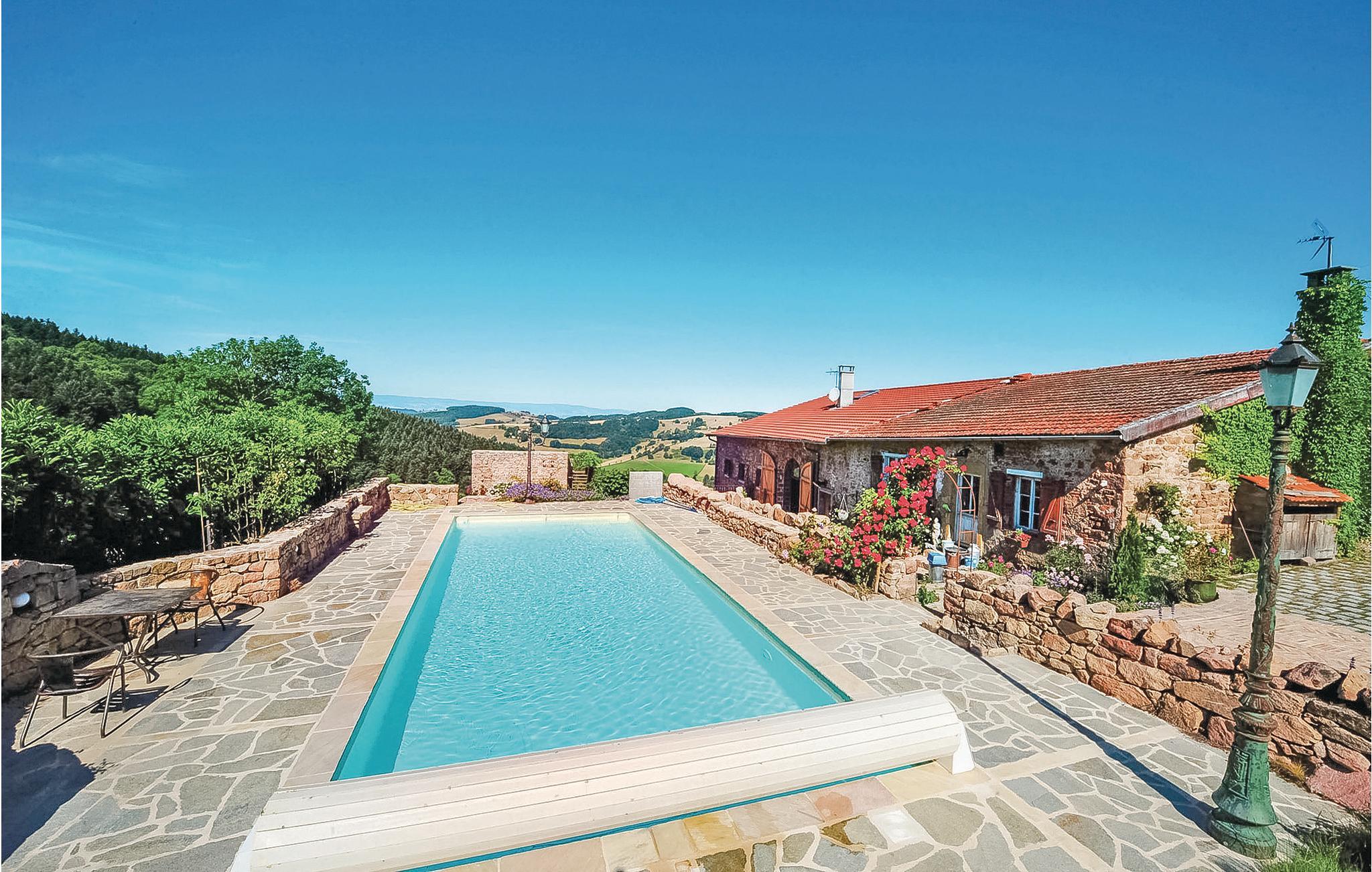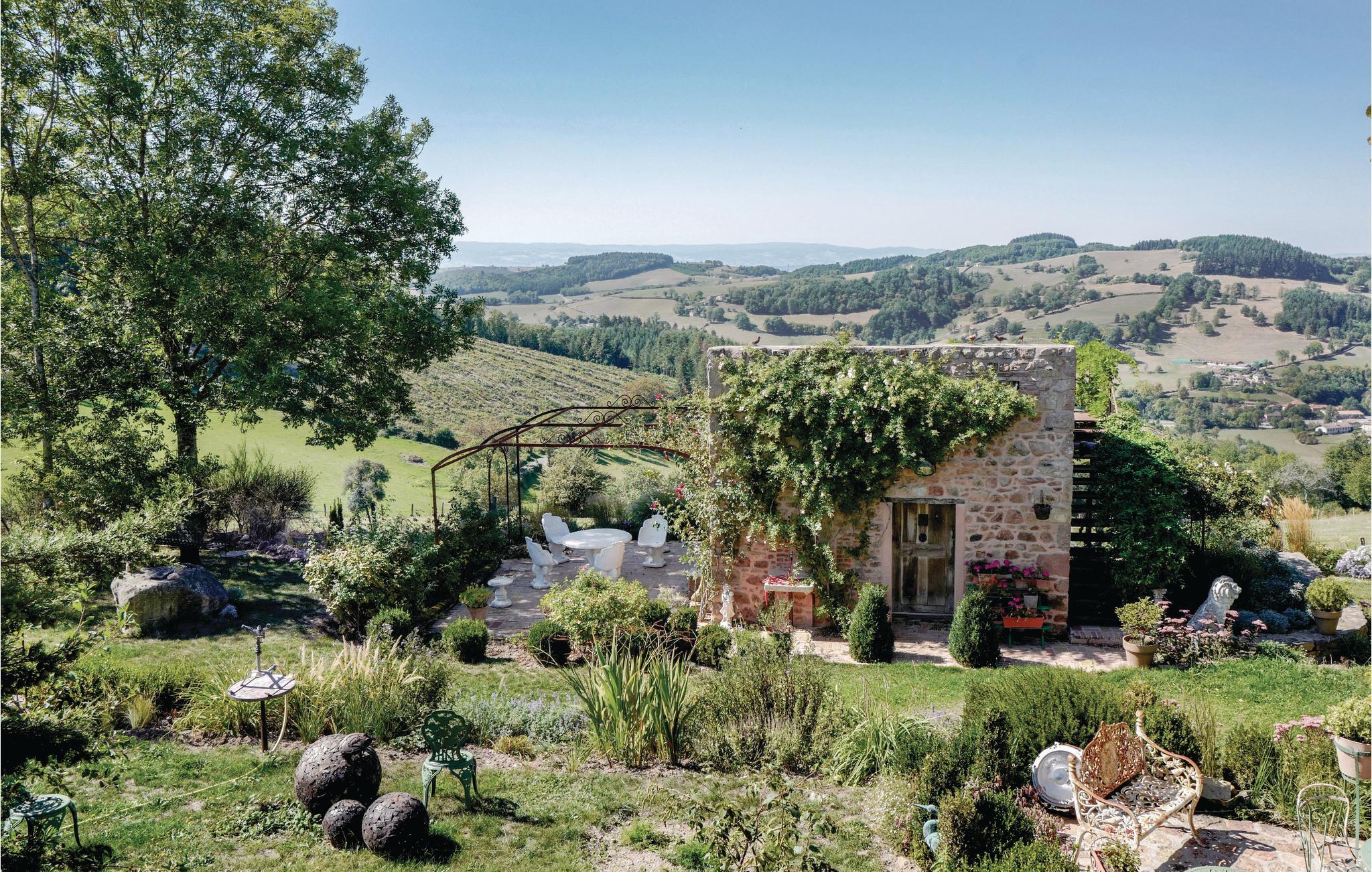 Dieses geräumige Ferienhaus mit viel Charme liegt in der grünen und sehr reizenden Region der Monts du Beaujolais. Durch seine Lage inmitten der Natur ist das ganz aus Stein gebaute Haus ein kleines Stück vom Paradies. Es öffnet sich zu einem idyllischen, 2.000 m² großen Garten mit Rasen hin und verfügt über einen großen Privatpool und drei Terrassen. Von der sonnenverwöhnten Dachterrasse auf einem kleinen Nebengebäude aus bietet sich den Gästen ein atemberaubender Panoramablick. Durch große Glasfronten und eine bezaubernde Dekoration ist im Inneren des Hauses für eine angenehme Atmosphäre gesorgt. Neben der Zimmerdekoration, einer geschickten Mischung aus modernen, barocken und rustikalen Gegenständen, tragen selbstverständlich auch komfortable und hochwertige Möbel zu Ihrem Wohlbefinden bei. Über den von den Eigentümern bereitgestellten Bluetooth-Lautsprecher können Sie Ihre eigene Musik abspielen.