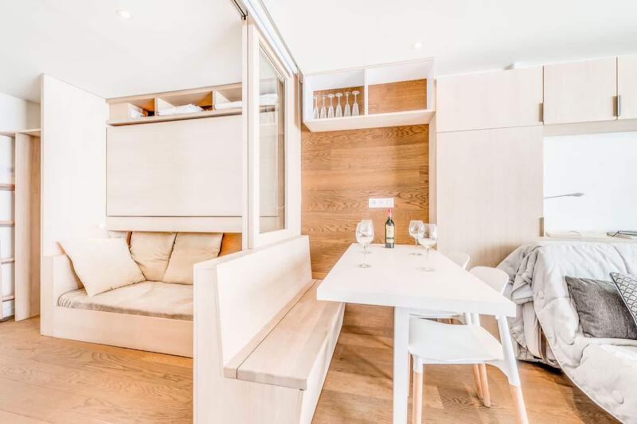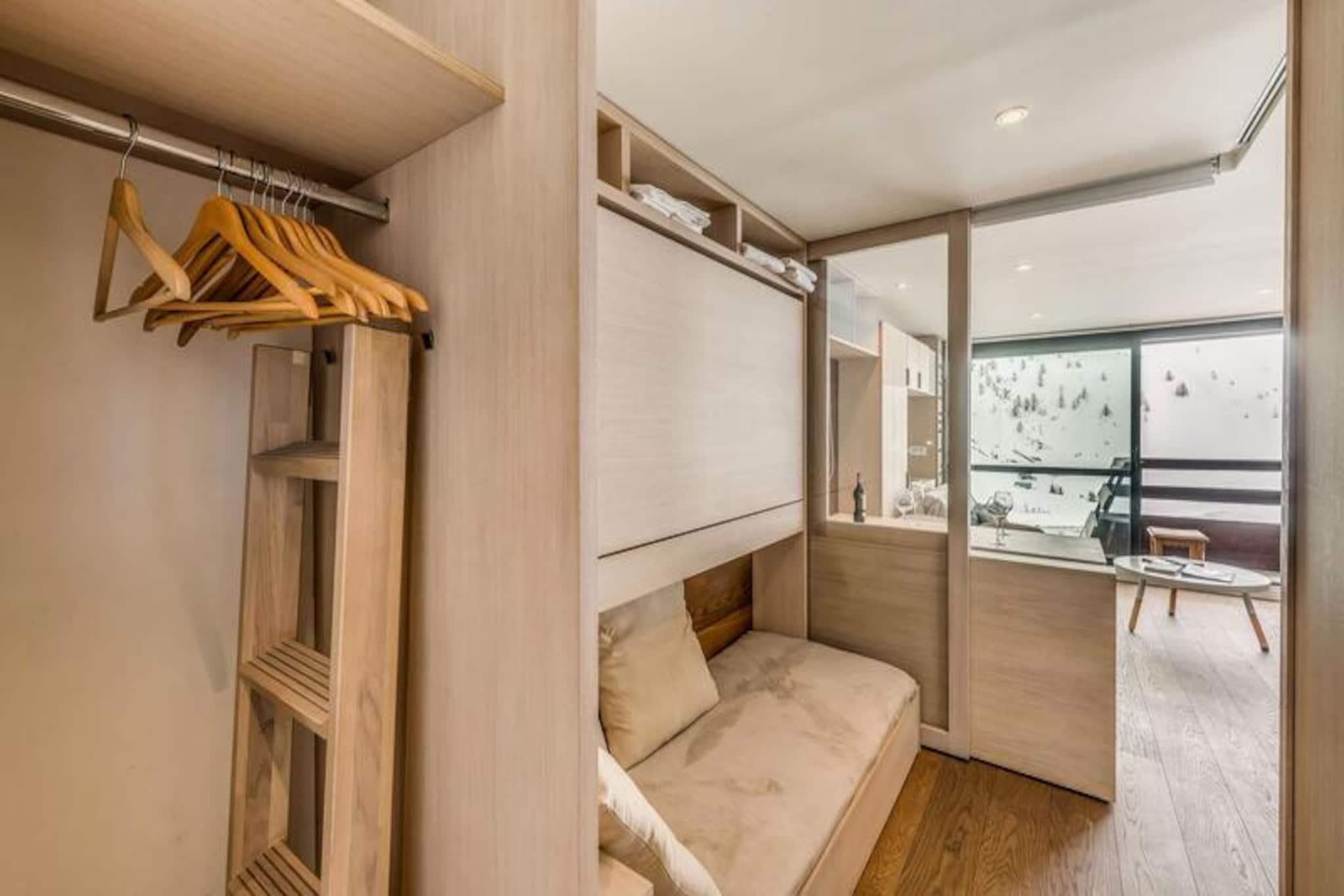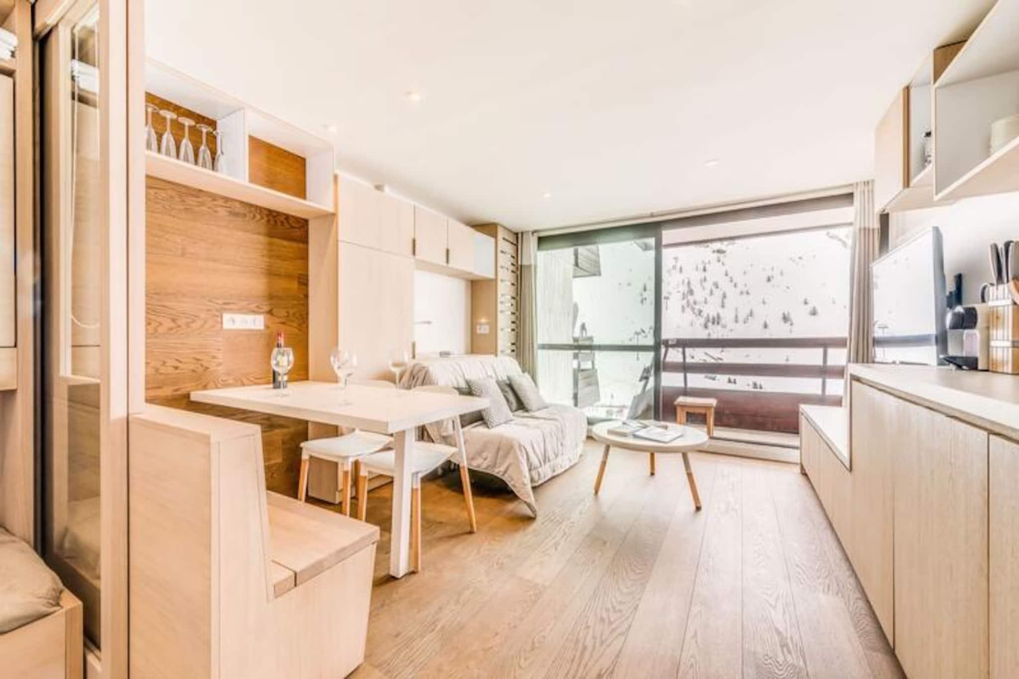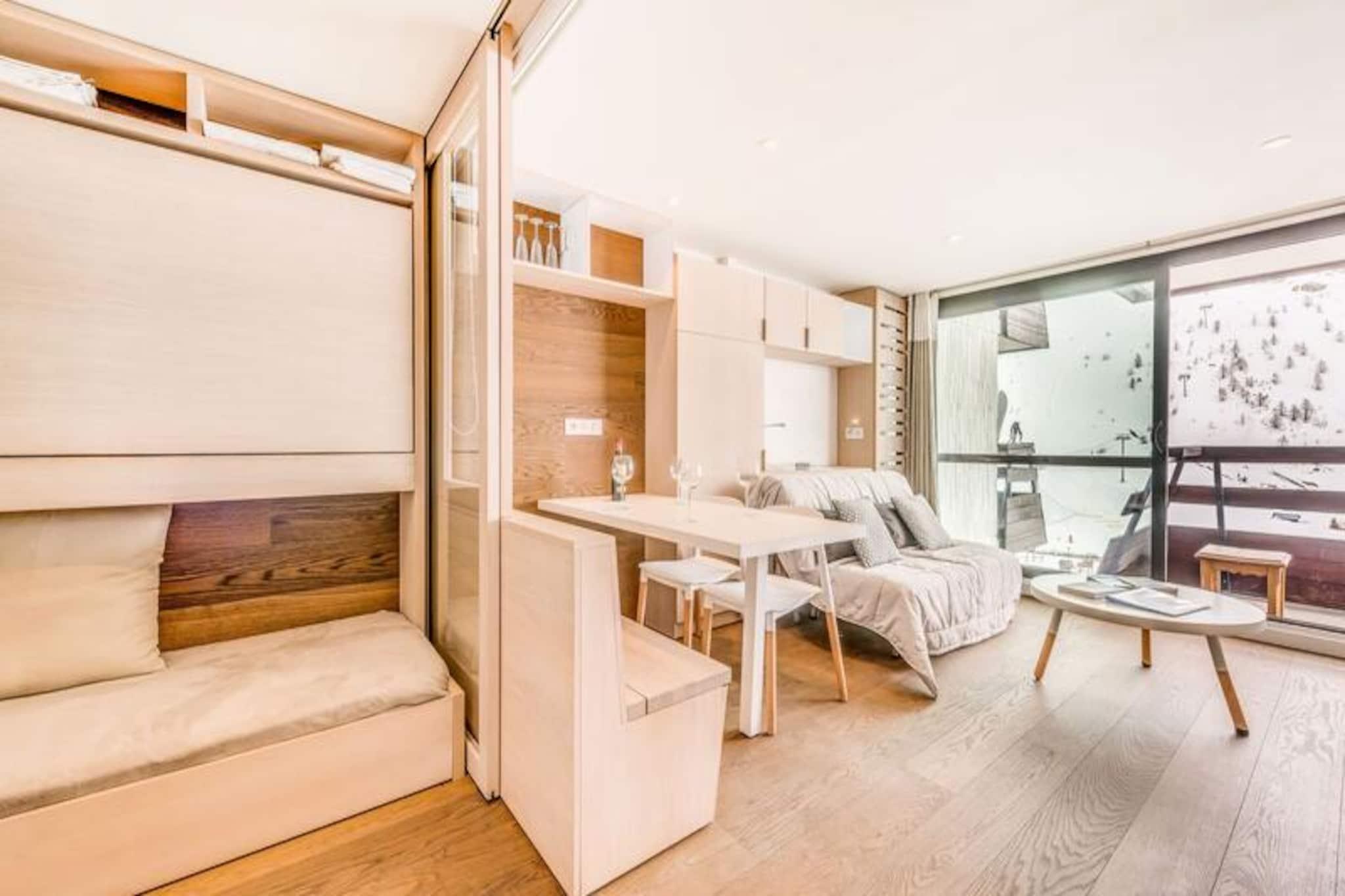 Hoch über dem glitzernden Wasser des Tignes-le-Lac bietet dieses Premium-Studio in der renommierten Residence LE PALAFOUR ein unvergleichliches alpines Urlaubserlebnis. Auf 2.100 Metern Höhe gelegen, ermöglicht die Unterkunft direkten Zugang zur Piste und damit zu einem der berühmtesten Skigebiete der Welt. Genießen Sie von Ihrem nach Süden ausgerichteten Balkon den ungestörten Blick auf den See und die umliegenden Gipfel – eine tägliche Erinnerung an die Schönheit und Ruhe der französischen Alpen. Ob Sie aufregende Wintersportarten oder die vielfältigen Sommeraktivitäten suchen, dieser Ort ist der ideale Ausgangspunkt für unvergessliche Abenteuer. Das 2018 renovierte Studio vereint modernen Komfort und durchdachtes Design und ist ideal für bis zu vier Gäste. Der Eingangsbereich verfügt über ein Einzelbett und ein ausklappbares Etagenbett, das sich bei Bedarf abtrennen lässt und so einen privaten Schlafbereich schafft. Das helle und funktionale Wohnzimmer ist mit einem Schlafsofa, einem Flachbildfernseher und einem Essbereich mit Zugang zum Balkon ausgestattet. Die voll ausgestattete Küche lädt zum unkomplizierten Zubereiten von Mahlzeiten ein und bietet Ihnen einen Geschirrspüler, ein Cerankochfeld, einen Kombi-Backofen und sogar einen Raclette-Grill für authentische alpine Küche. Das Badezimmer ist ebenso komfortabel ausgestattet mit einem beheizten Handtuchhalter und einer eleganten Dusche. Hotel-Services wie Bettwäsche, Handtücher und die Endreinigung sorgen für einen unbeschwerten Aufenthalt. \n\nEntdecken Sie die Annehmlichkeiten des hoteleigenen Einkaufszentrums mit Sportgeschäften, Skischulen, einem Supermarkt und gemütlichen Bäckereien. Nur 50 Meter entfernt bietet der Wasserpark LE LAGON Entspannung und Spaß, während der Sport- und Kulturkomplex TIGNESPACE nur 100 Meter von Ihrer Tür entfernt liegt. Zu jeder Jahreszeit verwandelt sich Tignes Le Lac in ein Zentrum für Aktivitäten: Skifahren und Snowboarden im Winter sowie Wandern, Mountainbiken und Wassersport im Sommer. Mit seiner unschlagbaren Lage, den modernen Annehmlichkeiten und dem atemberaubenden Ausblick ist dieses Studio der perfekte Ausgangspunkt für Ihren alpinen Urlaub.