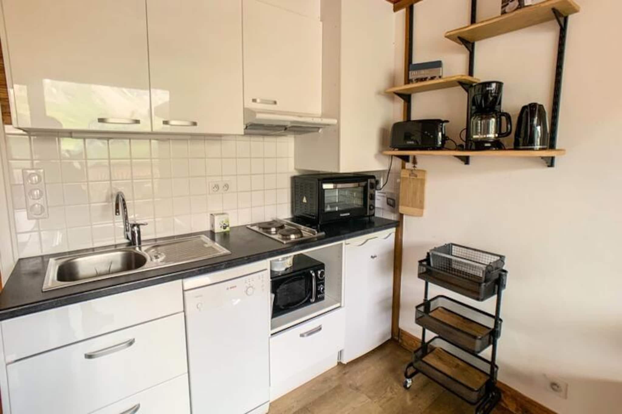 Mitten im lebhaften Tignes le Lac bietet diese charmante Studio-Hütte den perfekten alpinen Rückzugsort für Wintersportler und Sommerabenteurer. Vom nach Süden ausgerichteten Balkon aus genießen Sie jeden Morgen einen atemberaubenden Blick auf die umliegenden Gipfel und können den ganzen Tag die Sonne genießen. Direkt gegenüber der Pistenfront und den Skischulen gelegen, ermöglicht diese Unterkunft einen unkomplizierten Zugang zu den Hängen und ist somit ideal für Familien und Gruppen, die ihre Zeit am Berg optimal nutzen möchten. Das 29 m² große Studio ist durchdacht gestaltet und bietet Platz für bis zu vier Gäste. Der Eingangsbereich bietet viel Stauraum, während die offene Küche mit modernen Geräten wie Elektroherd, Backofen, Mikrowelle und Geschirrspüler ausgestattet ist und die Zubereitung von Mahlzeiten zum Kinderspiel macht. Das Wohnzimmer verfügt über einen gemütlichen Essbereich, ein Schlafsofa, das sich in ein Doppelbett verwandeln lässt, und einen Fernseher für entspannte Abende. Eine separate Hütte mit Etagenbetten bietet zusätzliche Schlafmöglichkeiten und ist somit perfekt für Familien. Das Badezimmer und das separate WC sorgen für zusätzlichen Komfort, und der Skischrank im Erdgeschoss gewährleistet, dass Ihre Ausrüstung stets für das nächste Abenteuer bereit ist.\n\nTreten Sie vor die Tür, und Sie finden alles, was Sie brauchen, bequem zu Fuß erreichbar. Von Sportgeschäften und Skischulen über Supermarkt, Bäckerei und Bars bis hin zu Restaurants – die lebendige Dorfatmosphäre von Tignes le Lac liegt Ihnen zu Füßen. Im Winter profitieren Sie von vergünstigten Skipässen für Tignes und Val d’Isère, während Ihnen im Sommer die My Tignes Card eine Welt voller Aktivitäten eröffnet, vom Mountainbiken bis zum Stand-Up-Paddling.\n\nOb Sie nun im Tiefschnee die Pisten hinunterziehen oder die atemberaubende Alpenlandschaft erkunden möchten – diese gemütliche und gepflegte Studio-Hütte verspricht einen unvergesslichen Aufenthalt im Herzen der französischen Alpen.