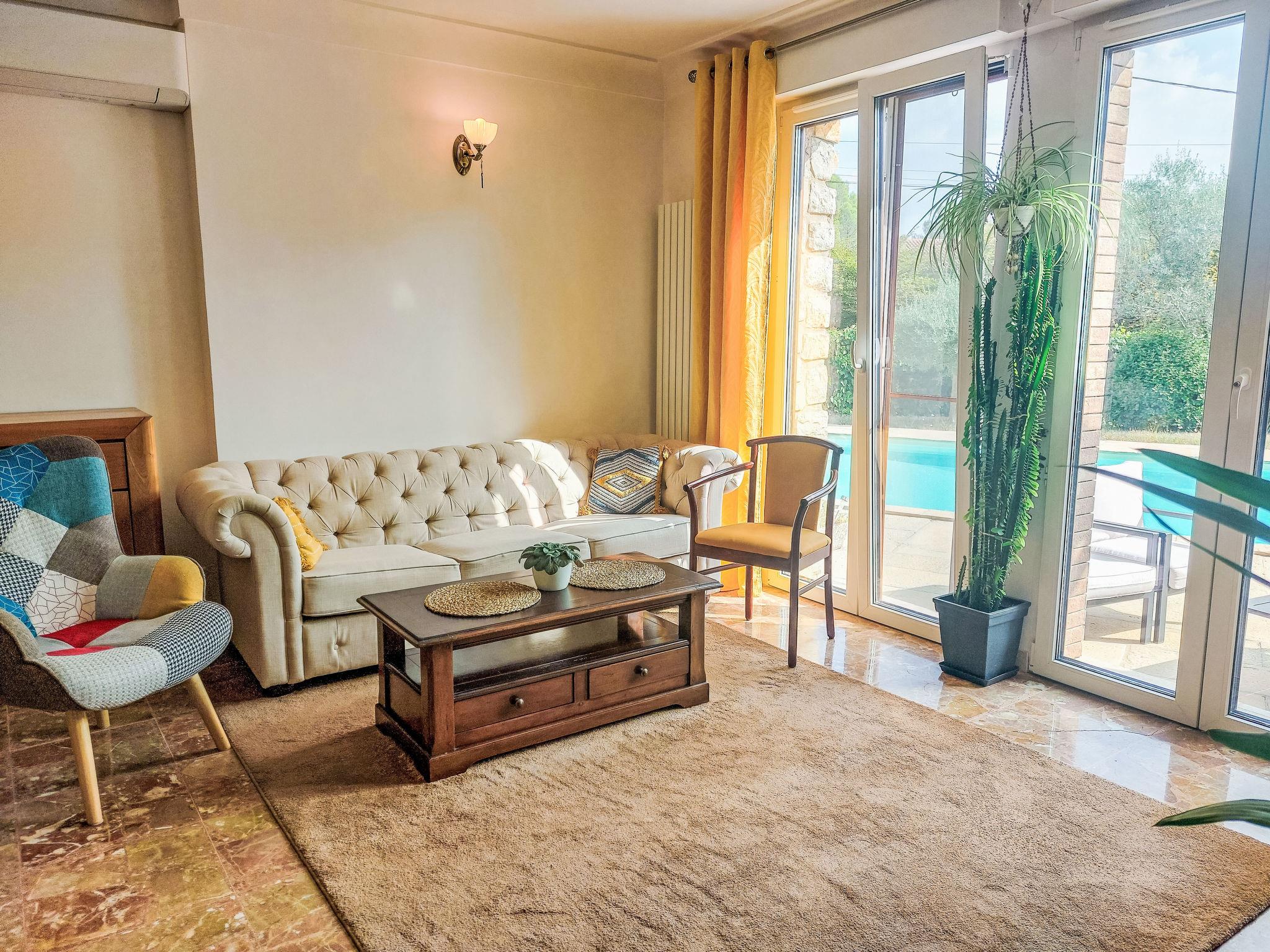 "Les Pierres Fleuries", 4-Zimmer-Villa 90 m2. Komfortabel und schön eingerichtet: Wohn-/Esszimmer mit Schwedenofen (nur Deko), Esstisch und TV (Flachbildschirm), Klimaanlage. Ausgang zur Terrasse. 1 Zimmer mit 1 franz. Bett (140 cm, Länge 190 cm), Ventilator. 1 Zimmer mit 2 Betten (90 cm, Länge 190 cm), Ventilator. 1 Zimmer mit 1 Doppeldiwanbett (140 cm, Länge 190 cm), Bibliothek und Ventilator. Offene Küche (Backofen, Geschirrspüler, 3 Induktionskochplatten, Toaster, Wasserkocher, Mikrowelle, Tiefkühler, elektrische Kaffeemaschine, Kapseln für die Kaffeemaschine (Tassimo) extra) mit kleinem Esstisch. Ausgang zum Garten. Bad/Dusche, sep. WC. Ölheizung. Terrassenmöbel, Elektrogrill, Liegestühle (4). Zur Verfügung: Waschmaschine, Wäschetrockner, Bügeleisen, Fliegengitter, Babybett bis 3 Jahre. Internet (WLAN, gratis). Parkplatz (eingezäunt, 2 Autos). Bitte beachten: Nichtraucher-Haus. Rauchmelder. Der ausgeschriebene Pool ist zur alleinigen Nutzung. Inserat einer Privatperson nach Artikel 155, IV, CGI.