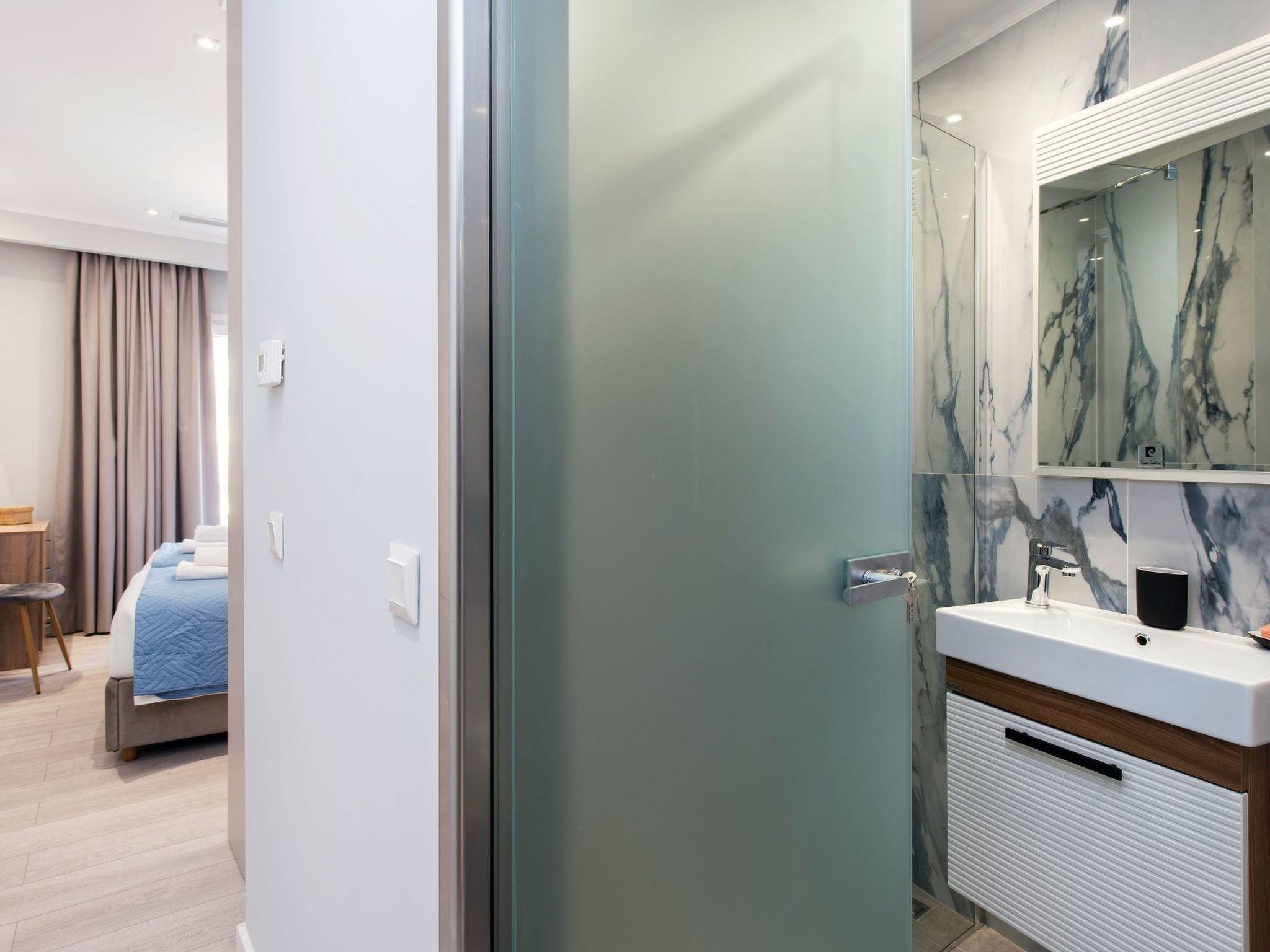 Pelagia Dio von Kormaris hat zwei Schlafzimmer mit eigenem Bad und Dusche, eines mit einem Doppelbett und einer Balkontür, die auf einen gemeinsamen Balkon mit Pelagia Ena führt, während das andere zwei Einzelbetten hat, die der Eigentümer leicht in ein Doppelbett umwandeln kann, und die Balkontür führt auf den privaten Balkon des Zimmers.