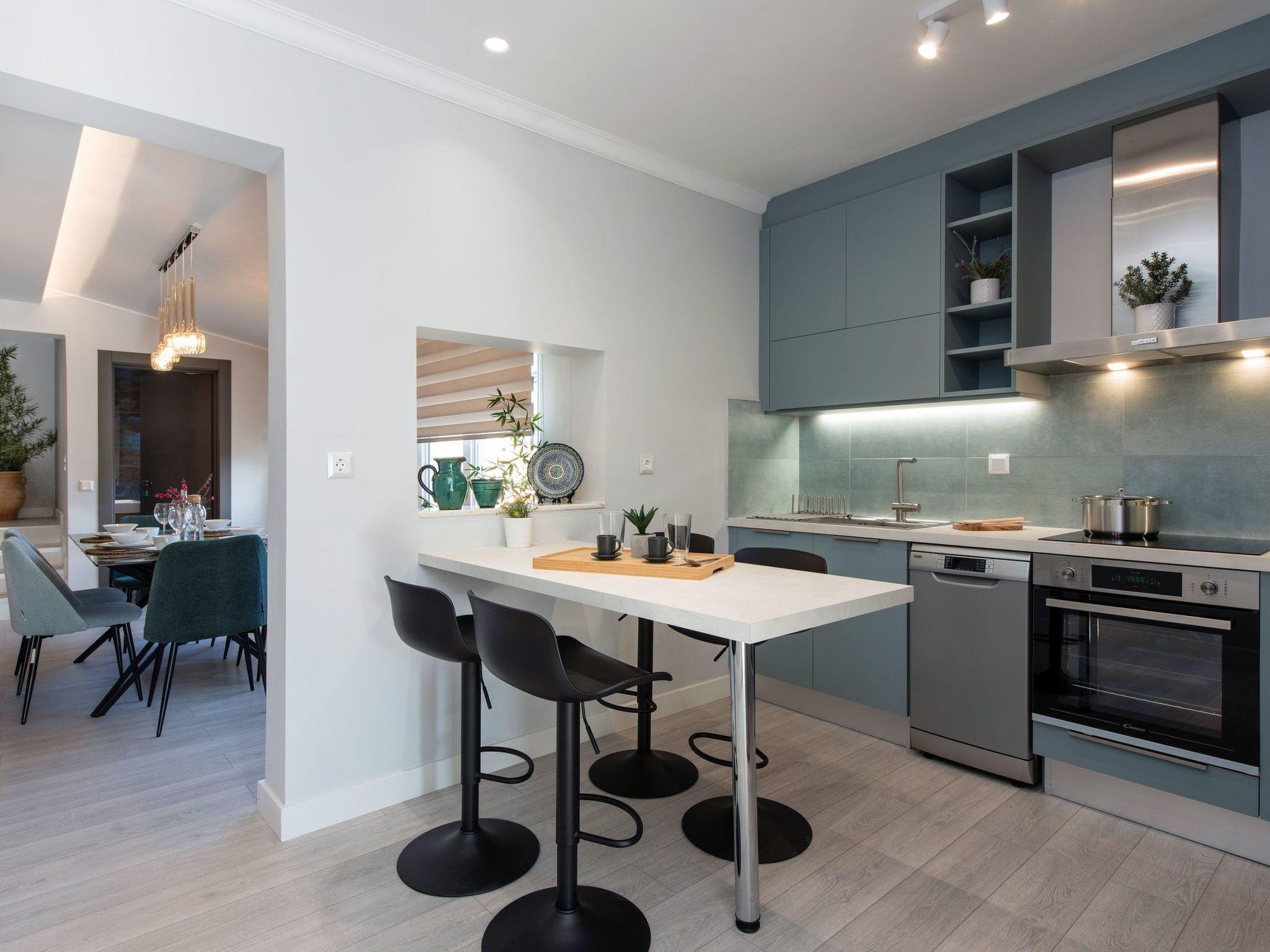 Die Außentreppe führt zum vorderen Balkon, von dem aus man den Spielplatz und das Dorf Kassiopi überblicken kann. Durch die Haupttür gelangt man in eine voll ausgestattete und moderne Küche mit Geschirrspüler, Mikrowelle und allen anderen Geräten, die ein Haushalt braucht. Die Küche verfügt über eine Arbeitsplatte mit vier Stühlen für das Frühstück oder einen schnellen Snack.