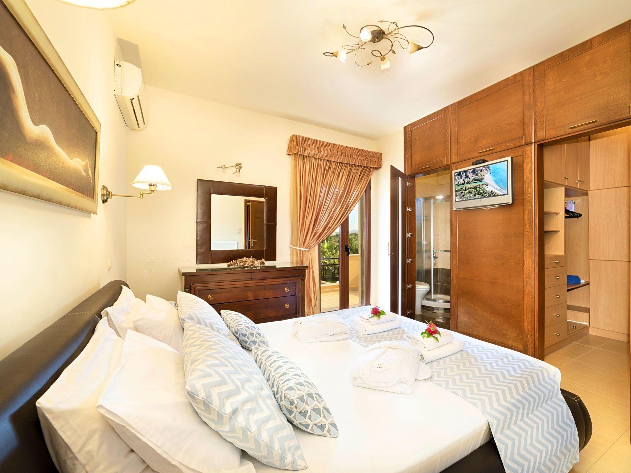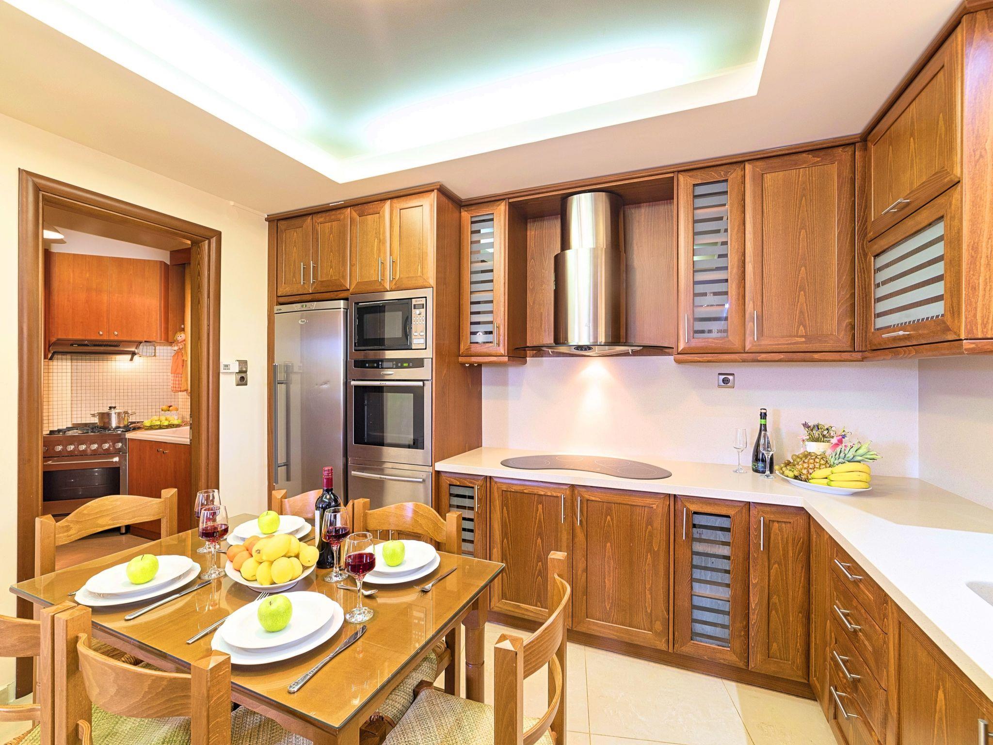 * Eine Küche mit Backofen, Geschirrspüler, Kühlschrank, Filterkaffeemaschine, Teekocher, Saftpresse, Toaster, Geschirr und Essecke. * Eine zweite voll ausgestattete Hilfsküche. * Ein WC * Ein Hauptschlafzimmer mit einem Doppelbett, Balkon, Fernseher, eigenem Bad und eigenem Kleiderschrank. * Ein zweites Schlafzimmer mit einem Doppelbett, Fernseher und Zugang zu einem Balkon.
