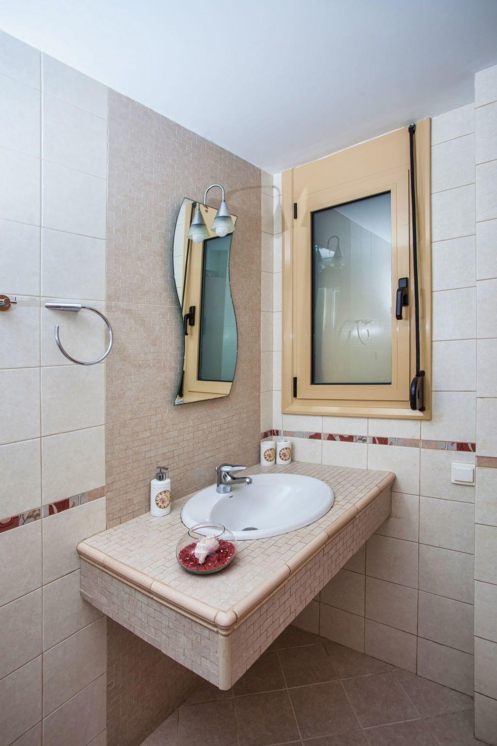 Die große Terrasse und die Balkone bieten einen schönen Blick auf die Umgebung und das ferne Meer. Voll klimatisiert. Hohe Qualität der Konstruktion. Die Villa ist 300qm groß, ist eine sehr elegante und geräumige Villa, mit 5 Schlafzimmern; 1 davon mit Doppelbetten und luxuriösen en-suite Badezimmern/WC, 2 Schlafzimmer mit Einzelbetten teilen sich ein luxuriöses Badezimmer/WC und 1 mit Zwillingsbetten, Sofabett, Babybett und luxuriösen en-suite Badezimmern/WC, alle im Erdgeschoss, im zweiten Stock ist ein offenes Schlafzimmer mit einem doppelten Eisenbett und einem doppelten Sofabett, es ist geeignet für bis zu 10-14 Personen. Eine offene Marmortreppe (acht Stufen) führt ins Obergeschoss, wo sich eine sehr gut ausgestattete Küche mit Elektroherd, Backofen, Mikrowelle, Geschirrspüler, Kühl-/Gefrierschrank, Kaffeemaschine, Toaster, Saftpresse und Wasserkocher befindet. Auf der gleichen Ebene wie die Küche befindet sich das Esszimmer mit einem großen Esstisch für 12 Personen. Vom Esszimmer aus führt eine Tür auf die Terrasse, wo ein weiterer großer Tisch und ein großer Sonnenschirm stehen, um im Freien zu frühstücken, zu starten oder zu essen. Über acht Stufen gelangt man in die Küche mit bequemen Sitzgelegenheiten, einem gläsernen Kamin, Satelliten-TV und DVD-Player. Außerdem gibt es auf dieser Etage ein WC und eine Tür, die auf den überdachten Balkon mit Terrassenmöbeln führt, von dem aus man einen fantastischen Blick auf die Umgebung und das ferne Meer hat. Auf der gleichen Ebene mit der Sitzecke gibt es eine Ecke mit einem Schreibtisch, Bibliothek, WiFi VDSL ist innerhalb und außerhalb der Villa zur Verfügung. Im Hauptschlafzimmer befindet sich ein Schließfach. Klimaanlage ist in allen Schlafzimmern vorhanden. Neben der Garage gibt es einen Hauswirtschaftsraum mit einer Waschmaschine und Bügelbrett. Die Villa ist gut ausgestattet und möbliert, mit Zentralheizung für kühlere Perioden des Jahres.
