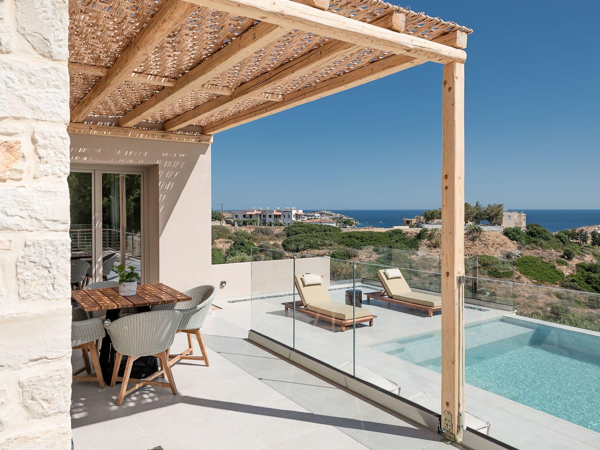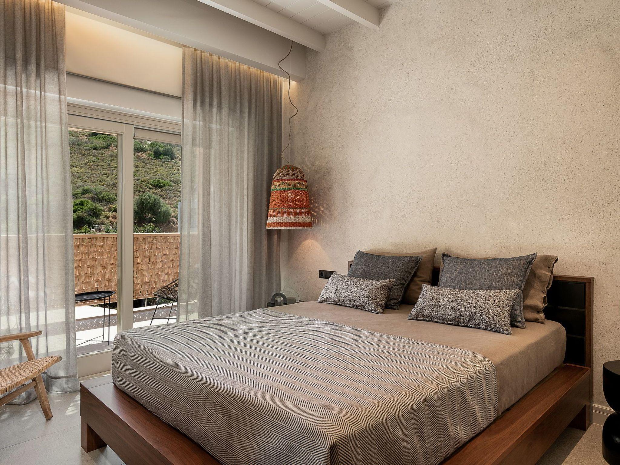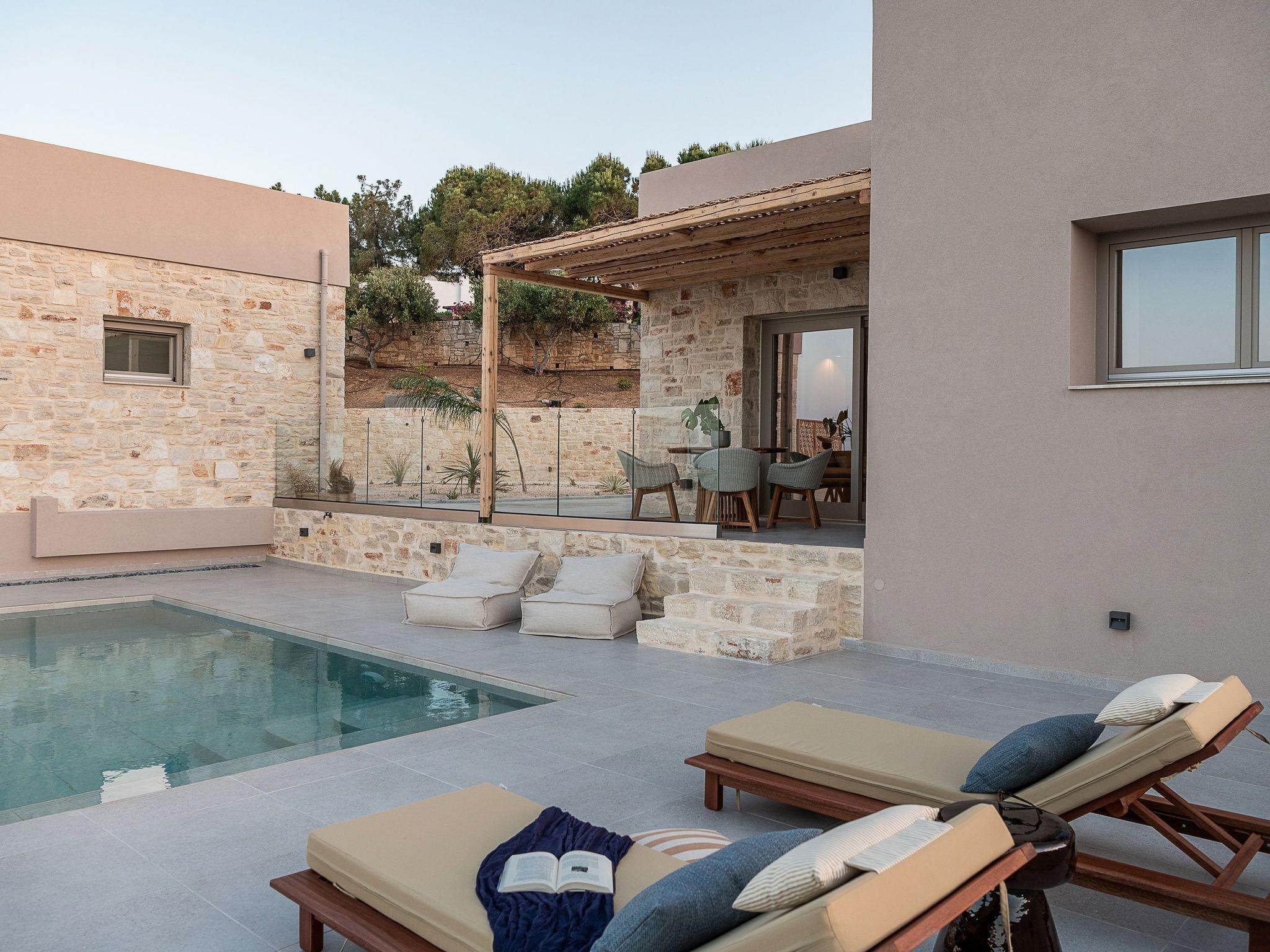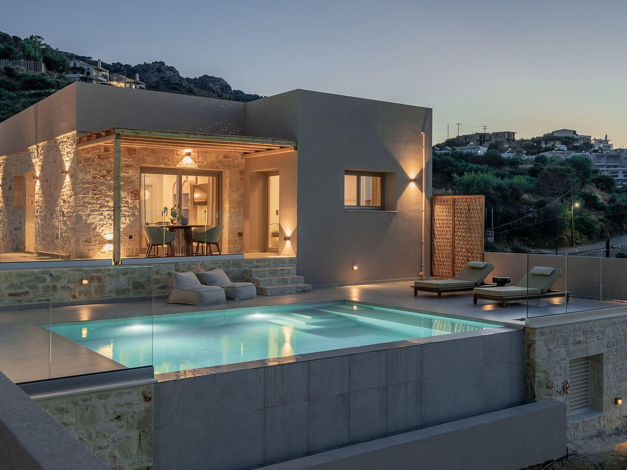 Kokomo Villas besteht aus 3 Luxusvillen, die auf einem Hügel mit Blick auf die Bucht von Lygaria im Großraum Agia Pelagia liegen. Es kann von Heraklion / Heraklion Flughafen in etwa 25 Minuten erreicht werden. Die Anlage ist von der Autobahn aus leicht zu erreichen und eignet sich ideal als Ausgangspunkt für die Erkundung interessanter Orte. Obwohl sie sich in der Nähe verschiedener herrlicher Strände, Restaurants und Supermärkte befindet, eignet sie sich auch hervorragend zum Entspannen in der Privatsphäre. Die Villa zeichnet sich durch hohe Ästhetik und einen atemberaubenden Panoramablick auf das Kretische Meer aus. Die erdigen Töne der Räume gehen in das tiefe Blau des Meeres und des Himmels über und vermitteln ein unvergessliches Gefühl von Harmonie und Sanftheit. Jeder Aspekt, jedes Material und jedes Element wurde sorgfältig ausgewählt, um Sie in einen Zustand der Ruhe und Zufriedenheit zu hüllen. Alles, was Sie tun müssen, ist zu genießen. Die Villa Aura verfügt über 2 Schlafzimmer, beide mit Kingsize-Betten und eigenem Bad mit Dusche. Das vordere Schlafzimmer bietet einen Panoramablick auf das Meer und einen direkten Zugang zur vorderen Veranda. Das hintere Schlafzimmer verfügt über eine geschmackvolle private Veranda mit Blick auf den Garten. Der Gemeinschaftsbereich besteht aus einem gemütlichen Wohnzimmer, einem Arbeitsbereich, einem Esstisch und einer voll ausgestatteten Küche. Auch dieser Bereich hat direkten Zugang zur vorderen Veranda. Unterhalb der Veranda, auf der sich ein Esstisch und ein Gasgrill befinden, liegt der Poolbereich mit einem privaten Swimmingpool mit Sonnenliegen, einer Außendusche und Liegen. Außerdem hat Kokomo Villas Sonnenkollektoren installiert, die einen Teil der für das Anwesen benötigten Energie liefern. WICHTIGER HINWEIS: Dieses Anwesen ist nicht für Kinder von 2 bis 7 Jahren geeignet, da es einen Infinity-Pool und einige unbedeckte Bereiche gibt.
