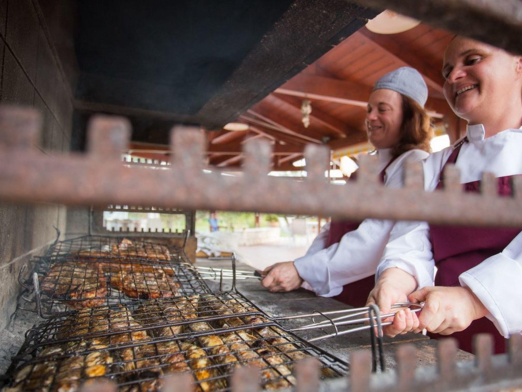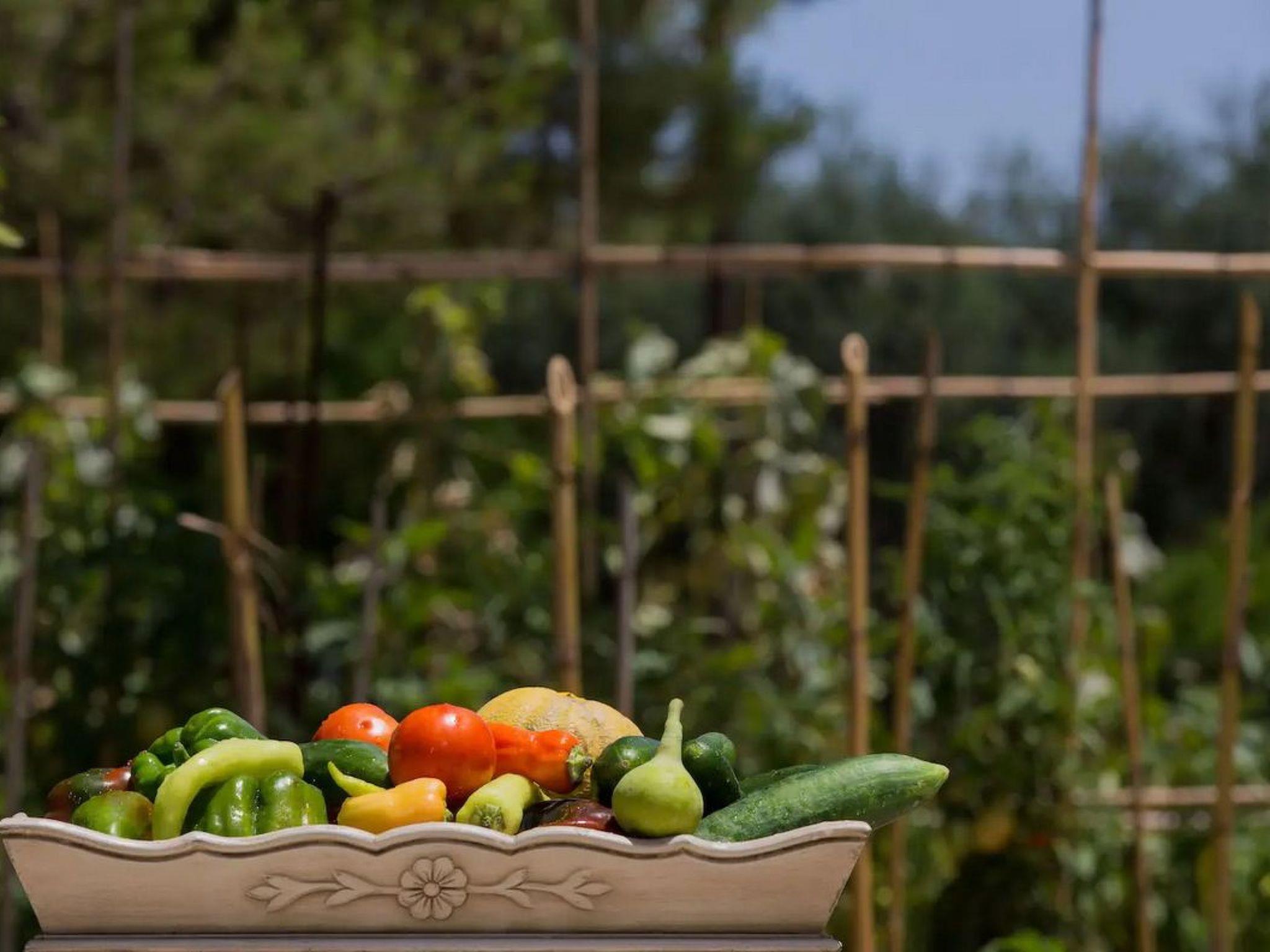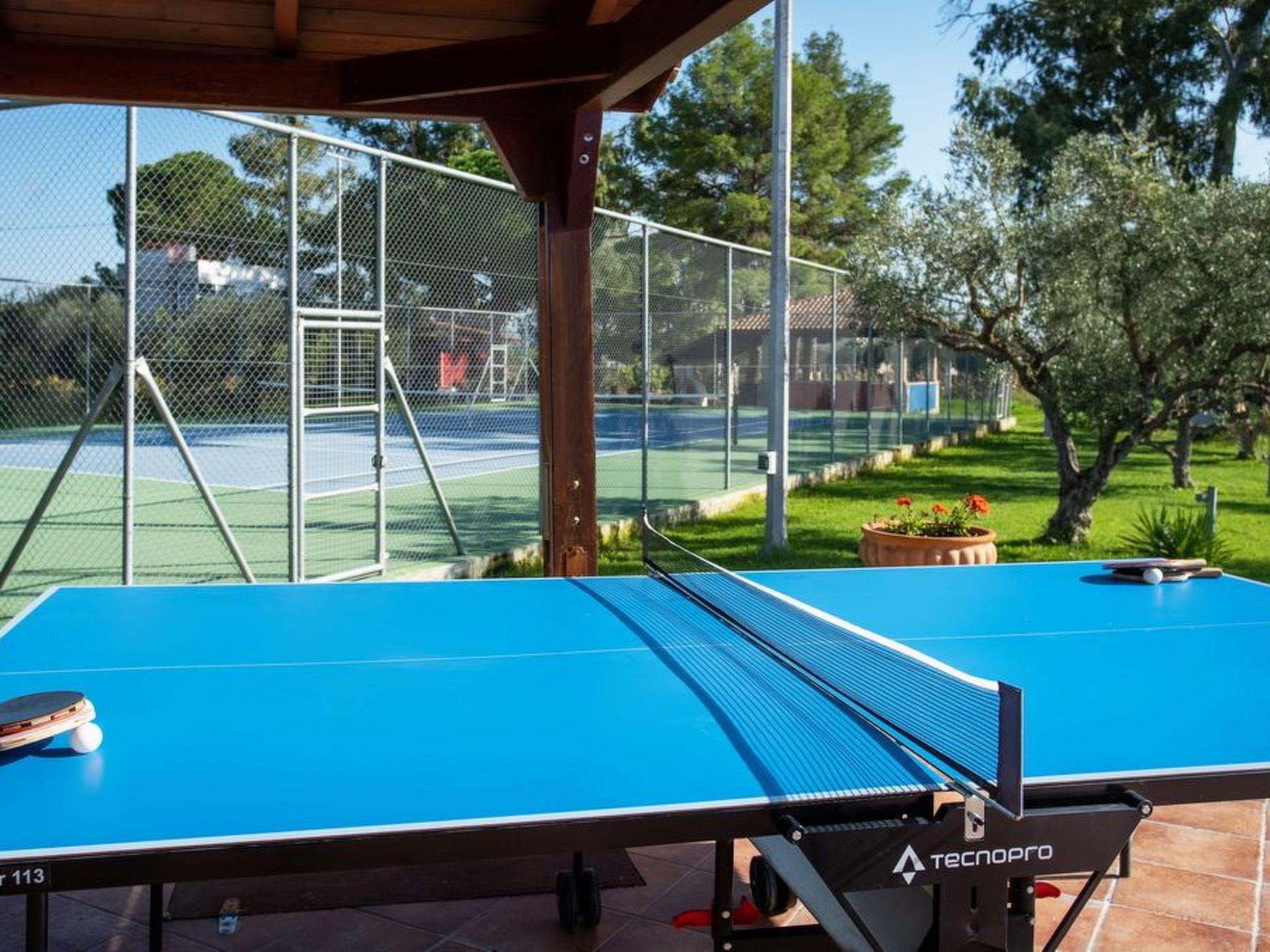 Außenbereich: Die 235qm große Veranda ist überdacht, hat einen Esstisch und einen fantastischen Blick auf den Pool, den Rasenspielplatz unter den Olivenbäumen und den Tennisplatz. Neben dem Pool ist ein großer überdachter Grillplatz mit Esstischen für 14 Personen errichtet worden. 600 qm groß ist die Terrasse um den Pool, ideal für Veranstaltungen. 600 qm groß ist der beleuchtete Tennisplatz, auf dem auch nachts gespielt werden kann. Die Kinder können auf dem Rasen zwischen den Oliven spielen, Obst von unseren Hecken probieren und unseren Gemüsegarten mit unserem Biogemüse erkunden. Ein 800 m langer Fahrrad- und Joggingweg führt durch den gesamten Weinberg. Ferngläser und Teleskope werden auf Anfrage zur Verfügung gestellt.Weinverkostung aus unserem Weinberg. Olivenölverkostung aus unserem eigenen Olivenhain.