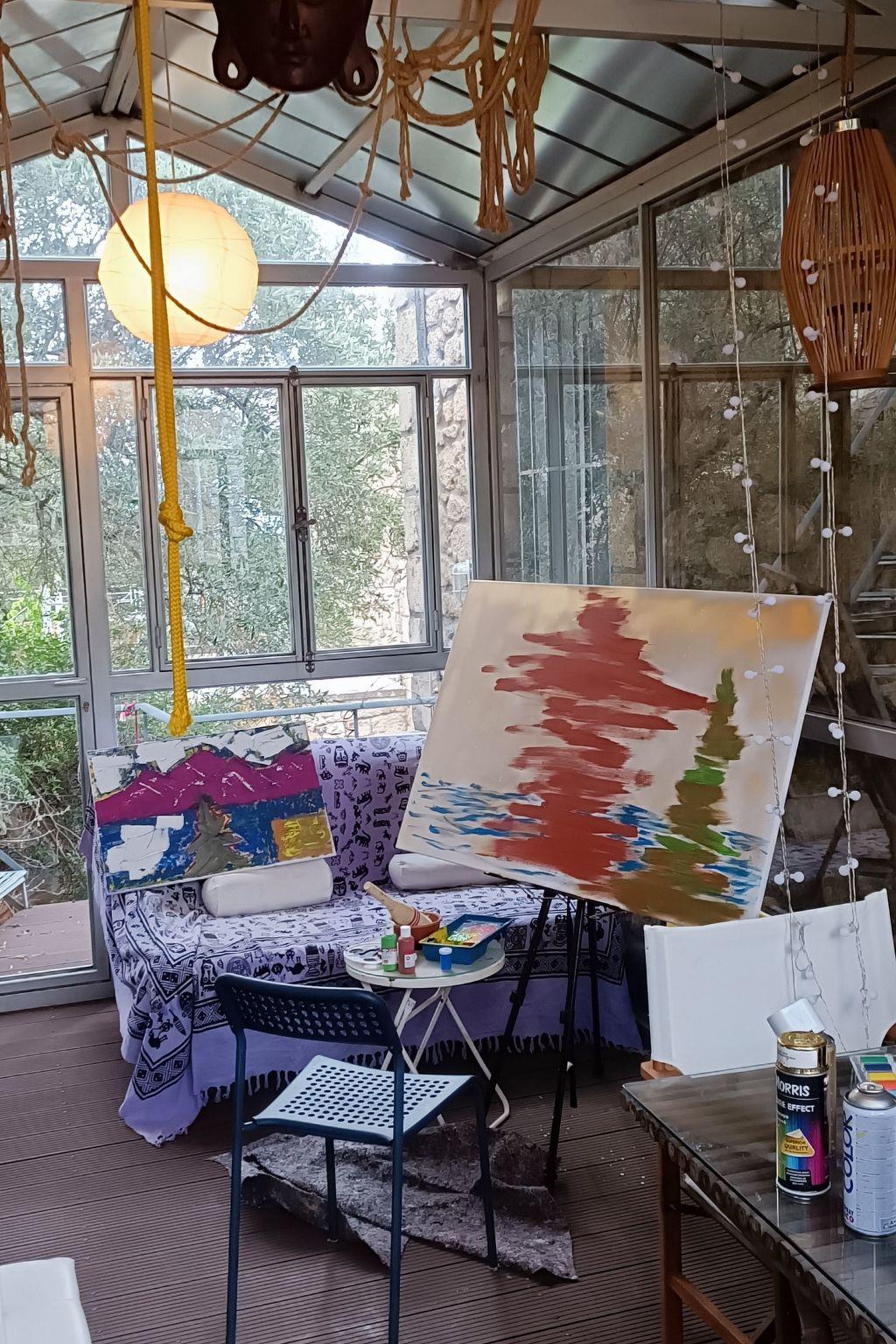 Über eine Wendeltreppe erreichen Sie das Atelier. Ein Glasbau zwischen Haus und Fels. Dort kann man im Sommer auch übernachten. Staffelei -Handwaschbecken, Trocken WC, Tisch, und Bett .