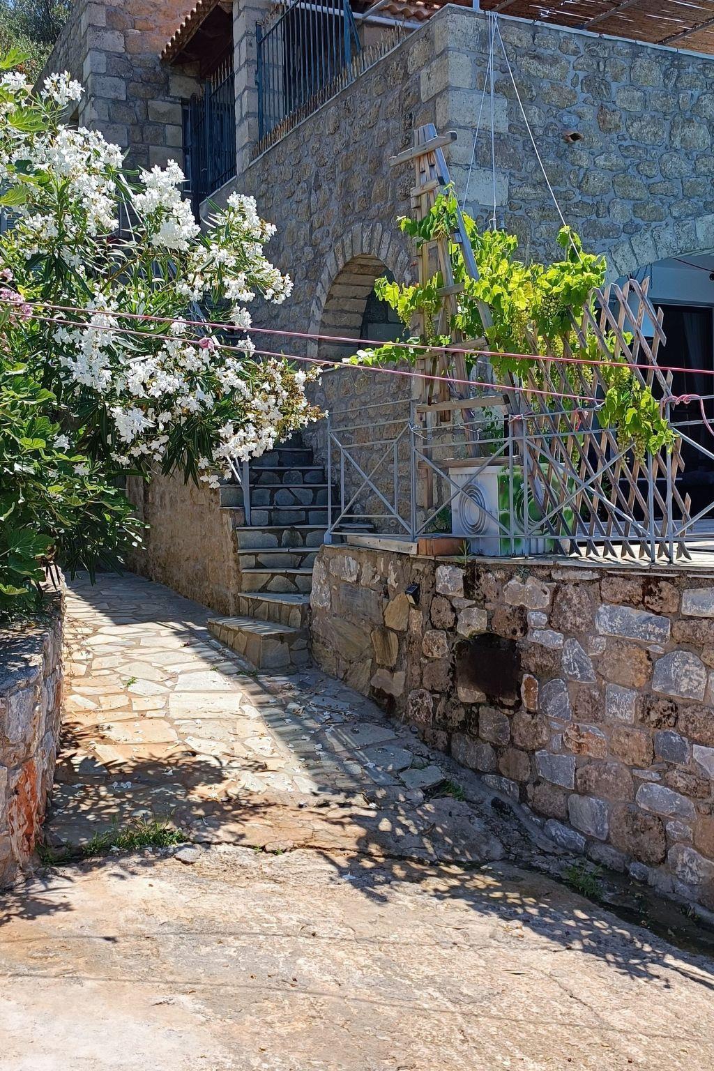 Wer keinen Wert auf Sandstrände legt, kann natürlich auch in Hausnähe direkt ans Meer. Ein paar Meter und man kann ins Meer springen. Ein Fahrradweg führt am Meer entlang bis nach Stoupa. Fahrradvermietung in Agios Nikolaos ,fast um die Ecke.