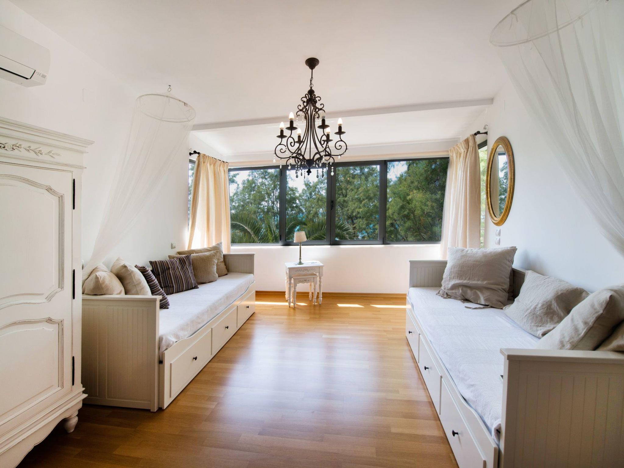 Es gibt auch ein Zweibettzimmer mit eigenem Bad. Im Obergeschoss befinden sich zwei moderne Schlafzimmer mit Kingsize-Betten, die so angeordnet sind, dass Sie vom Bett aus den Blick auf das Mittelmeer und einen wunderschönen Sonnenuntergang genießen können. Ein großer Balkon hilft Ihnen, die wunderbare Melodie der Wellen zu genießen und nachts die beleuchtete Küstenlinie von Agios Nikitas Dorf, die sich wie ein Gemälde vor Ihnen erstreckt. Der beleuchtete Pool und der Garten mit Blick auf den herrlichen Strand und das kristallklare Wasser des Meeres vervollständigen das Bild der absoluten Ruhe. Voll ausgestattet mit Liegestühlen und Sonnenschirmen für acht Personen sowie einer Außendusche, damit Sie die Wärme der Sonne von Lefkas genießen können.