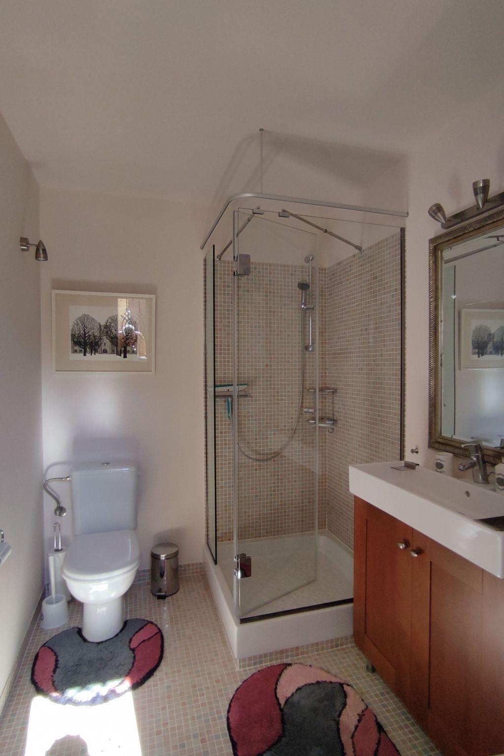 - Badezimmer 2 (dies ist das Bad im Untergeschoss des Haupthauses (unter dem Wohnzimmer). Es ist das Hauptbad für die Gäste im vorderen Schlafzimmer des Wing. Diesen steht aber direkt im Wing zusätzlich ein WC-Raum mit Waschbecken zur Verfügung: Dusche mit Glasabtrennung, Waschbecken, WC