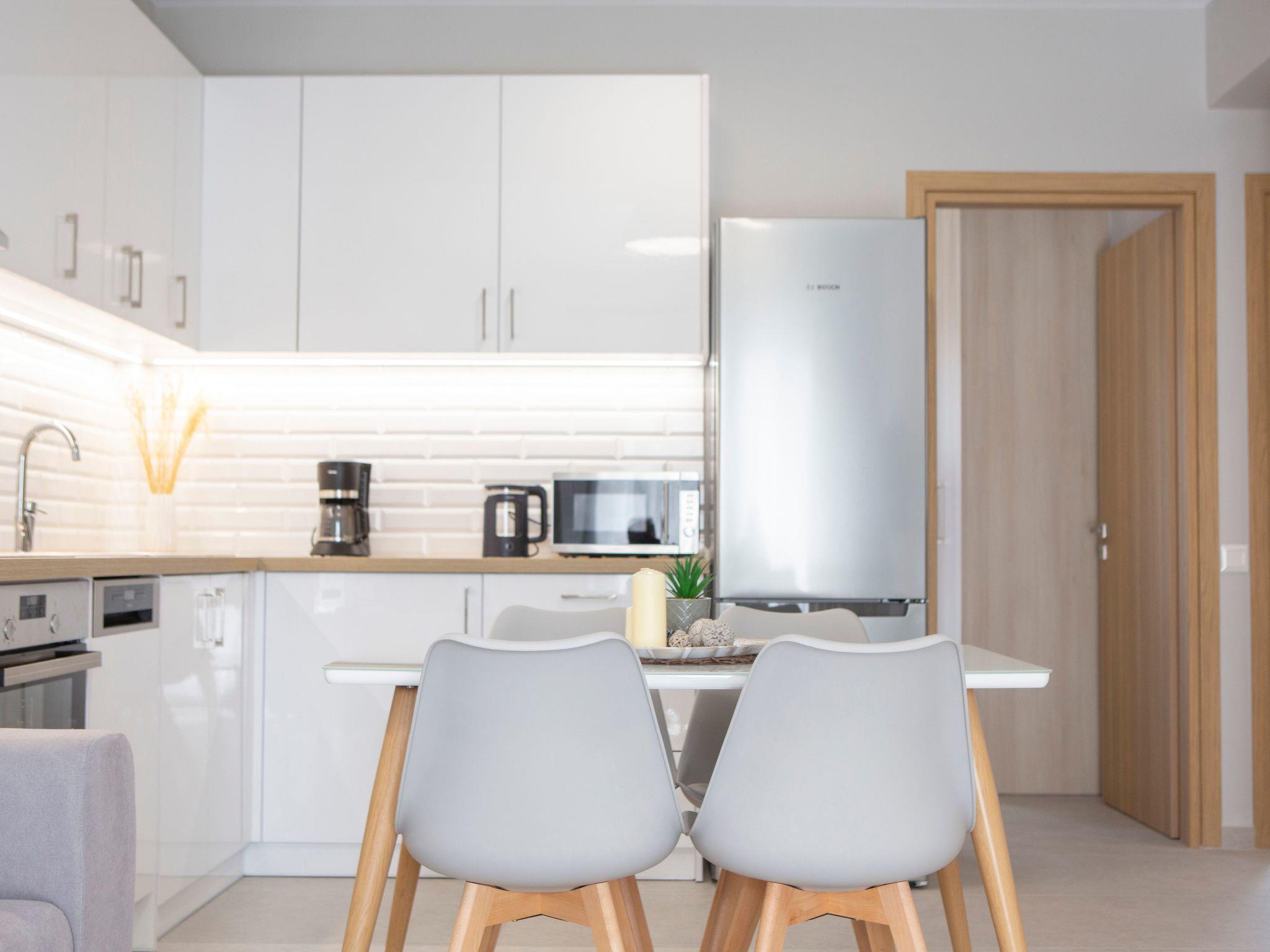 Die Wohnungen sind neu gebaut (Februar 2023), modern, schön eingerichtet und identisch ausgestattet. Die Wohnung ist 63 m² groß, während die Maisonettewohnung 75 m² hat und sich über das Erdgeschoss und den ersten Stock erstreckt. Sie bestehen aus zwei Schlafzimmern mit Doppelbetten, einem Wohnzimmer, einer Küche mit Esszimmer, einem Bad, einem WC und einer Terrasse mit Sitz- und Essbereich im Freien.