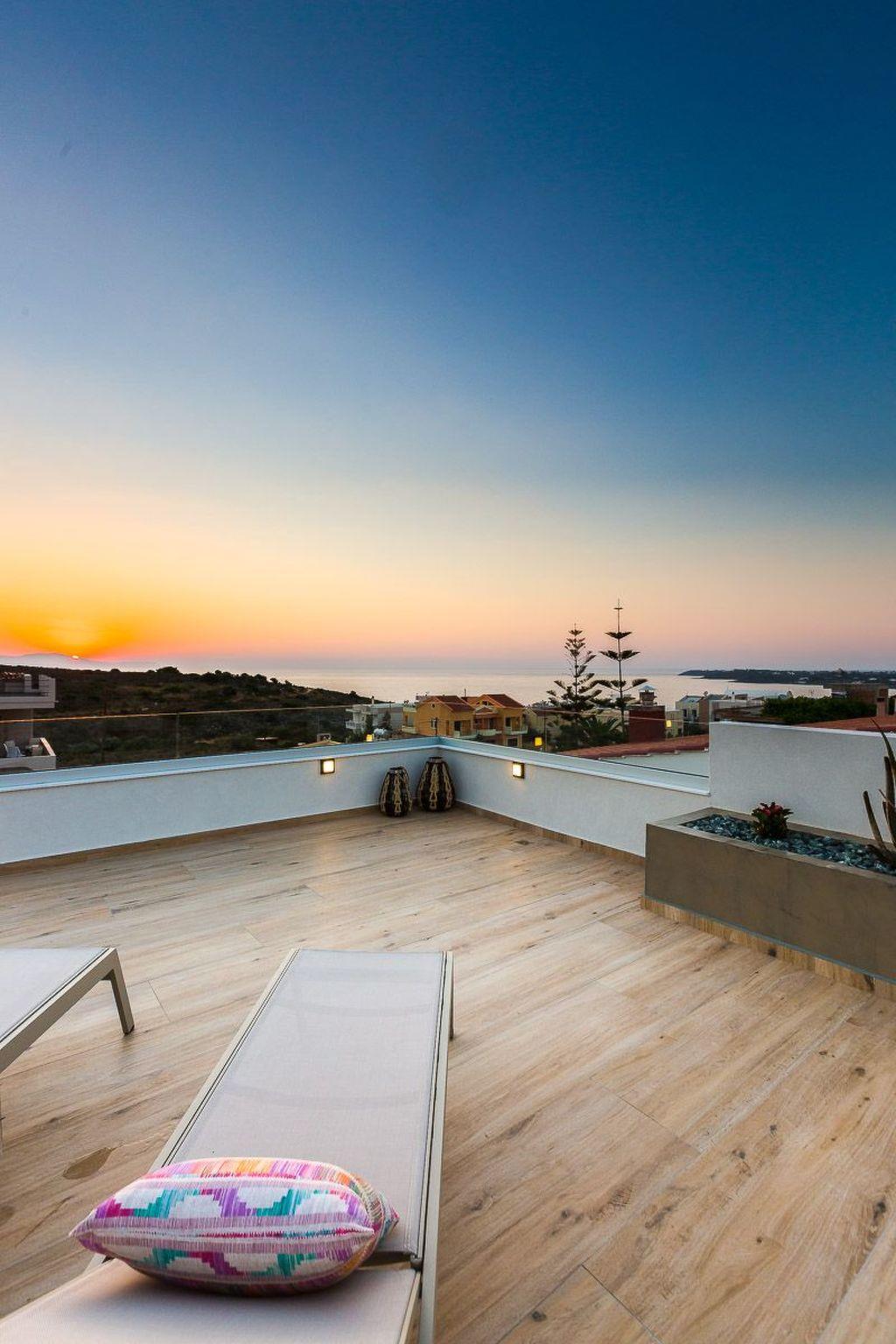 Das dominierende Merkmal des Außenbereichs ist der Swimmingpool mit dem Kinderbereich mit Liegestühlen und Sonnenschirmen, ideal zum Entspannen in der Sonne. Eine hölzerne Pergola spendet Schatten für den Essbereich und den Grill mit direktem Zugang zum Poolbereich. Auf der Dachterrasse befindet sich ein gemütlicher Wohnbereich mit Sofas, Sonnenliegen und einem Essbereich, von dem aus Sie den herrlichen Meerblick genießen können. Ein unvergessliches Urlaubserlebnis wartet in der Villa Amelia auf Sie. Erkunden Sie auch die Schönheit Kretas mit unserem 8-sitzigen Mini-Van, der bei Ihrer Ankunft in der Villa bereitsteht, ohne zusätzliche Kosten.