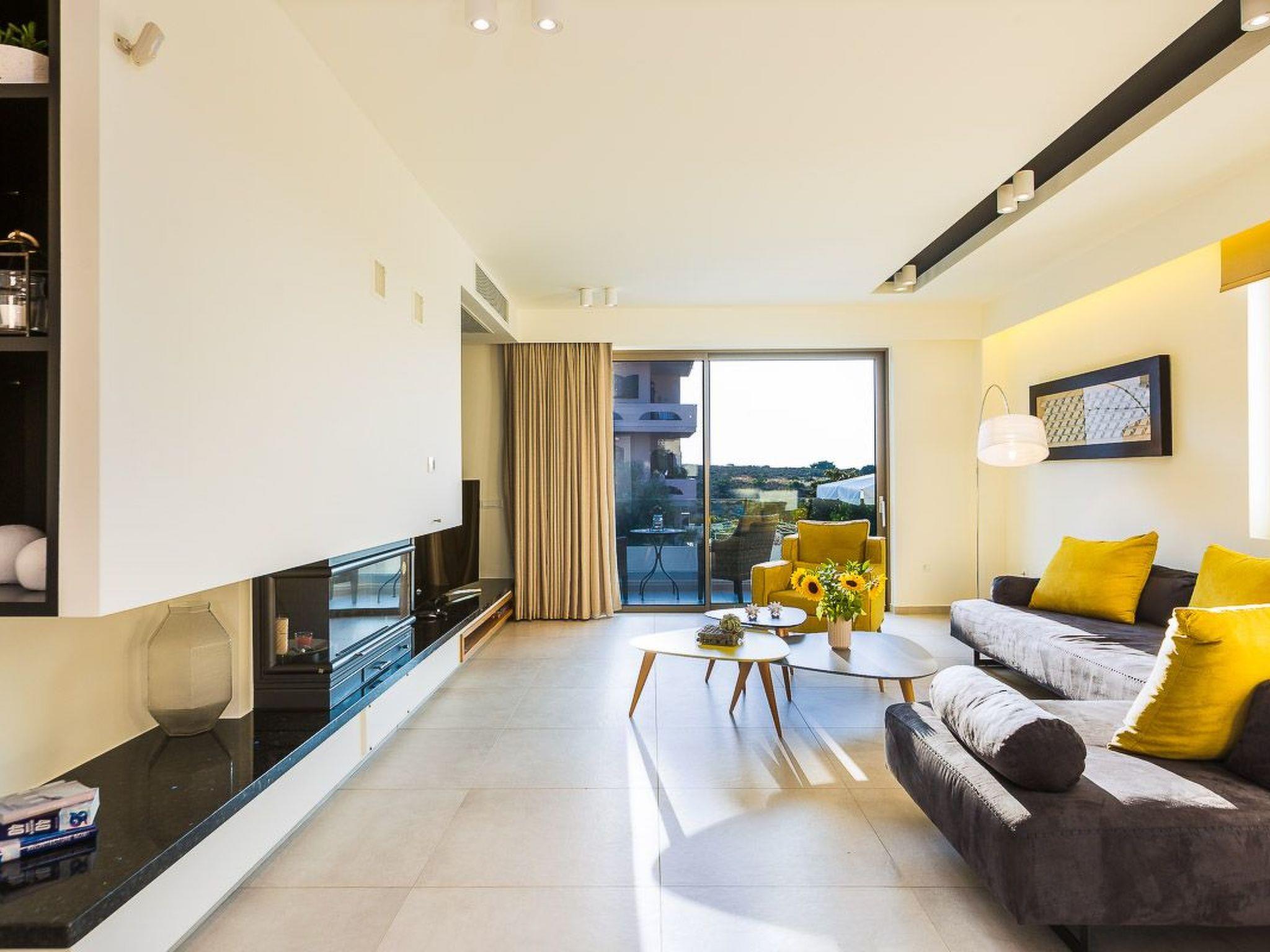 Wohnbereich mit Sofa, 60'' Satelliten Smart TV, Energiekamin, Zugang zur Poolterrasse