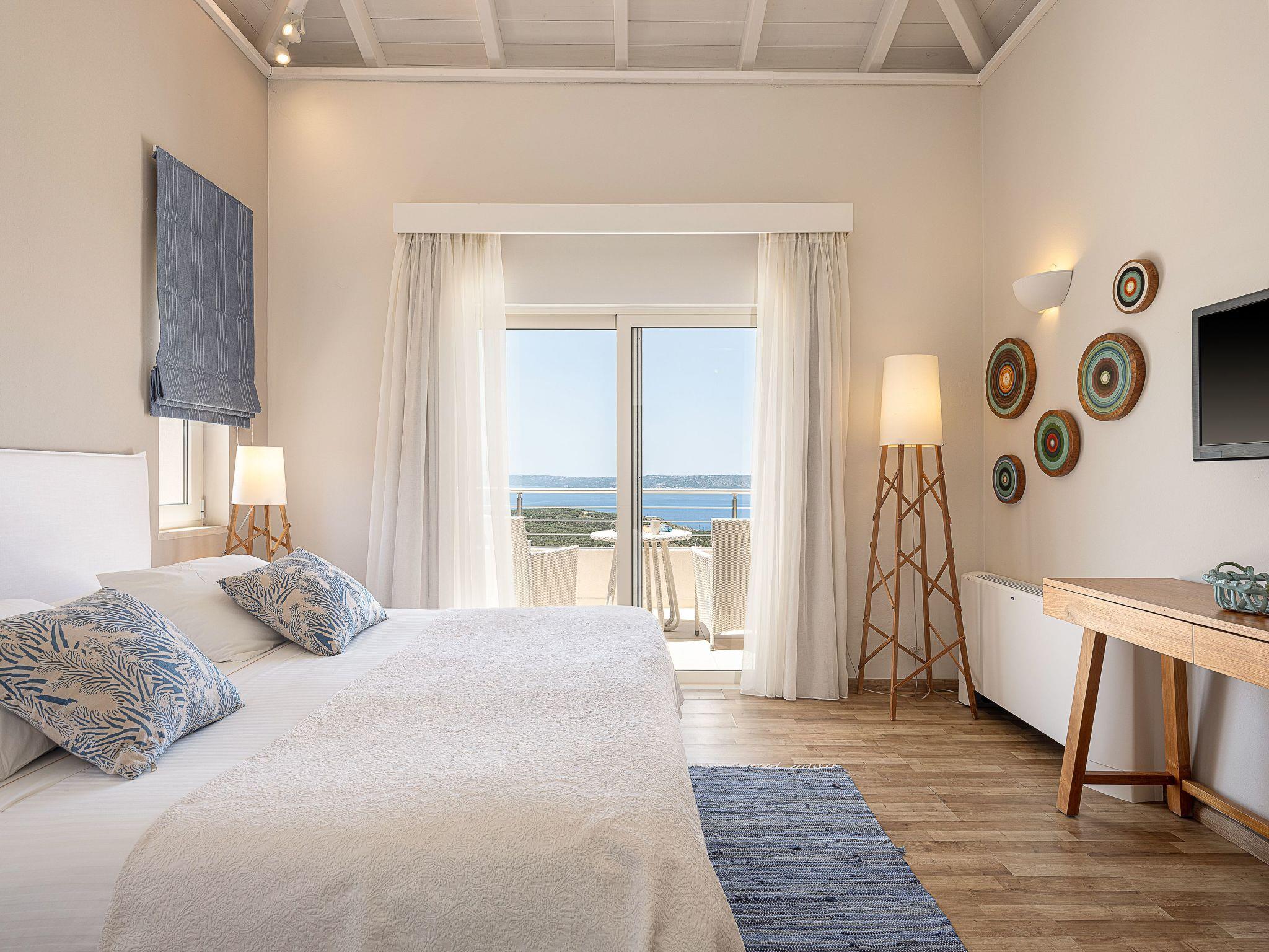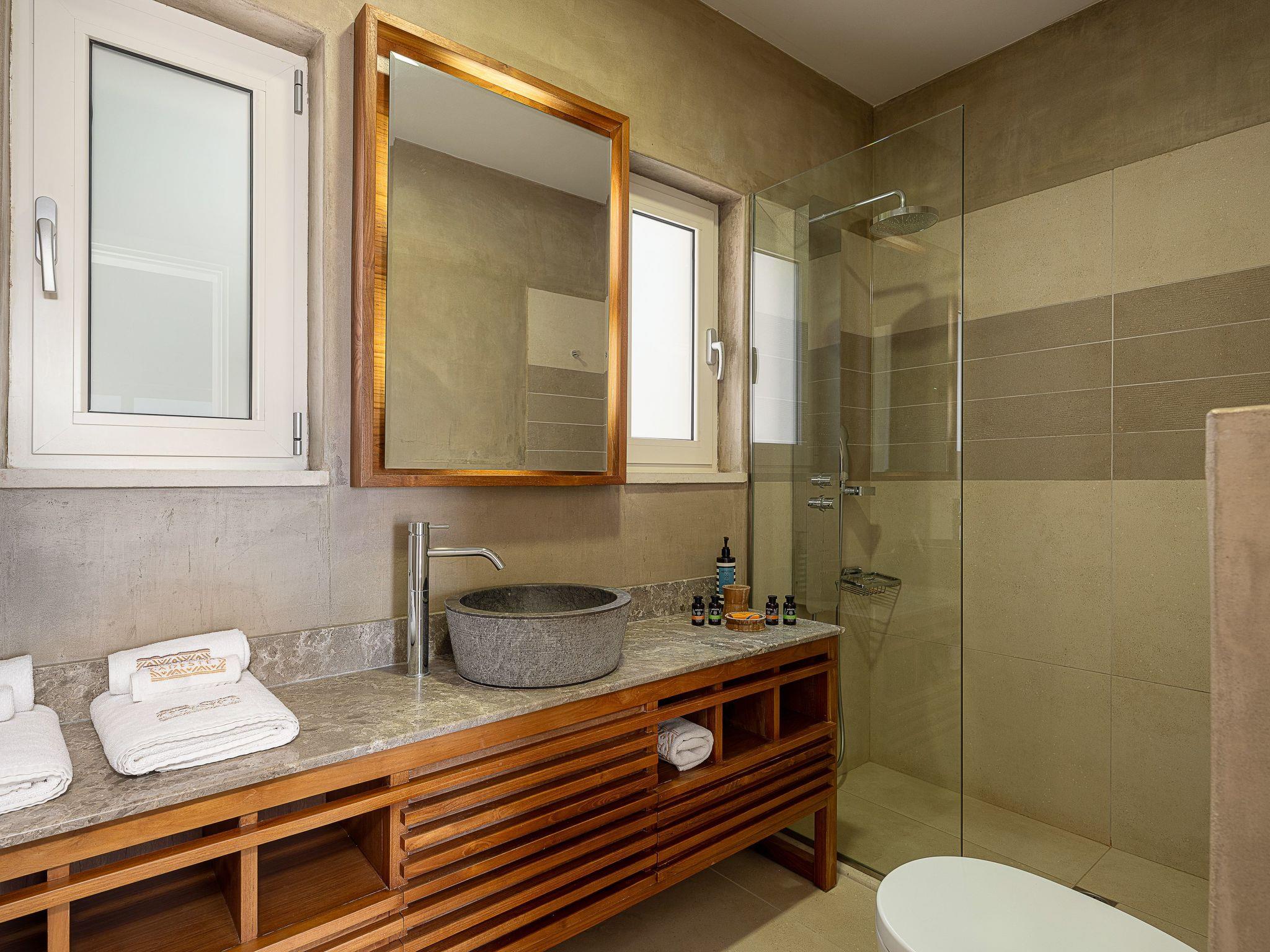 Adeste Seaview Villa l ist eine zweistöckige Villa mit drei Schlafzimmern, von denen sich zwei im Obergeschoss befinden, eines mit zwei Einzelbetten und Meerblick, das andere mit einem Kingsize-Himmelbett. Das dritte Schlafzimmer im Erdgeschoss hat ein Kingsize-Bett mit Meerblick. Im Erdgeschoss gibt es ein Gemeinschafts-WC und ein eigenes Bad, im Obergeschoss 2 eigene Bäder. Luxus und modernes Design vervollständigen die Szenerie aus zeitgenössischer Architektur und hochwertigen Produkten. Wenn Sie die Villa im Erdgeschoss betreten, finden Sie einen geräumigen, offenen Bereich mit einer voll ausgestatteten, modernen Küche, die mit Markengeräten und -einrichtungen ausgestattet ist, die das Kochen im Urlaub zu einem angenehmen Erlebnis machen. Der Bereich wird durch ein Esszimmer und ein Wohnzimmer mit einem 42'' LED-Satellitenfernseher vervollständigt. Die großen Fenster schaffen die Illusion von Transparenz und sorgen für einen nahtlosen Übergang zwischen dem Innen- und Außenbereich.