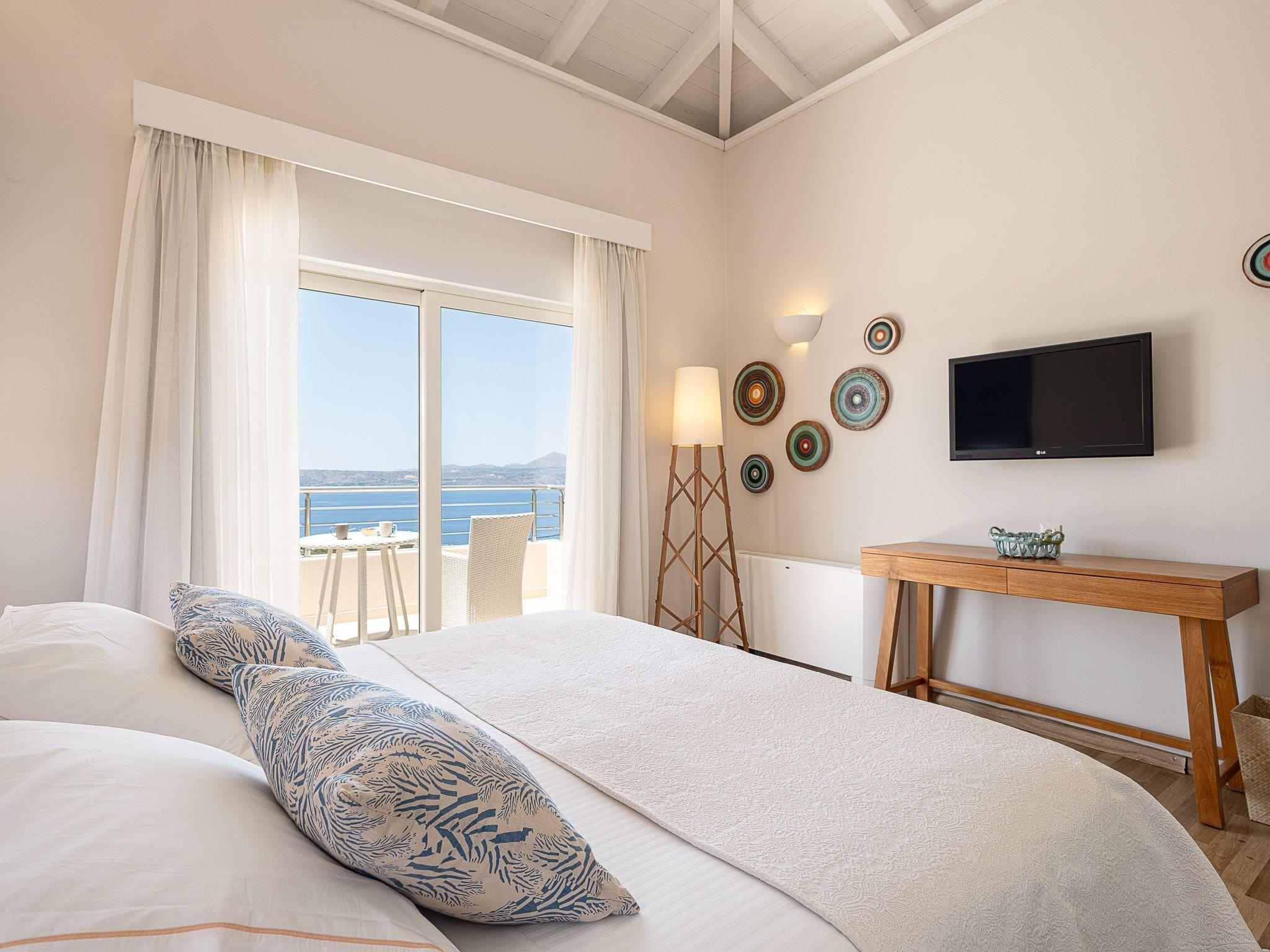 Schlafzimmer 1: Kingsize-Bett (1,80×2,00), en-suite Badezimmer mit Hydromassage-Dusche, 36" LED TV, privater Balkon mit Meer- und Gartenblick