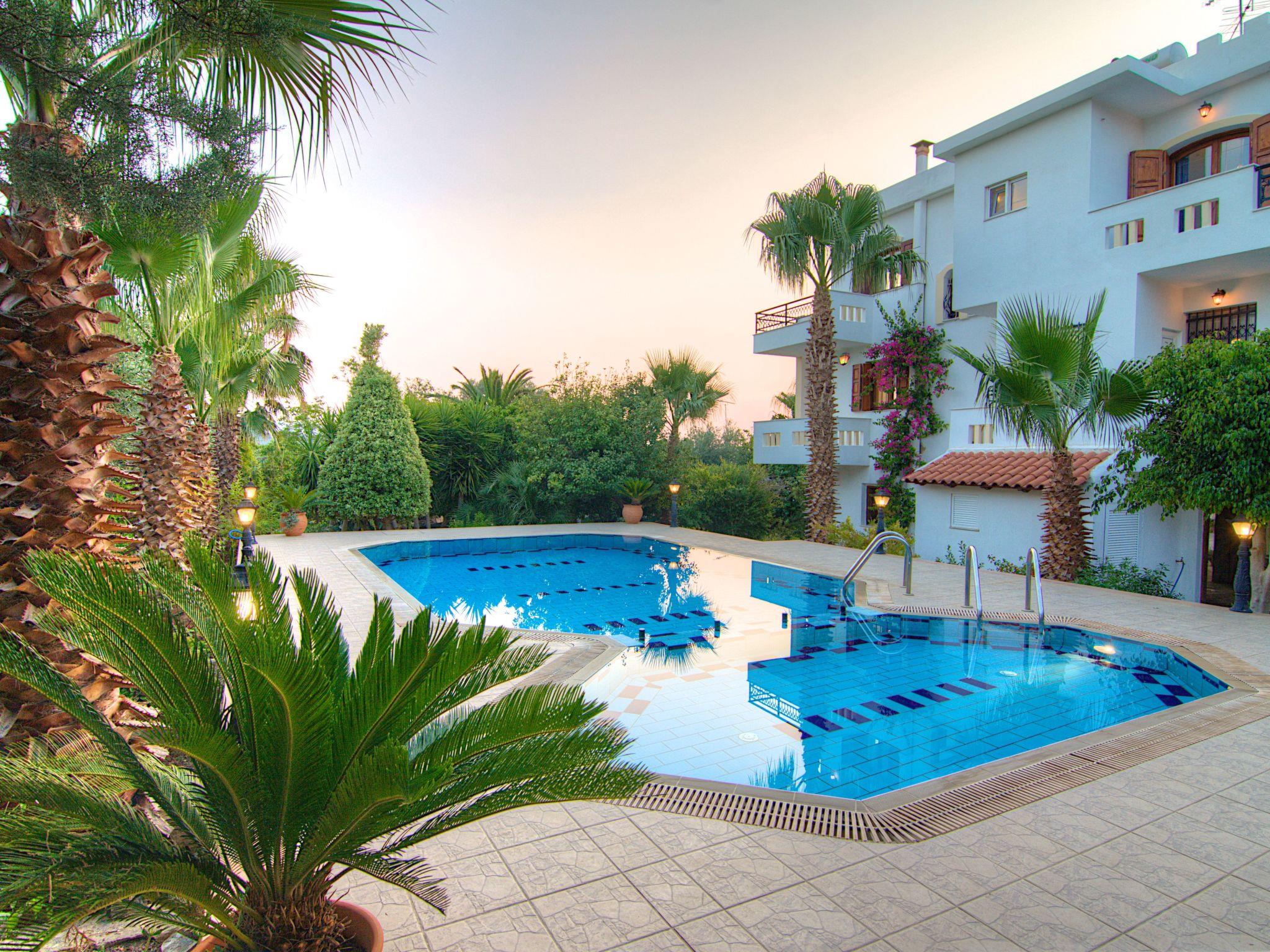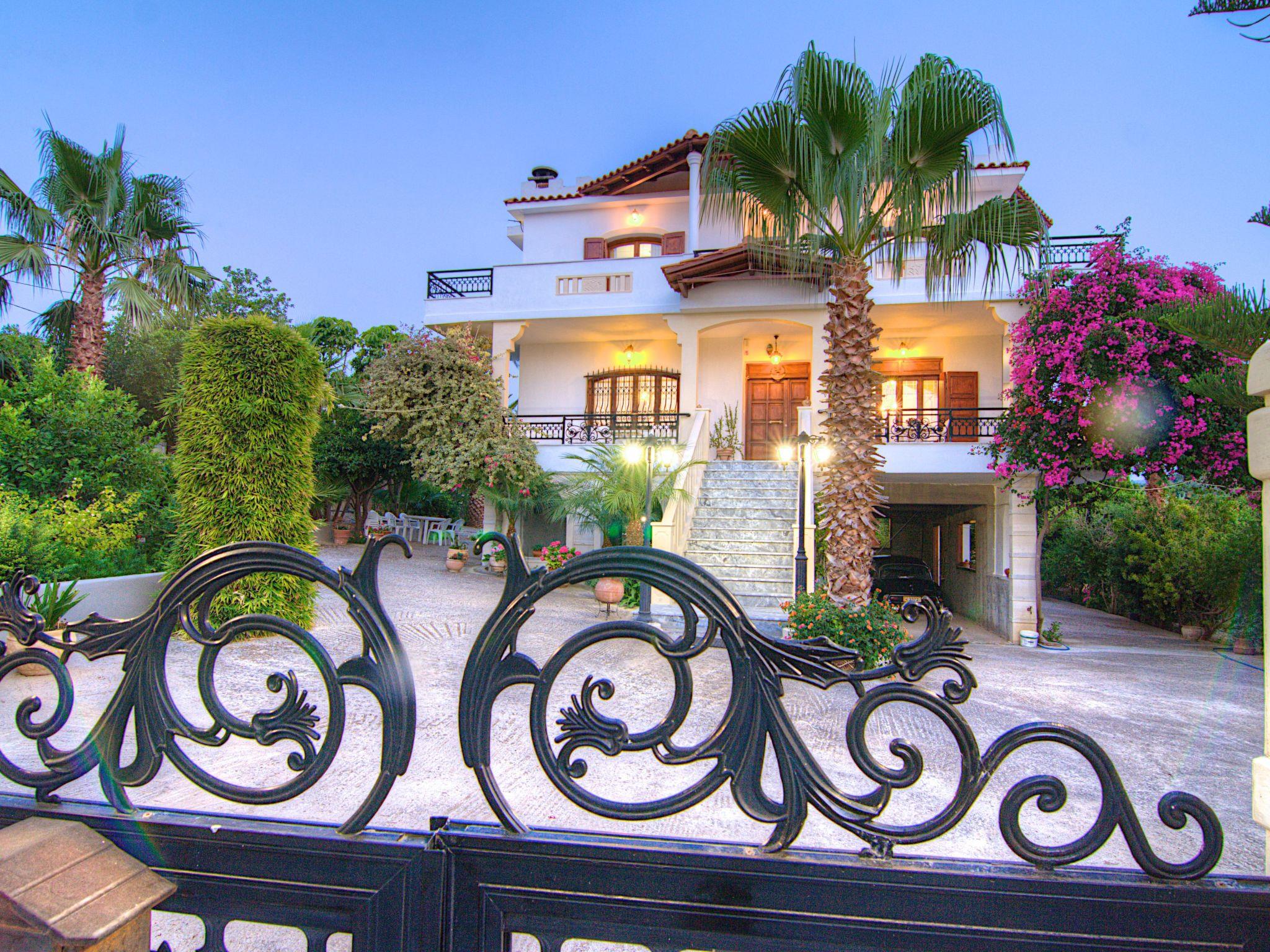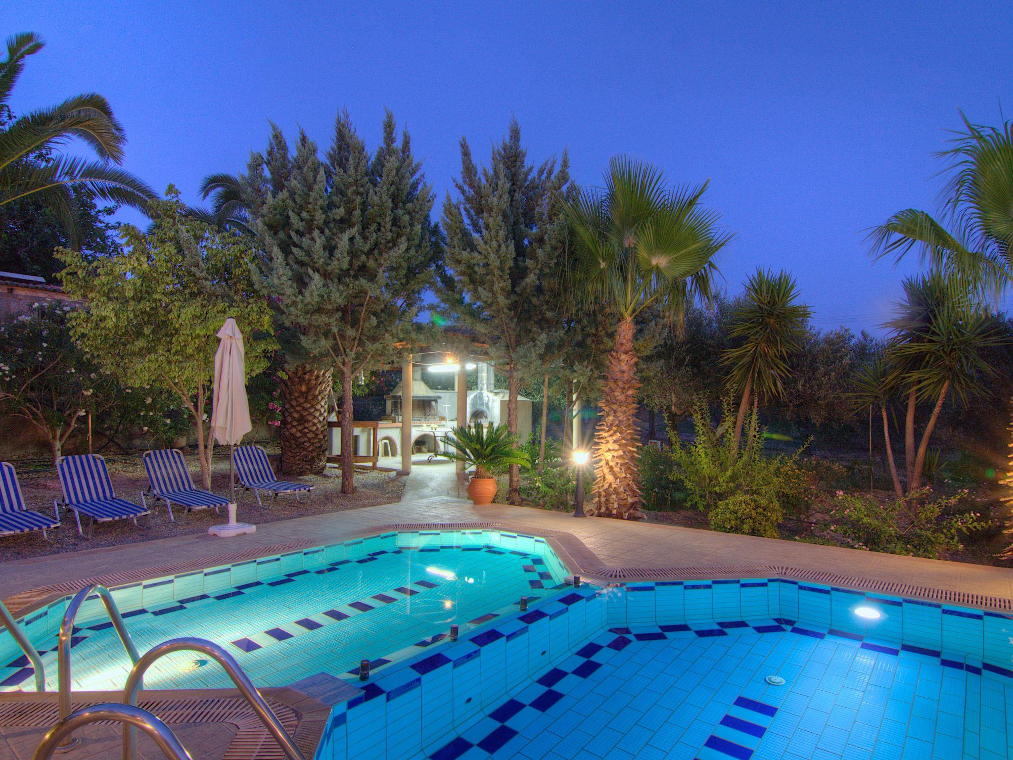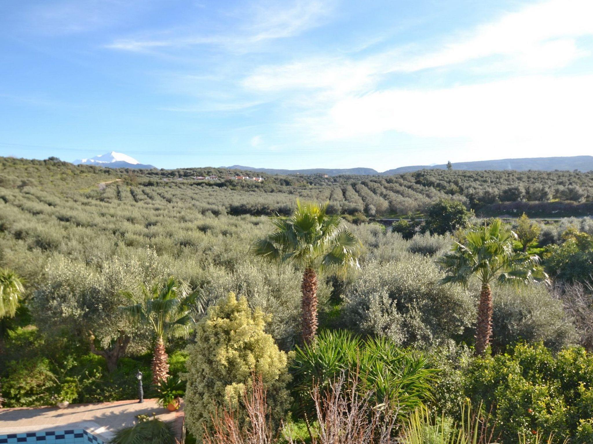 Von den Balkonen, die sich über beide Etagen erstrecken, haben Sie einen atemberaubenden Panoramablick auf die Berge von Psiloritis und Lefka Ori und die wunderschöne Landschaft der Umgebung. Ein üppiger Garten in einem 14.000 qm großen privaten Olivenhain, ein 45 qm großer privater Swimmingpool mit separatem Kinderbecken und ein angrenzender Grillplatz mit Steinofen befinden sich rund um das Villengelände. Das Grundstück der Villa ist eingezäunt und uneinsehbar.